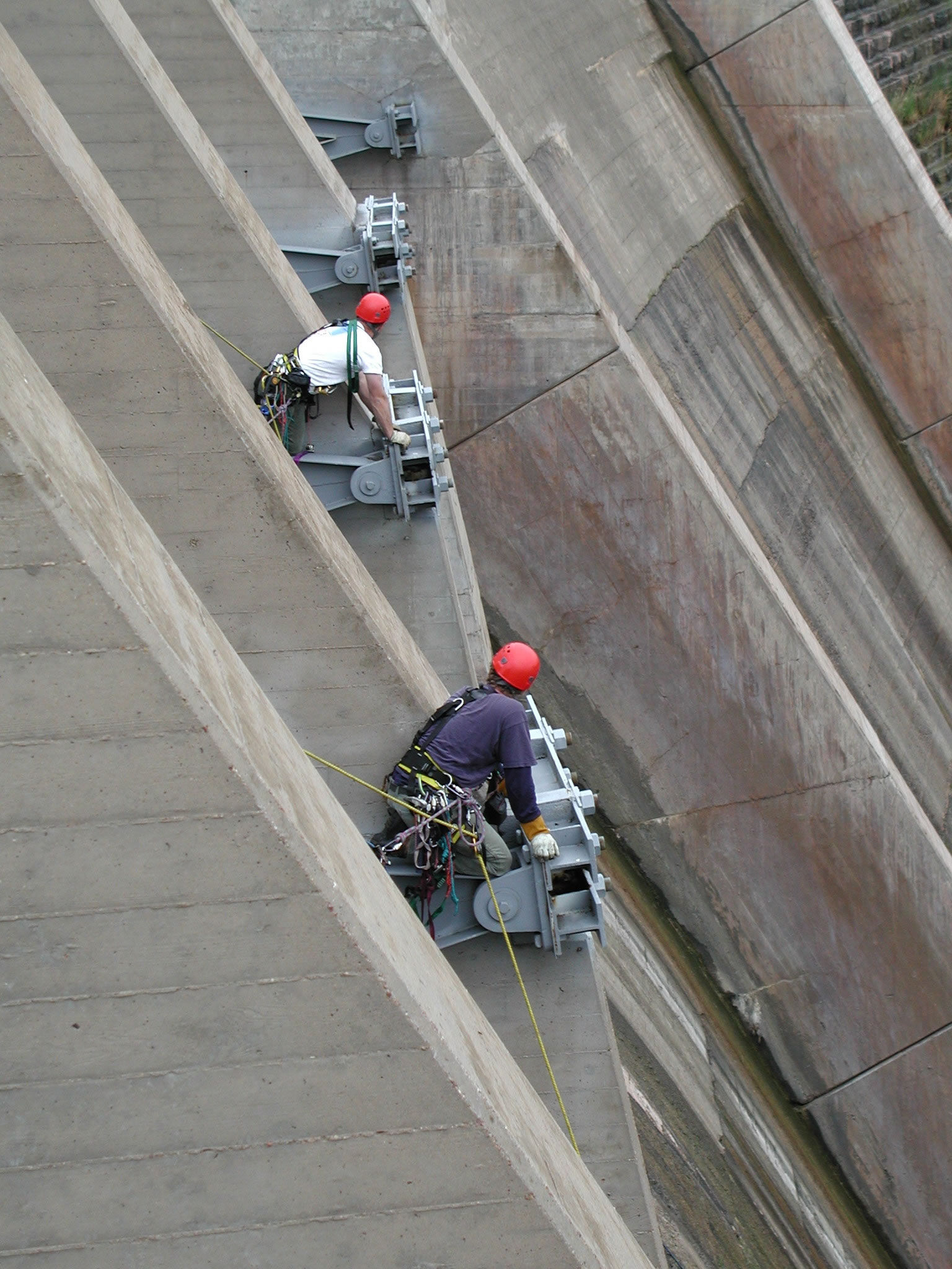 Engineers from the Great Plains Rope Access team inspect the radial gate trunnions on Altus Dam in Oklahoma. Photo by Steve Beason