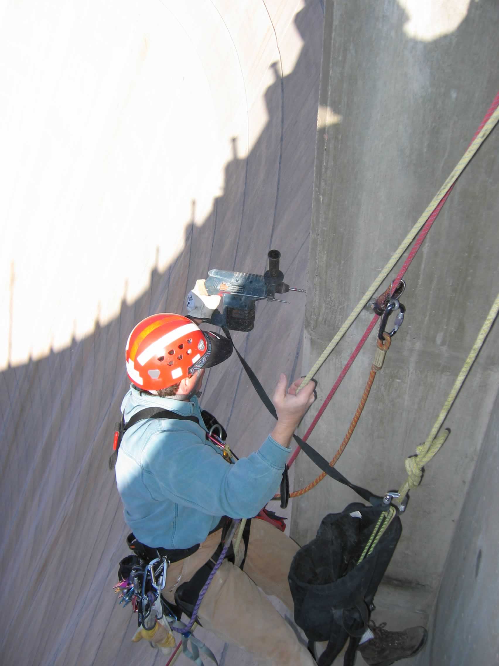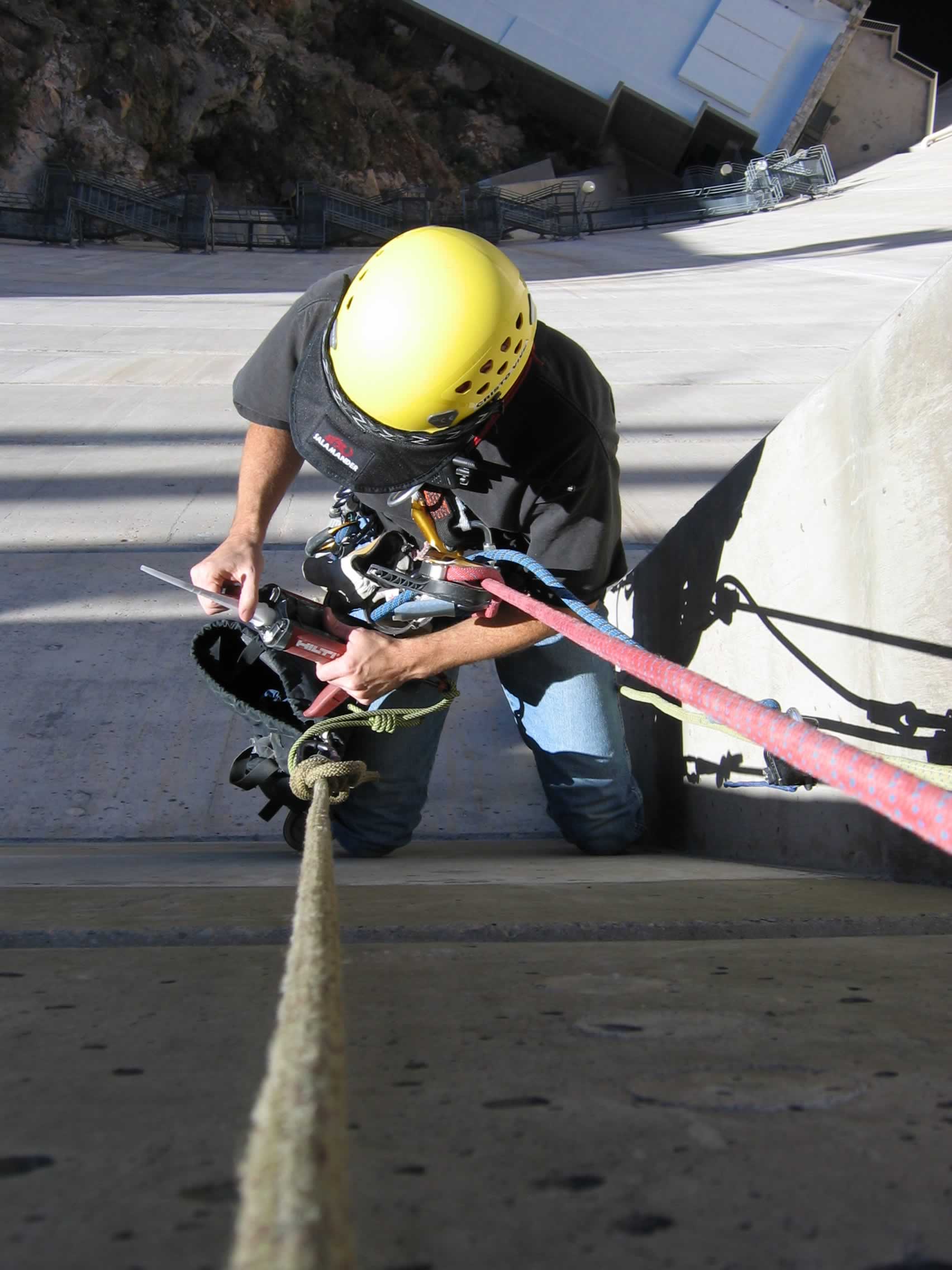 Steve Beason drills a hole in the downstream face of Roosevelt Dam in preparation for installing new survey prisms. Photo by Bill Bruninga.