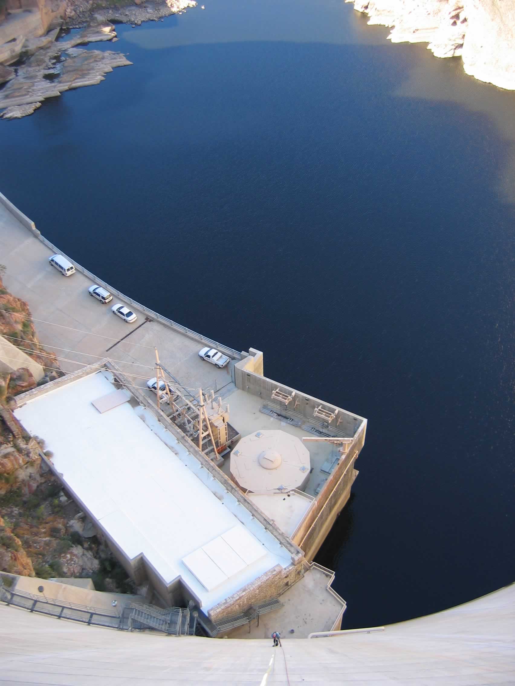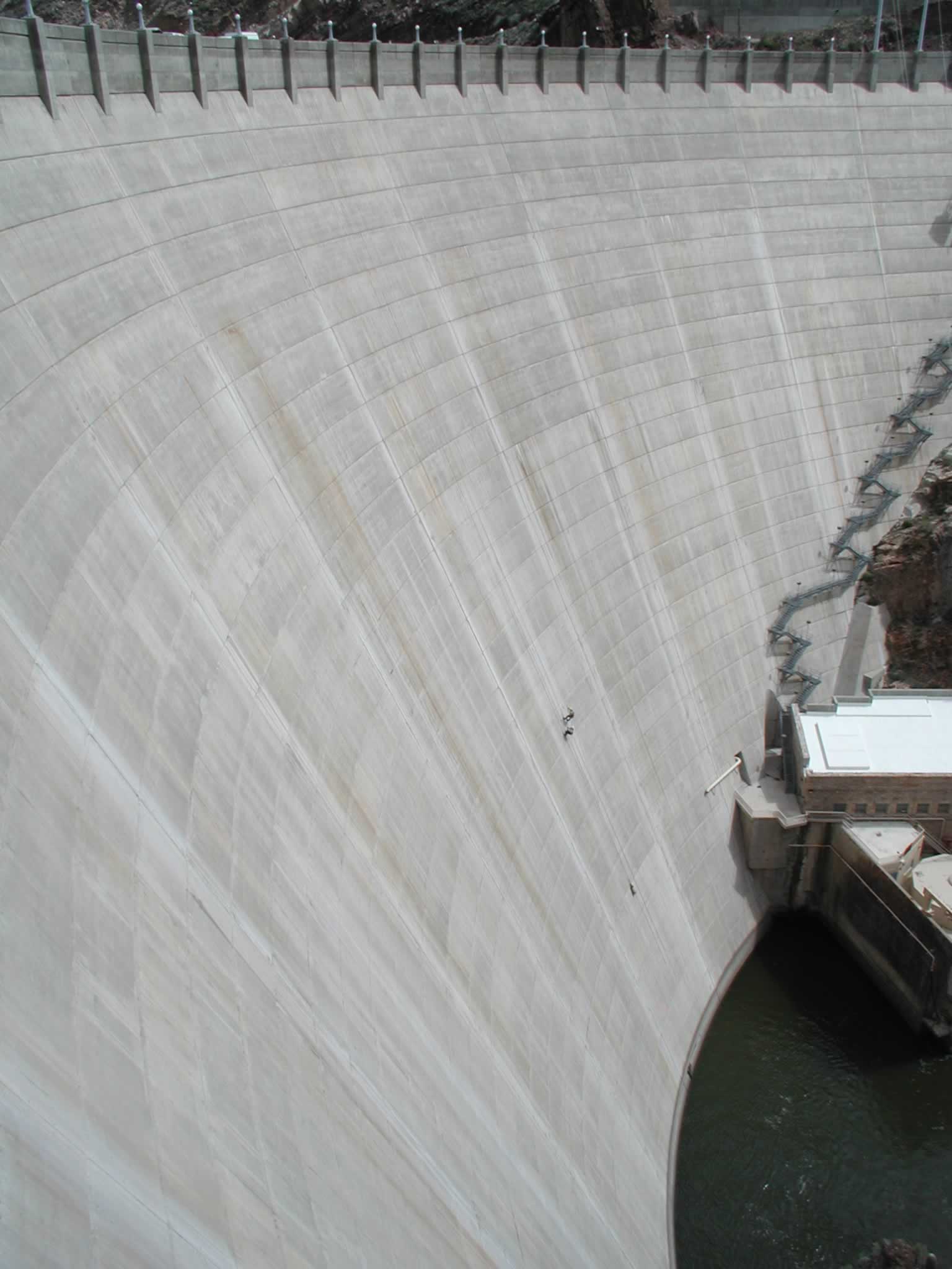 Scott Foster and Bill Bruninga replace defective survey prisms on the downstream face of Roosevelt Dam. Photo by Steve Beason