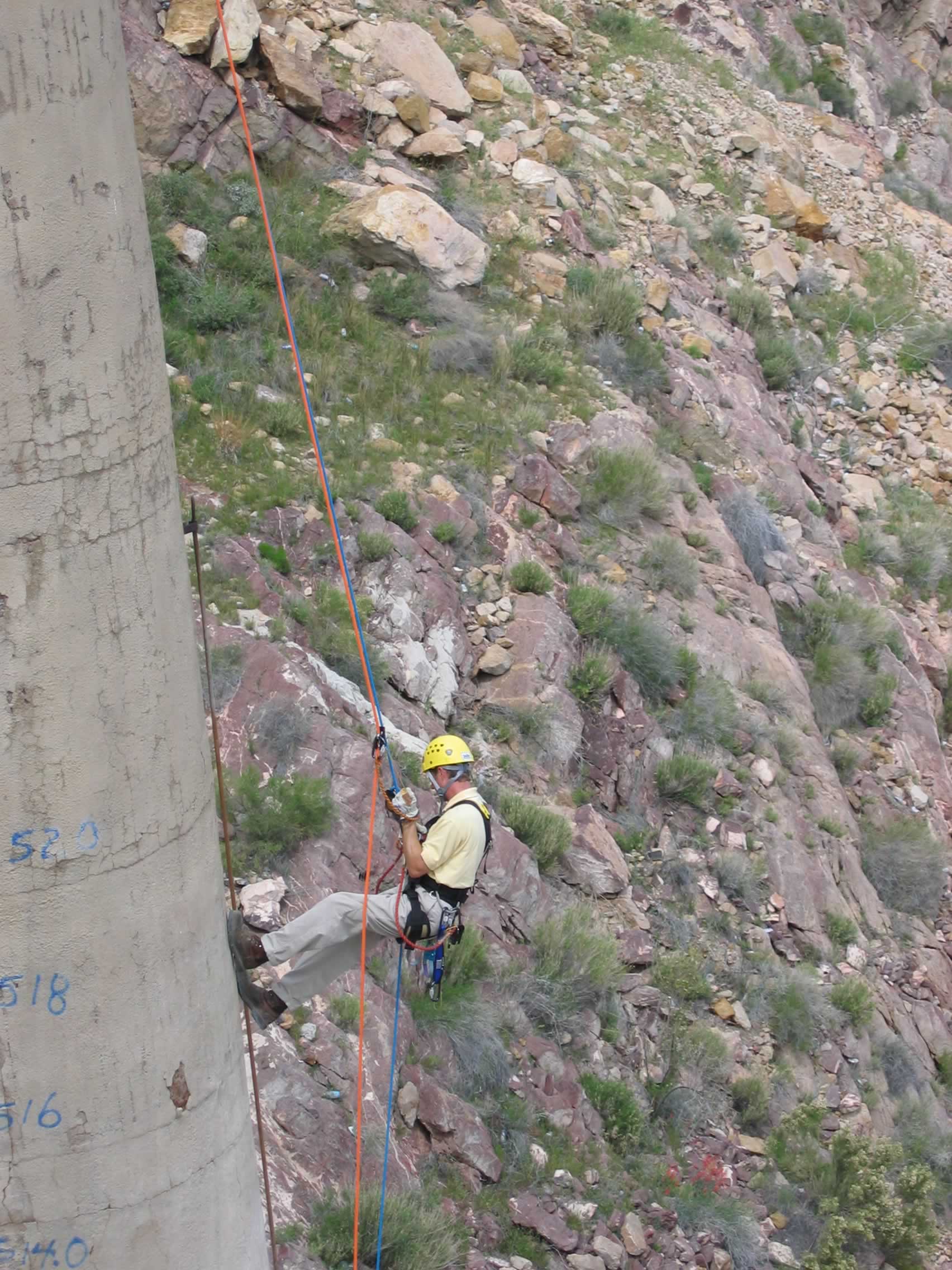 Pat McAlister descends the upstream face of the right abutment spillway piers at Coolidge Dam in eastern Arizona as part of the inspection of the upstream face of the dam. Photo by Steve Beason