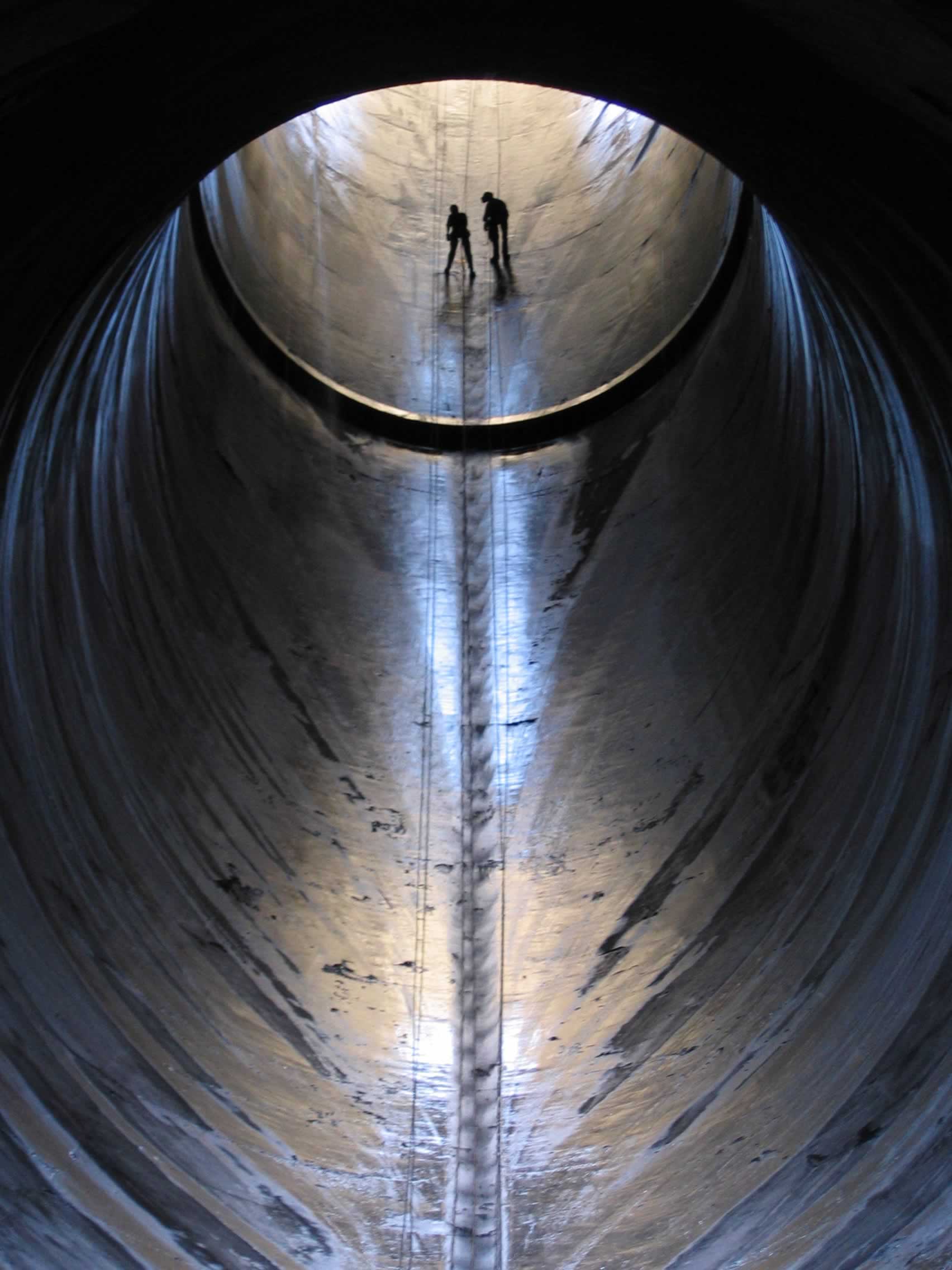 Al Graves and Fred Stanek descend in the Nevada spillway tunnel at Hoover Dam for an inspection of the concrete lining. Photo by Steve Beason