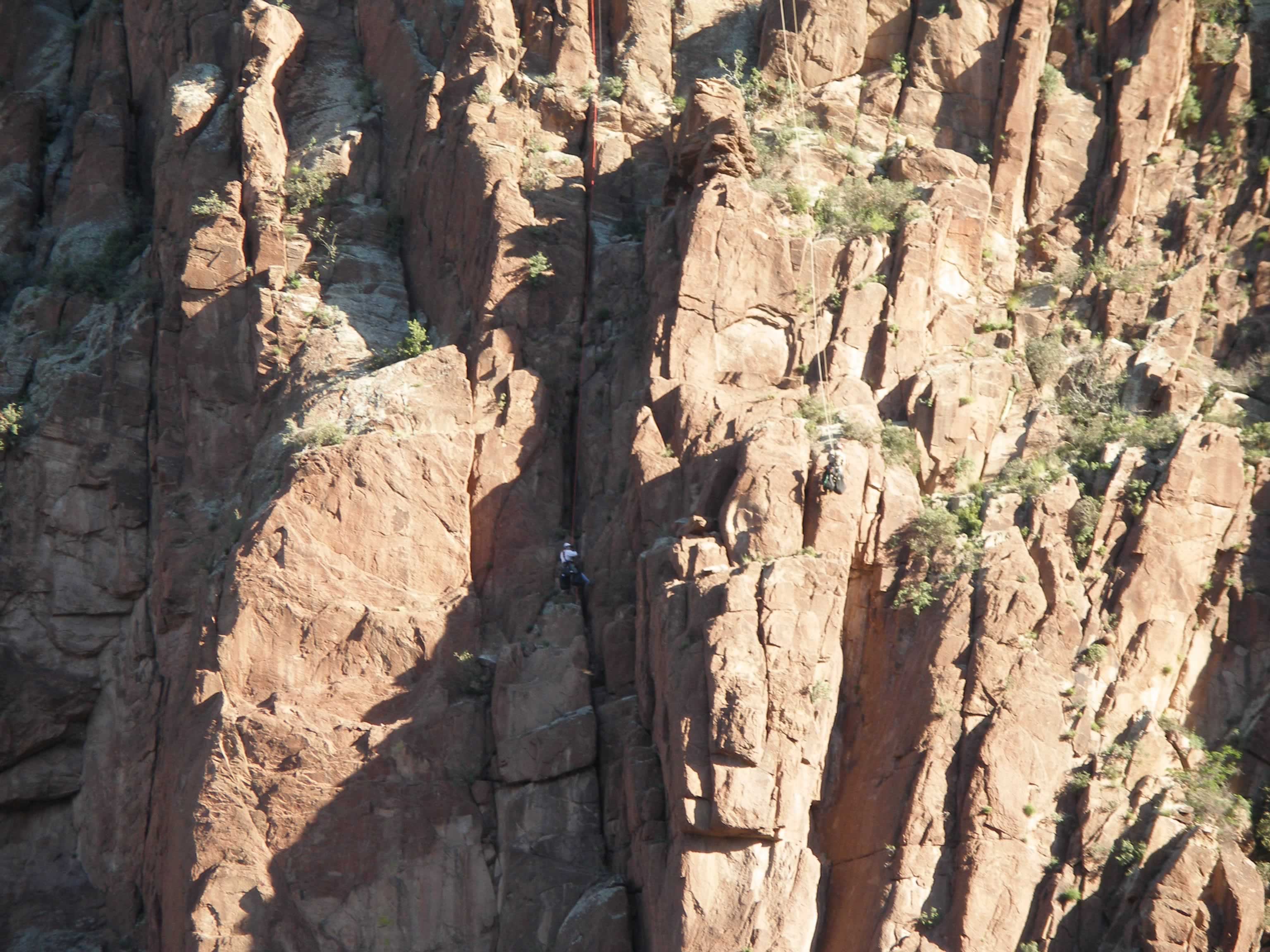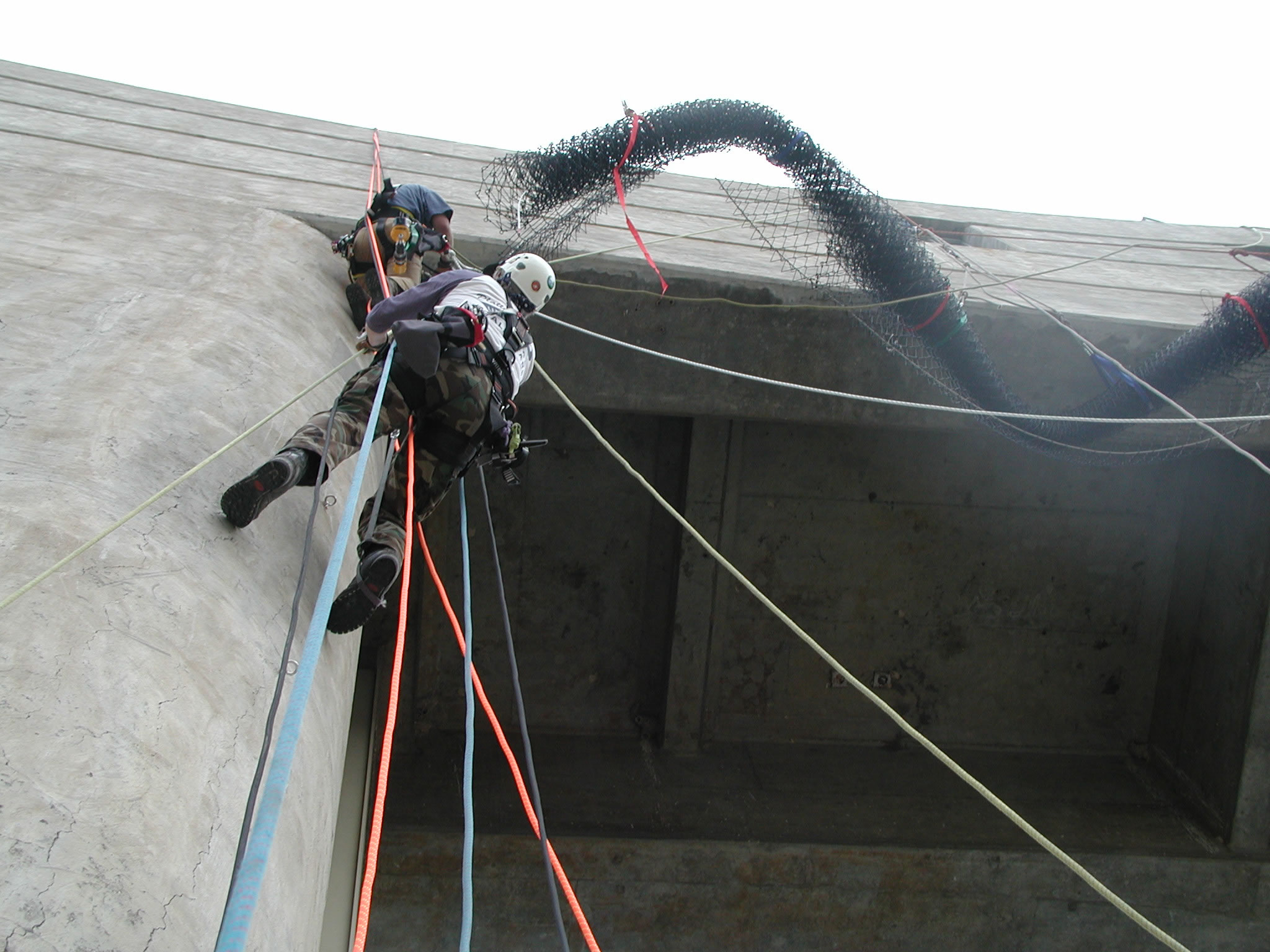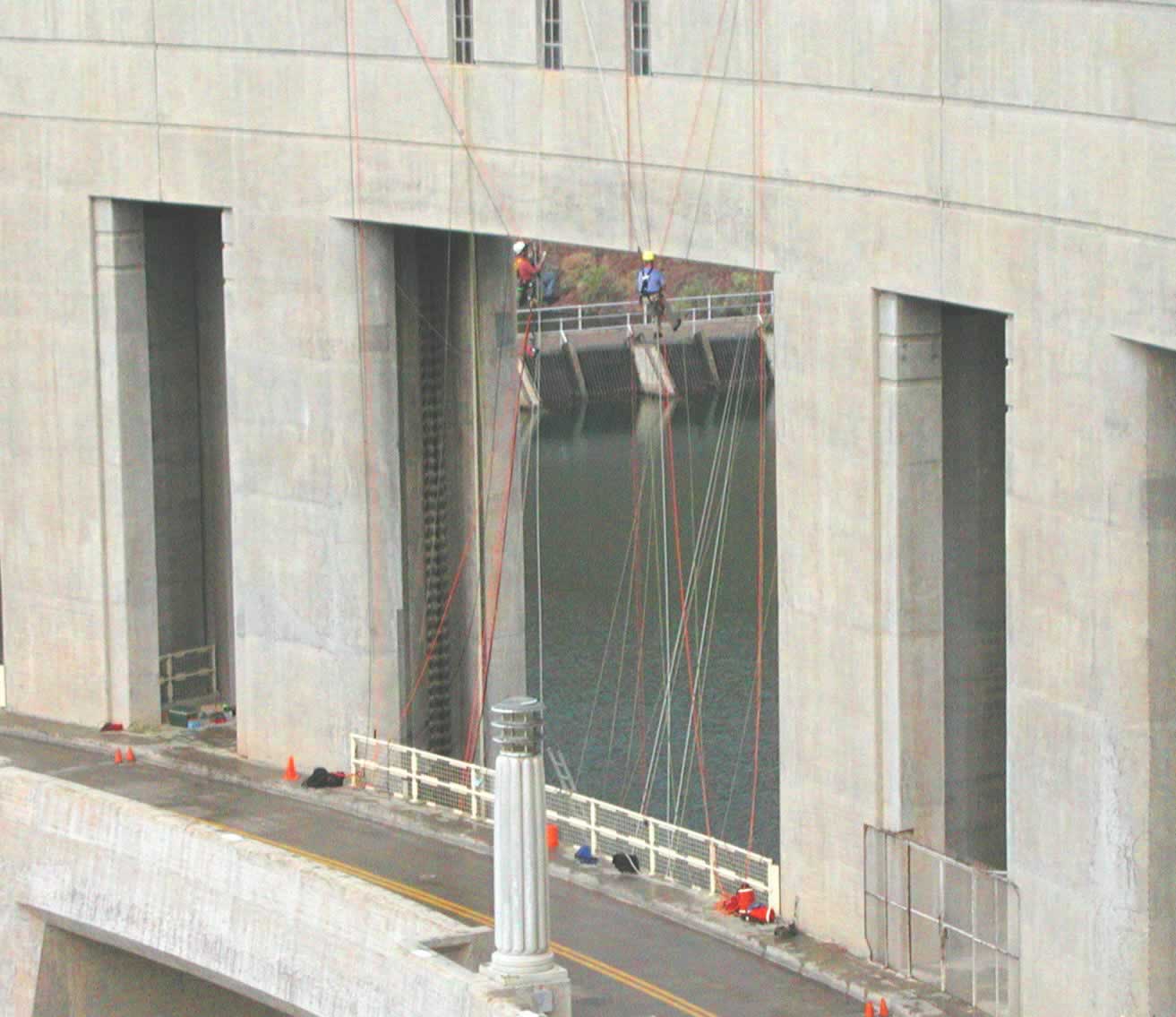 Al Graves, civil engineer with the Lower Colorado Rope Access Team ascends to the top of the gate opening on Parker Dam on the Colorado River to secure high-strength wire mesh to the superstructure. Photo by Steve Beason