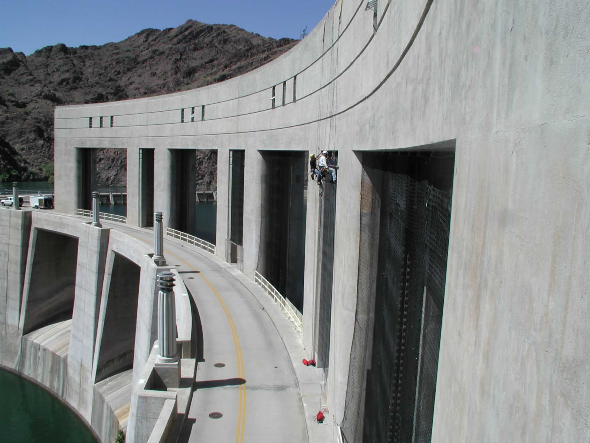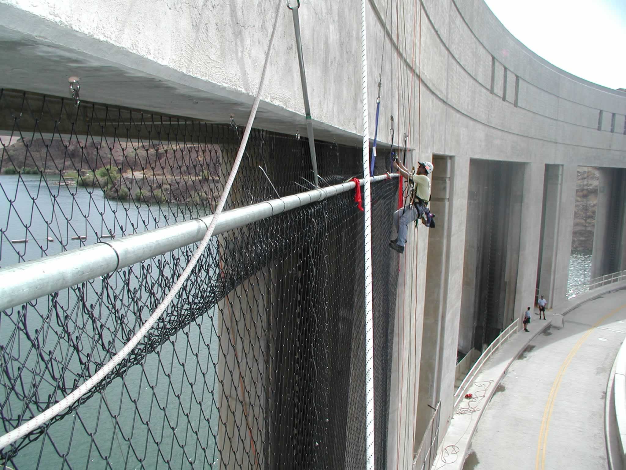 Rodney Tang, Civil engineer with the Lower Colorado Rope Access Team works to secure high-strength wire mesh to the superstructure of Parker Dam on the Colorado River. Photo by Steve Beason