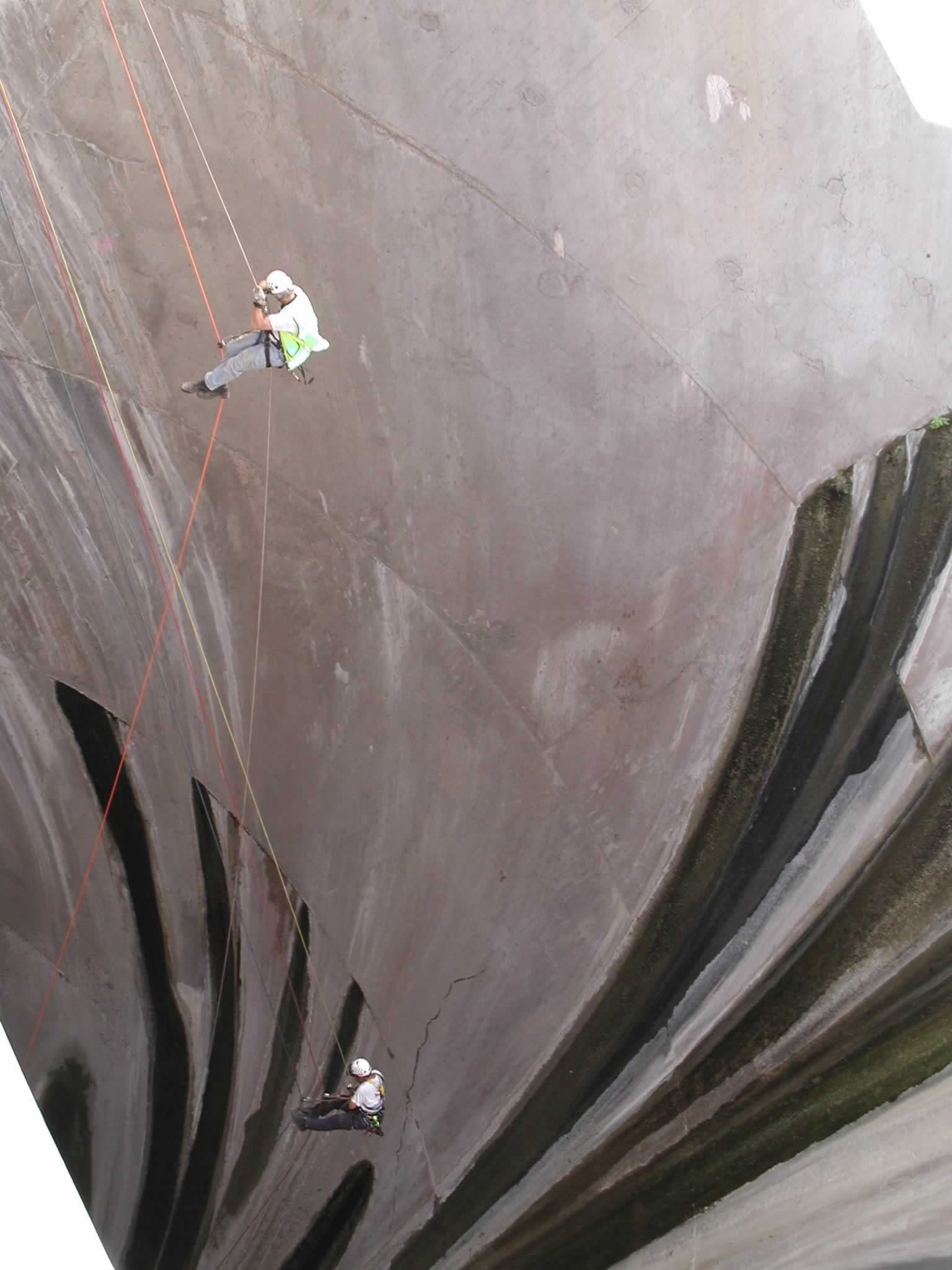 Robert Owens – mechanical engineer with the Lower Colorado Rope Access Team performs an inspection of a radial gate trunnion on Horse Mesa Dam, on the Salt River Project. Photo by Steve Beason
