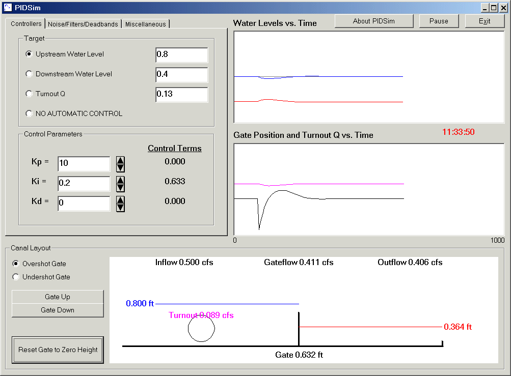 PIDSim is an educational simulator for examining the behavior of PID control applied to canal check gates. The programs algorithms contain many gross assumptions, so the software is not suitable for actual design of controllers.