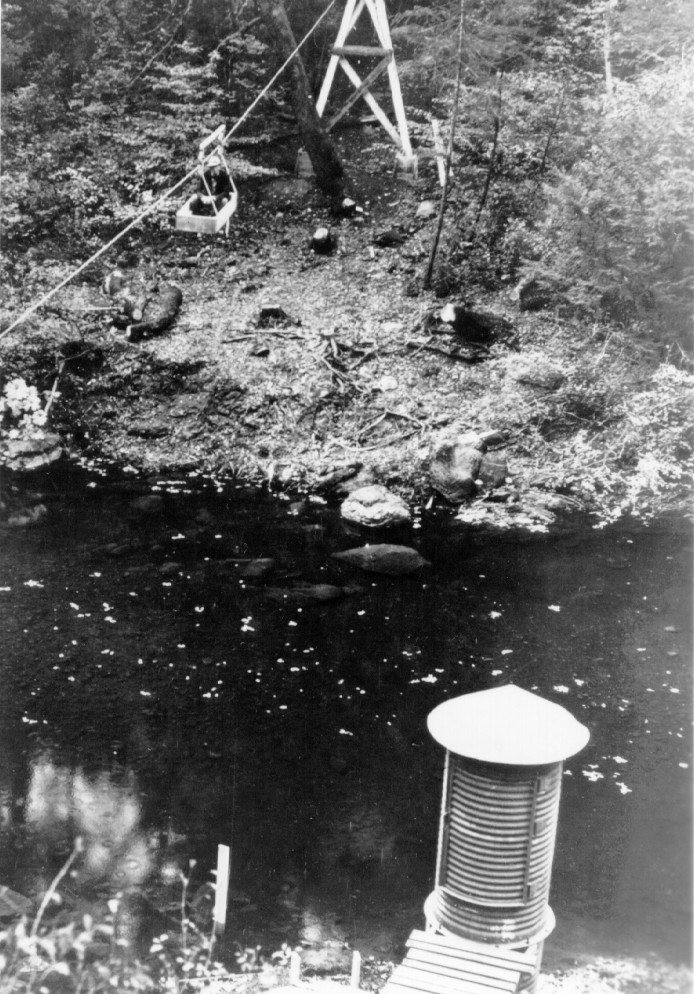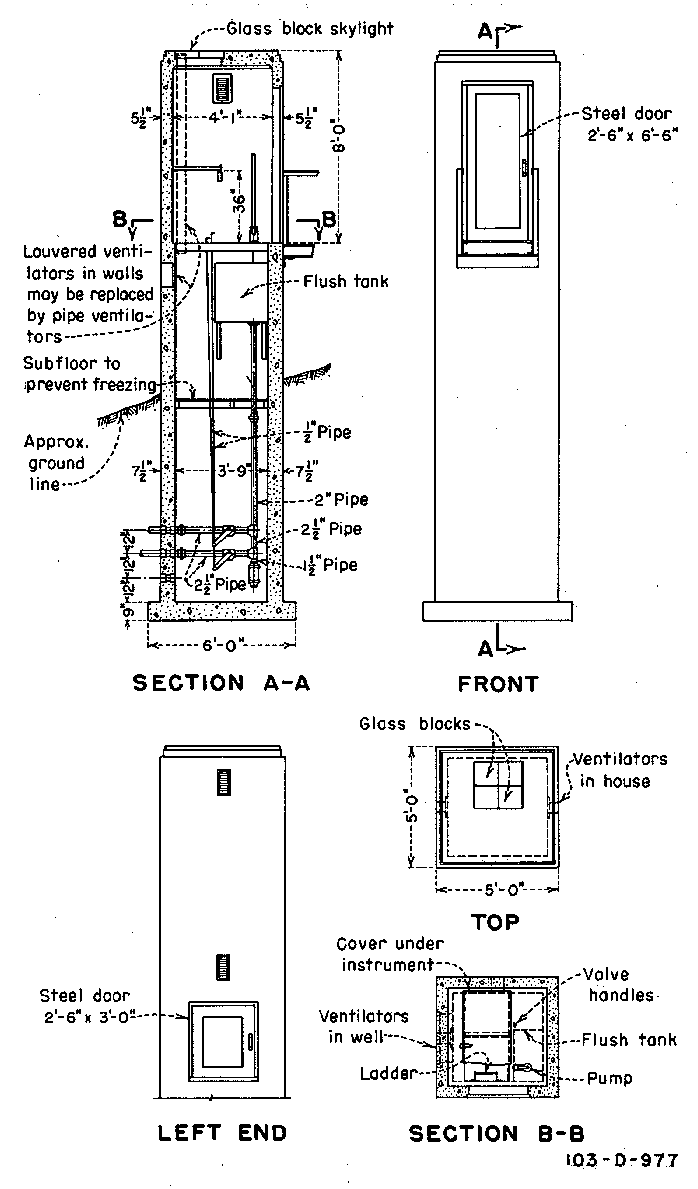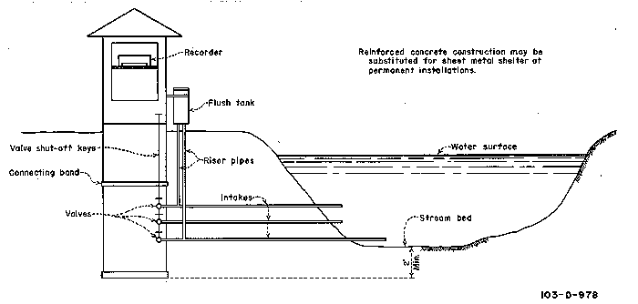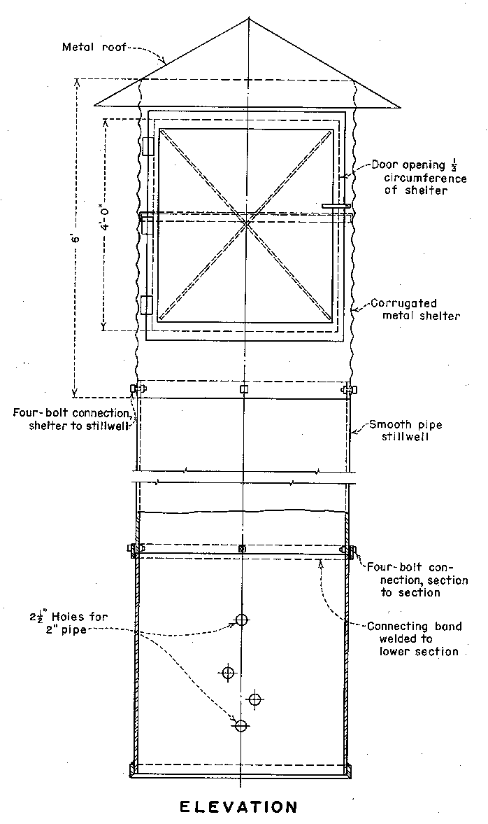 Figures 6-9 and 6-10 show designs of typical installations of a more permanent nature. Installation cost is an important consideration in the selection of a structure. Shelters often become attractive targets for firearms, so higher initial costs of permanent installations may be offset by savings in undamaged equipment and complete records. Figure 6-11 shows a current meter gaging station with cable, car, corrugated steel shelter house, and stilling well.