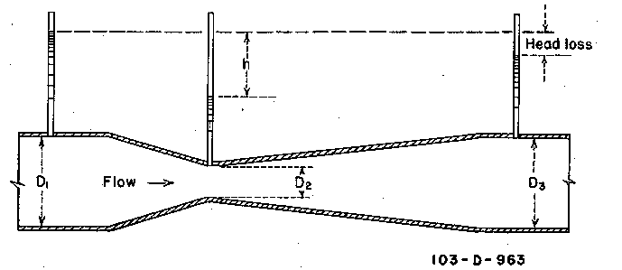 Venturi meters (figure 14-2) are one of the most accurate type of flow measuring device that can be used in a water supply system. They contain no moving parts, require very little maintenance, and cause very little head loss. Tables or diagrams of the head difference versus rate of flow may be prepared, and flow indicators or flow recorders may be used to display the differential or rate of flow. Venturi meters are often used in the laboratory to calibrate other closed conduit flow measuring devices.