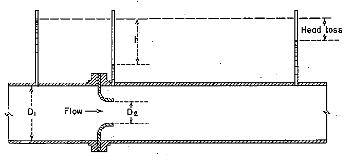 This class of flowmeters includes venturi, nozzle, and orifice meters. When properly installed and used, these meters have a potential accuracy of "1 percent. These meters have no moving parts but use the principle of accelerating flow by some form of constriction. Heads are measured upstream where the meter is the size of the approach pipe and downstream where the area is reduced to a minimum. The basic energy balance relationship is written as discussed in chapter 2. The velocity at one of these locations is solved for in terms of the difference of head between the two locations. Using the product of the upstream velocity and area results in discharge expressed as:
