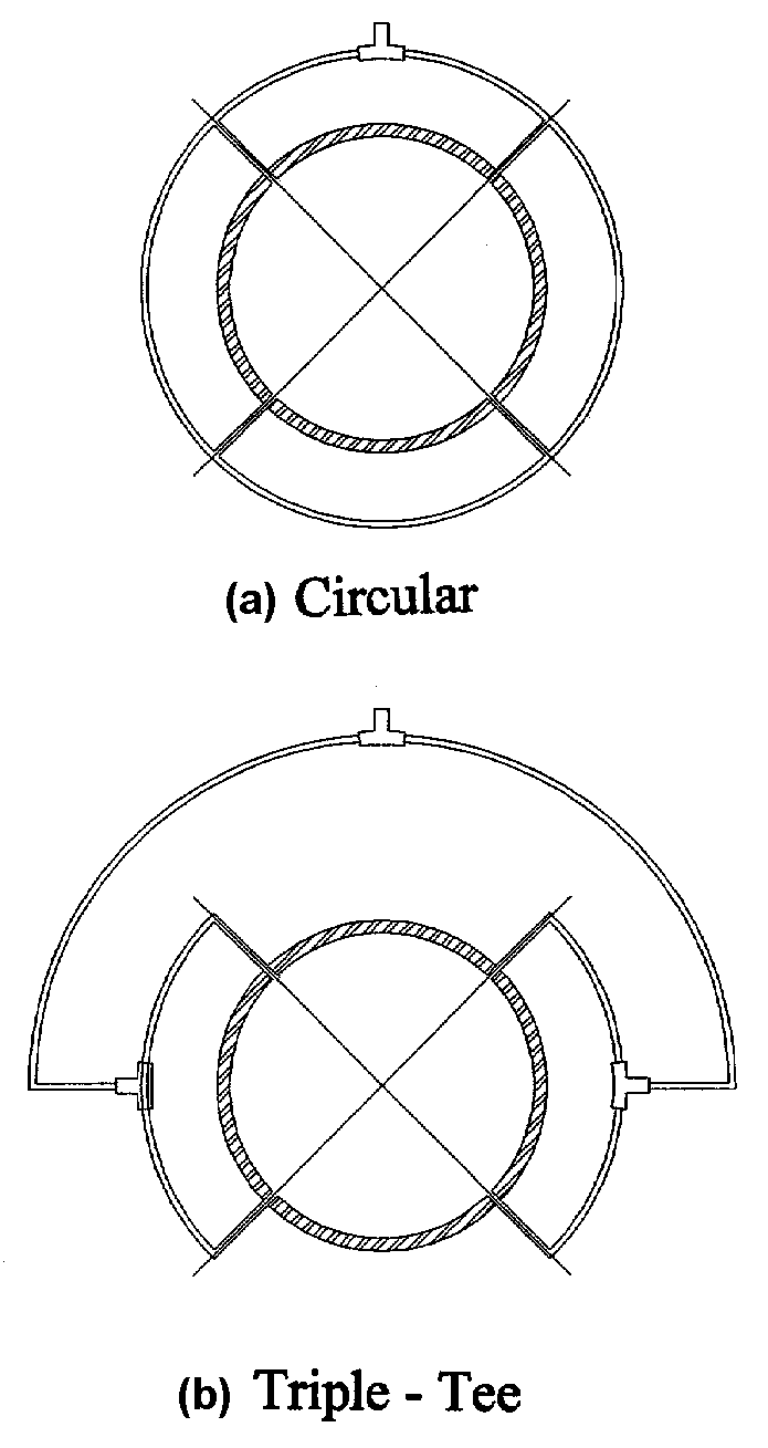 Sometimes, to obtain a better average pressure reading, four taps around the pipe are manifolded. If unbalanced pressure exists because of velocity distribution, error can be introduced by flow circulation in the manifolding tubing. Two forms of manifolding are shown on figure 5-10. The commonly seen case (a)-circular form-causes circulation errors. Case (b) is the triple tee system, designed to minimize circulation errors. Large tube diameter relative to piezometer hole diameter through the meter wall will reduce circulation error considerably for both cases.