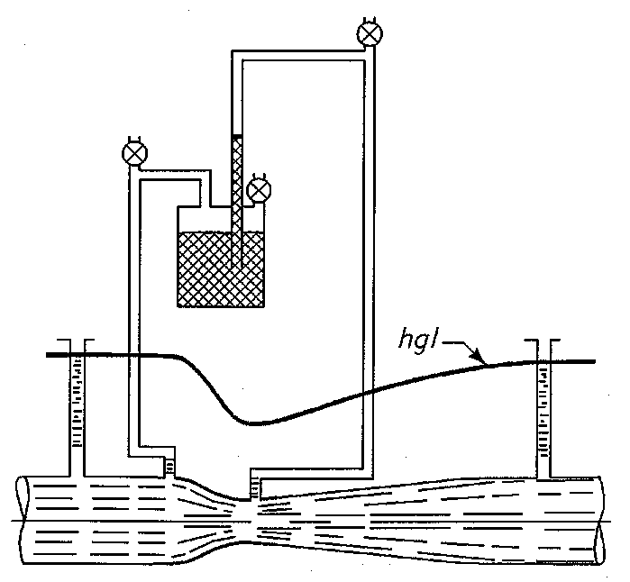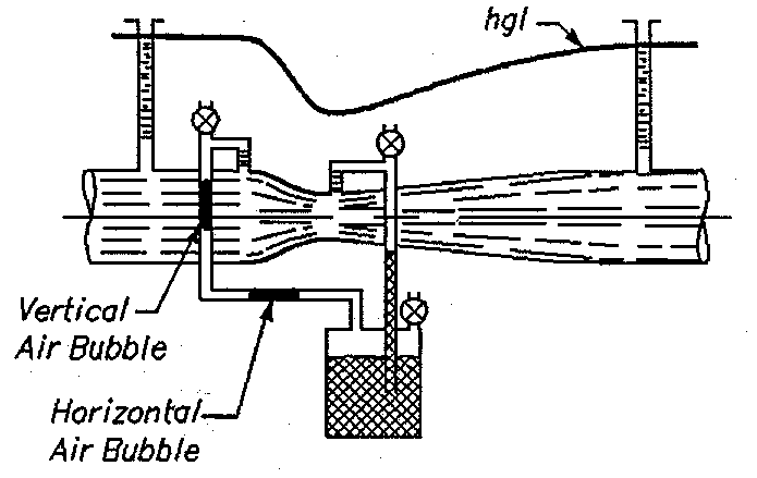 Frequently, pressure taps are connected to manometers and Utubes (figure 5-11), and air trapped in the tubing can cause large errors. Air travels in bubbles that tend to rise and form large air blockages. Thus, piezometers should not be connected at the top of a pipe. Even with taps on the side, air will come out of solution as water warms. Air in the vertical parts of the tubing causes large errors. Although air in horizontal parts of the tubing does not cause error, a bubble will likely move to a vertical part of the tubing when flow increases or decreases. For bleeding air, flowmeters should be placed at locations where the pipelines are under positive pressure; that is, where the hydraulic grade line is well above the pipe and manometry system as shown on figure 5-11.