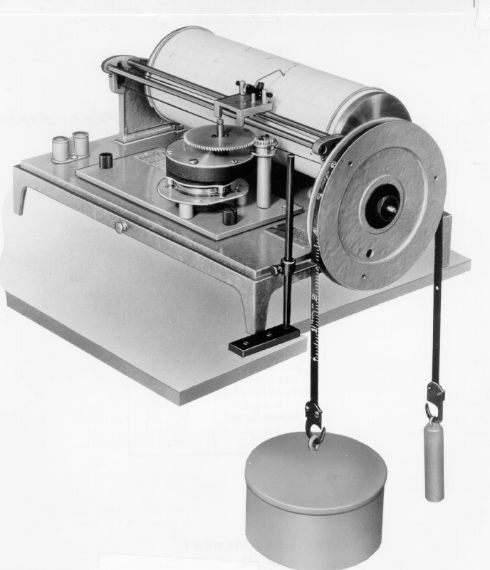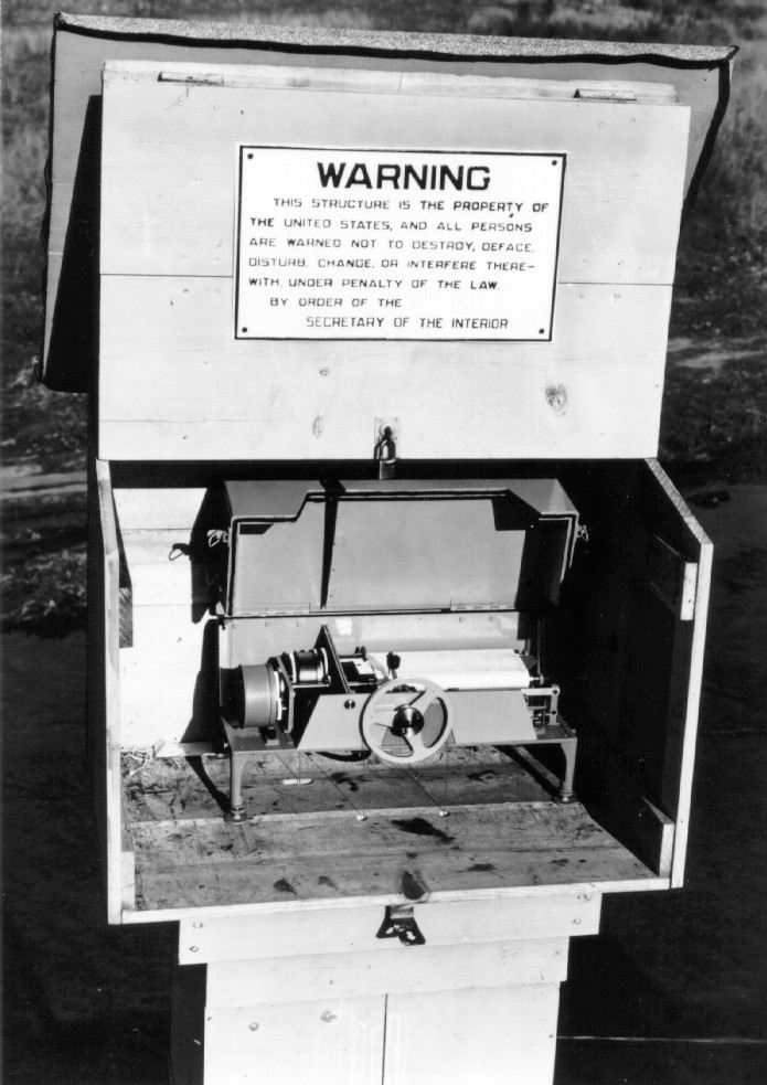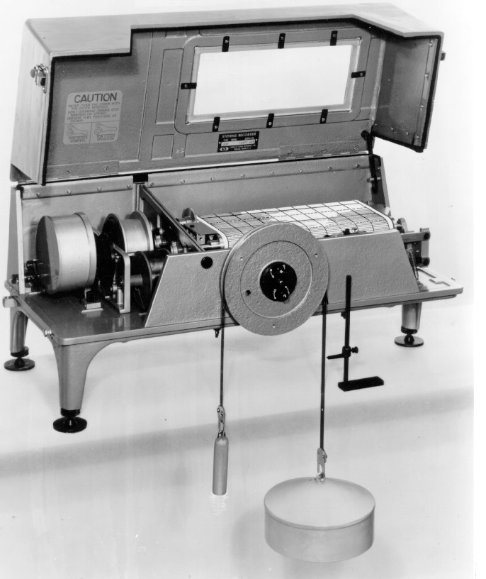 These types of recorders usually operate using 8-day, spring-driven clocks. Electrical drives could also be used if a reliable source were readily available. The stylus, usually either a capillary pen or a pencil of proper hardness, must be capable of operation for the full 8 days without attention. To accommodate various water-stage differentials, ratios of water-stage change to recorder-chart change are available from 1:1 to 10:1 and should be specified at the time the recorder is ordered. The standard width of recorder paper is 10 inches (in), and all recorders come equipped with metal covers.