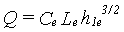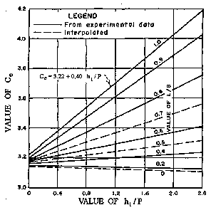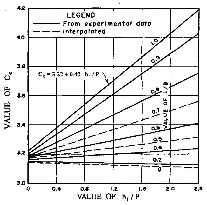 The effective coefficient of discharge, Ce, includes effects of relative depth and relative width of the approach channel. Thus, Ce is a function of h1/p and L/B, and values of Ce may be obtained from the family of curves presented on figure 7-5. p is the vertical distance from the weir crest to the approach pool invert.