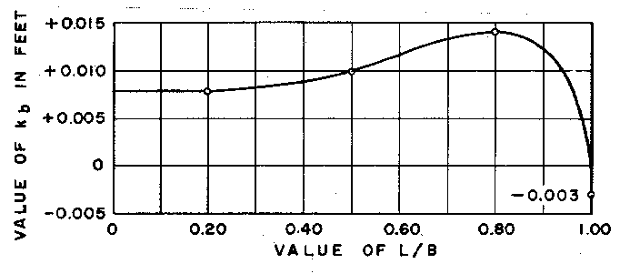 The factor kb changes with different ratios of crest length, L, to average width of approach channel, B. Values of kb for ratios of L/B from 0 to 1 are given on figure 7-4. The factor kh is a constant value equal to 0.003 ft.