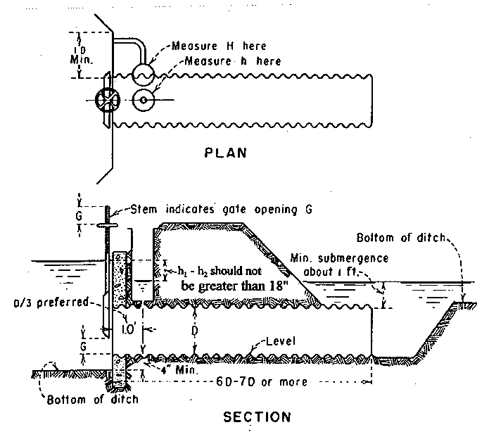 Low head wall submergence over the meter gate entrance can also result in discharge errors, particularly at gate openings greater than 75 percent. Considerable error results when the head is less than one pipe diameter above the top of the pipe. Sufficient submergence must also occur at the downstream end of the conduit to ensure that the conduit flows full and that a readable water surface is present in the downstream stilling well, which will usually require at least 1 ft of water depth above the pipe crown. This amount of submergence will normally prevent scour damage downstream in earthen ditches.