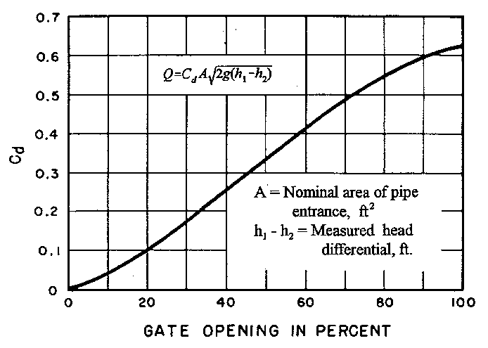 It should be noted that the coefficient Cd is used with A, which is the area of the pipe and not the gate opening. Discharges may be computed from this equation with an accuracy of +/-2.5 percent. The degree of downstream submergence does not affect the accuracy of the meter if water rises sufficiently in the downstream well to obtain an accurate reading and the pipe runs full at the outlet.