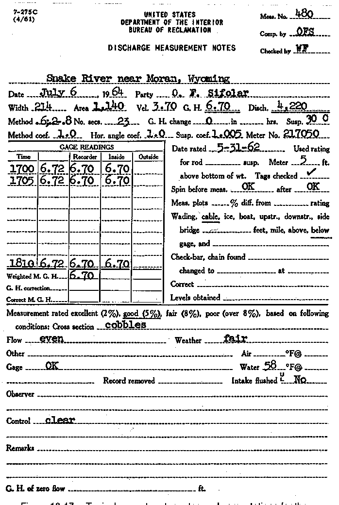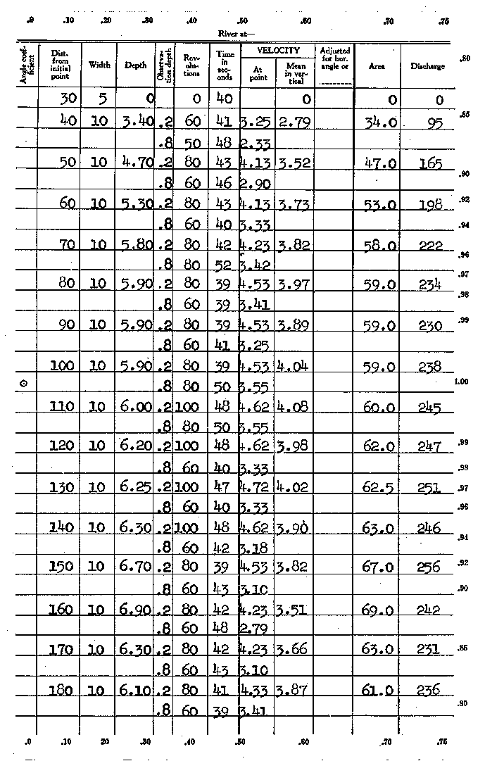 Typical discharge computations obtained by the midsection method, equation 10-5, are illustrated on figure 10-17. Velocities were taken from the current-meter rating table on figure 10-8.
