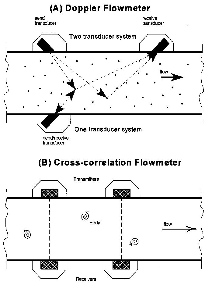 The Doppler flowmeter measures the velocity of particles moving with the flowing fluid (figure 11-2a). Acoustic signals of known frequency are transmitted, reflected from particles, and are picked up by a receiver. The received signals are analyzed for frequency shifts (changes), and the resulting mean value of the frequency shifts can be directly related to the mean velocity of the particles moving with the fluid. System electronics are used to reject stray signals and correct for frequency changes caused by the pipe wall or transducer protective material. Doppler flowmeter performance is highly dependent on physical properties such as the liquid's sonic conductivity, particle density, and flow profile. Likewise, nonuniformity of particle distribution in the pipe cross section results in a computed mean velocity that is incorrectly weighted. Therefore, the meter accuracy is sensitive to velocity profile variations and to distribution of acoustic reflectors in the measurement section. Unlike other acoustic flowmeters, Doppler meters are affected by changes in the liquid's sonic velocity. As a result, the meter is sensitive to changes in density and temperature. These problems make Doppler flowmeters unsuitable for highly accurate measurements.