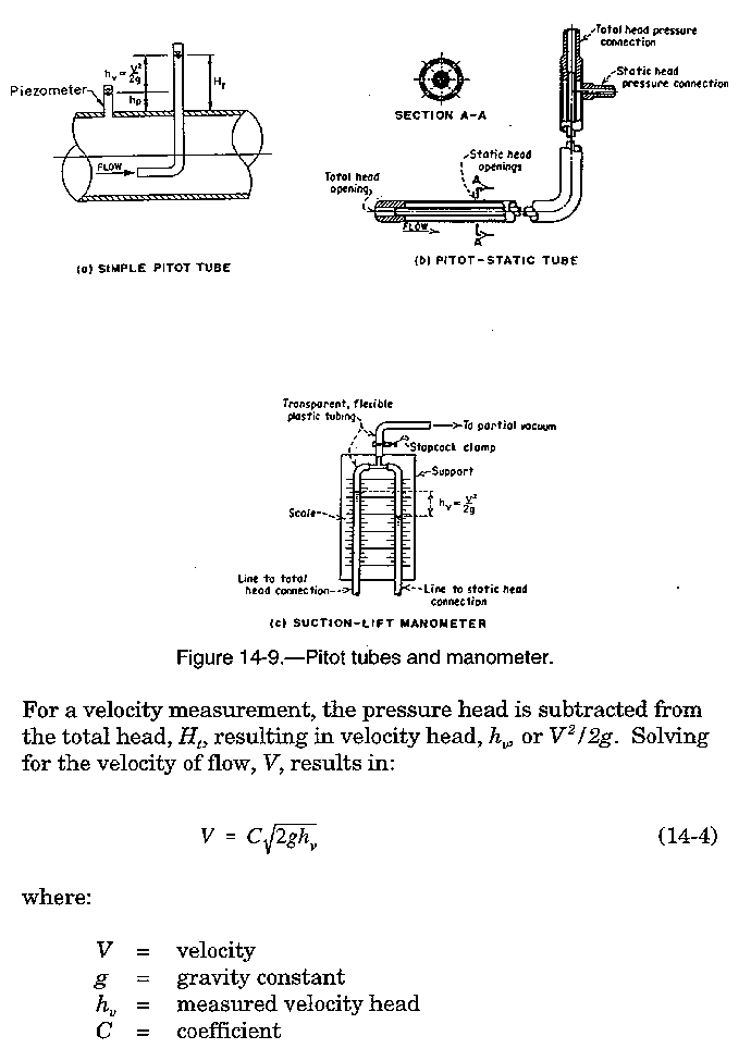 For a velocity measurement, the pressure head is subtracted from the total head, Ht, resulting in velocity head, hv, or V 2/2g. Solving for the velocity of flow, V, results in: