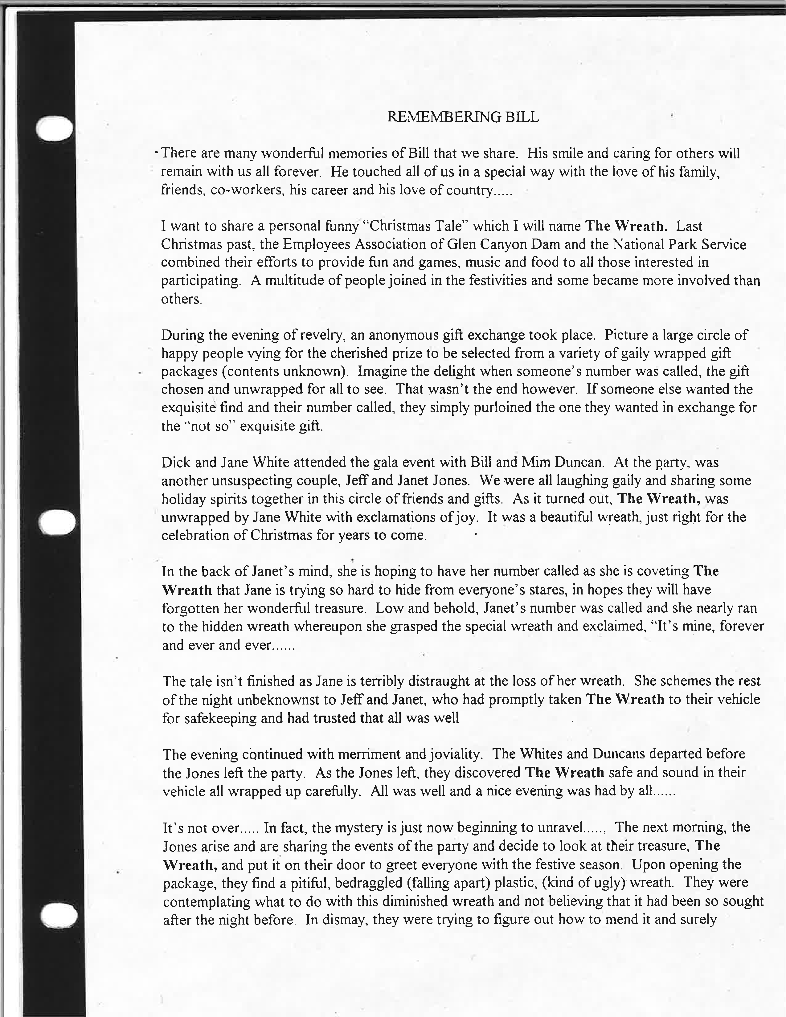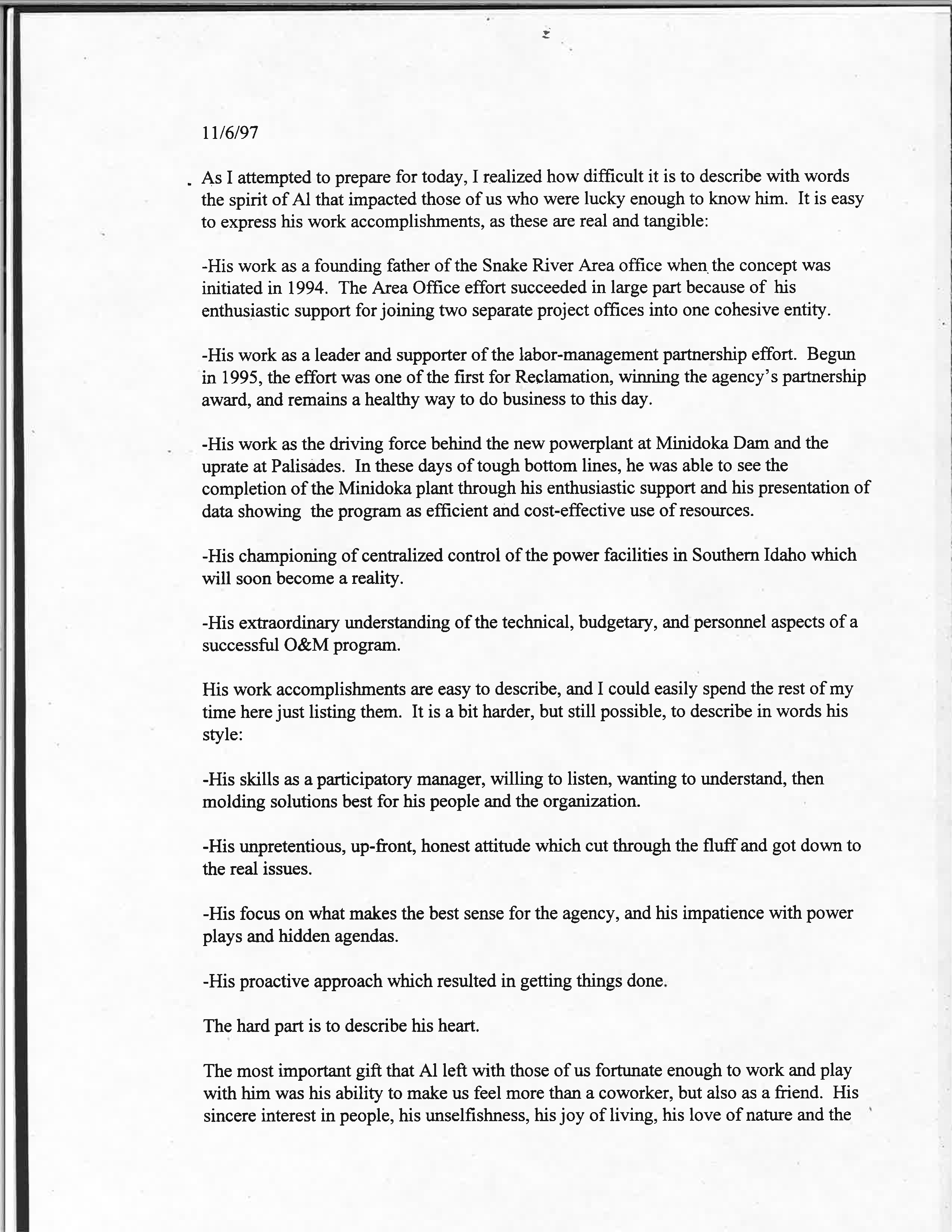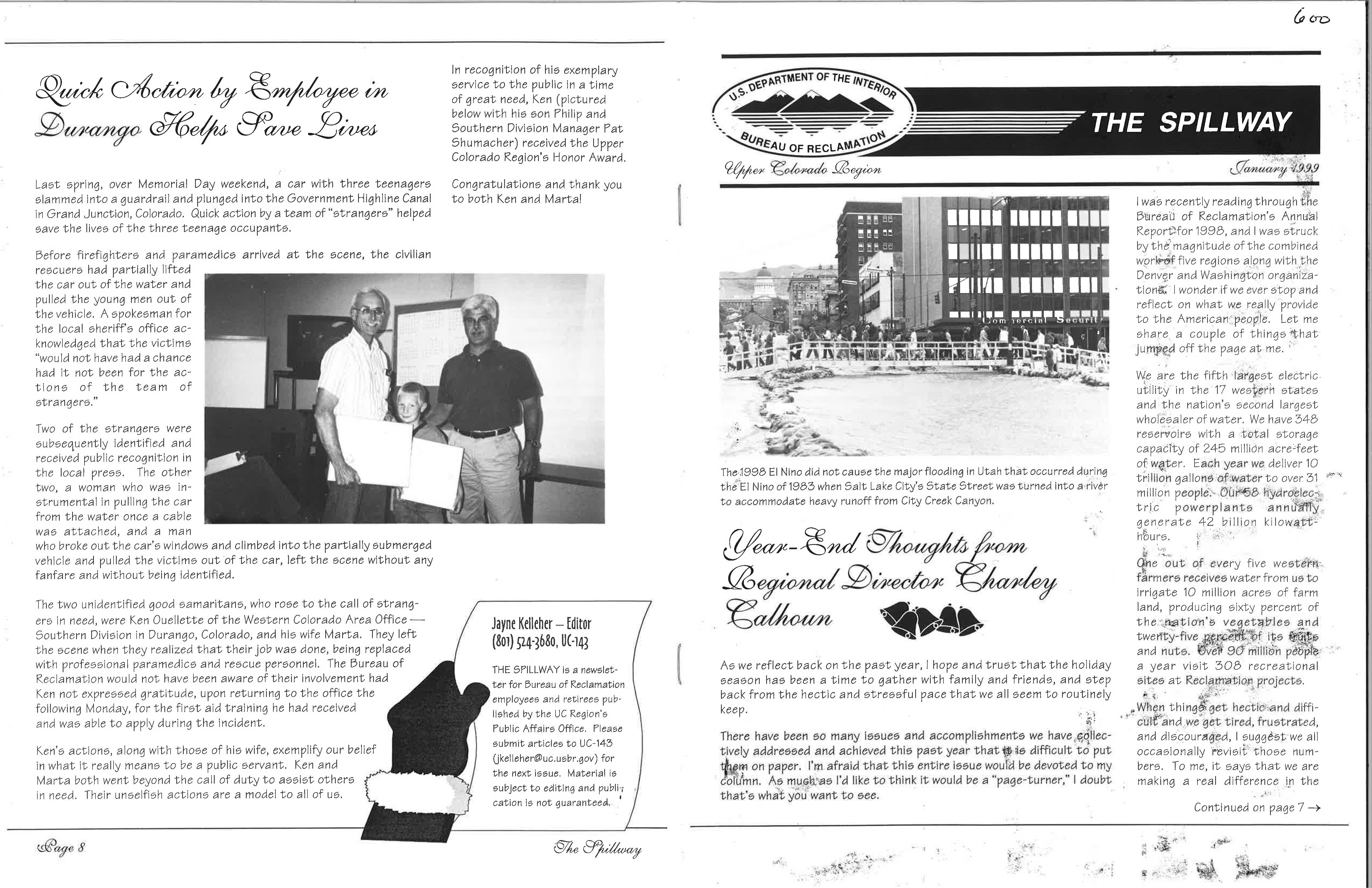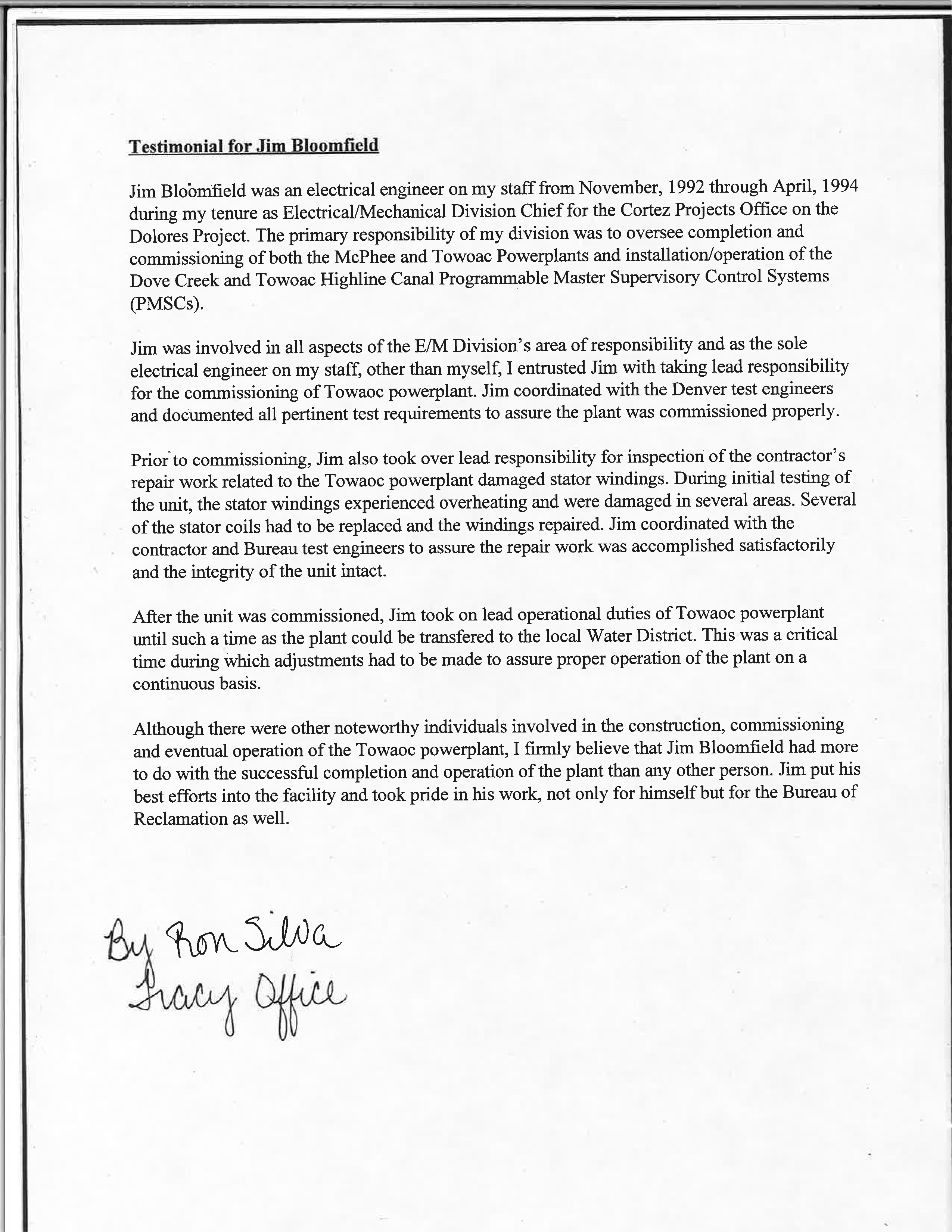 Jim Bloomfield, Bill Duncan, Dephina Holliman, Al Inman, Walt Kaltmaier, Jon Nees, Jeff Waite, and Catrina Wall represented public service at its finest. Through their contributions to the Colorado River Storage Project and other assignments during their careers with the Bureau of Reclamation, they dedicated their time, talents, and energy to make life better for their fellow Americans. They have left a rich legacy of achievement and service to our country that will continue to inspire all who knew and worked with them.
