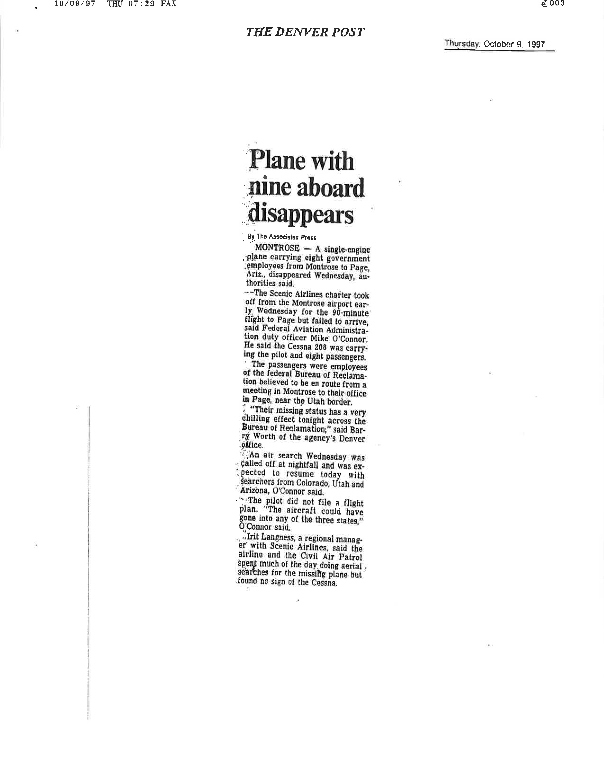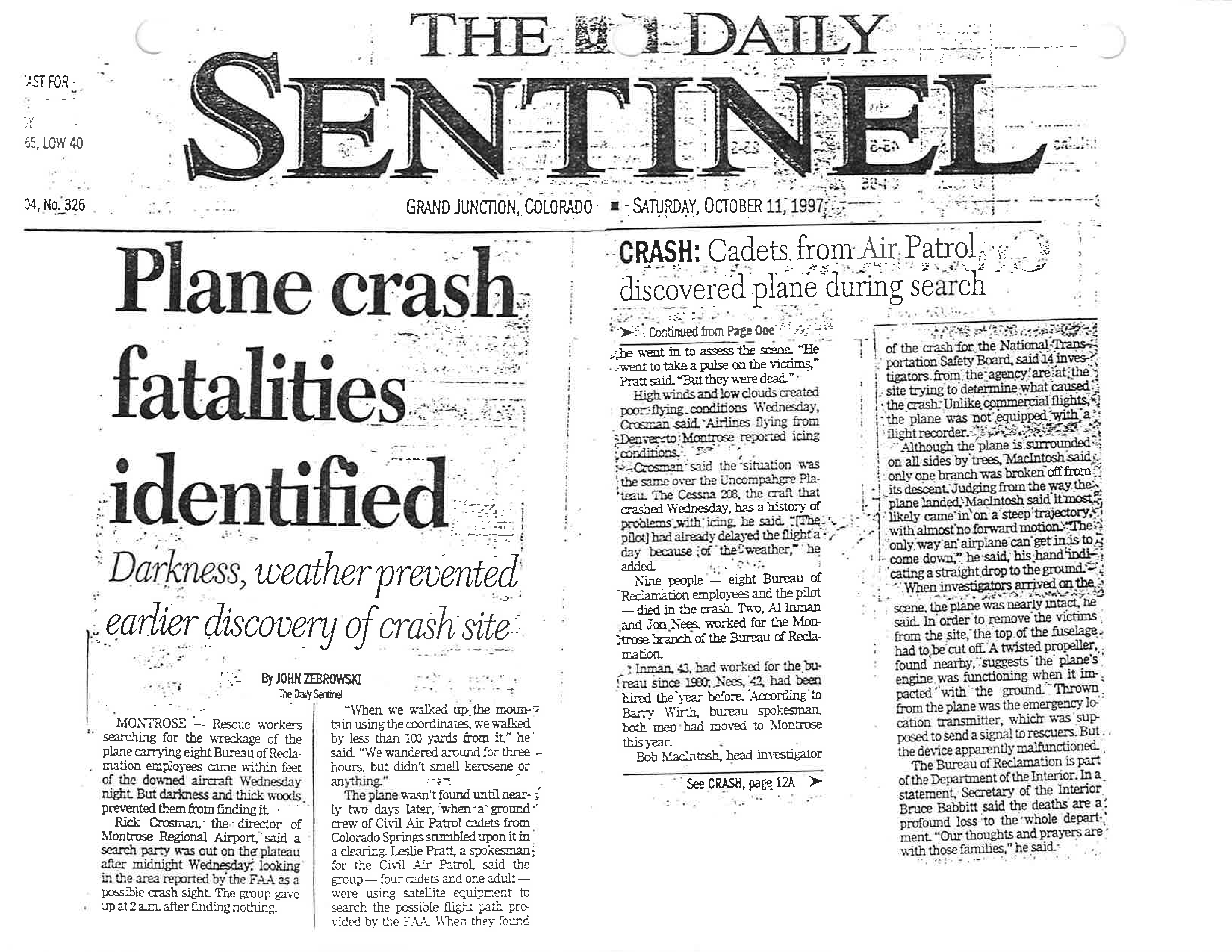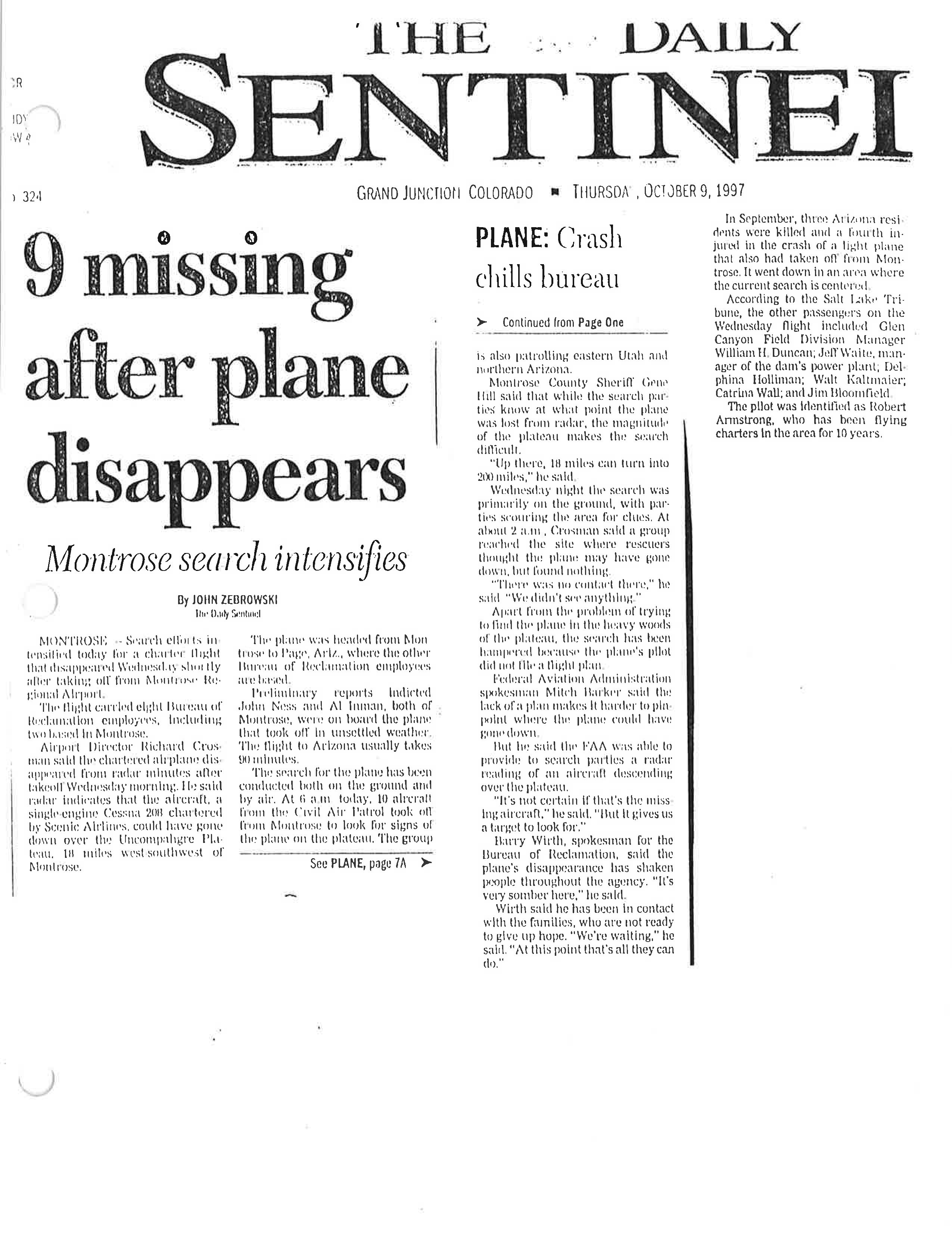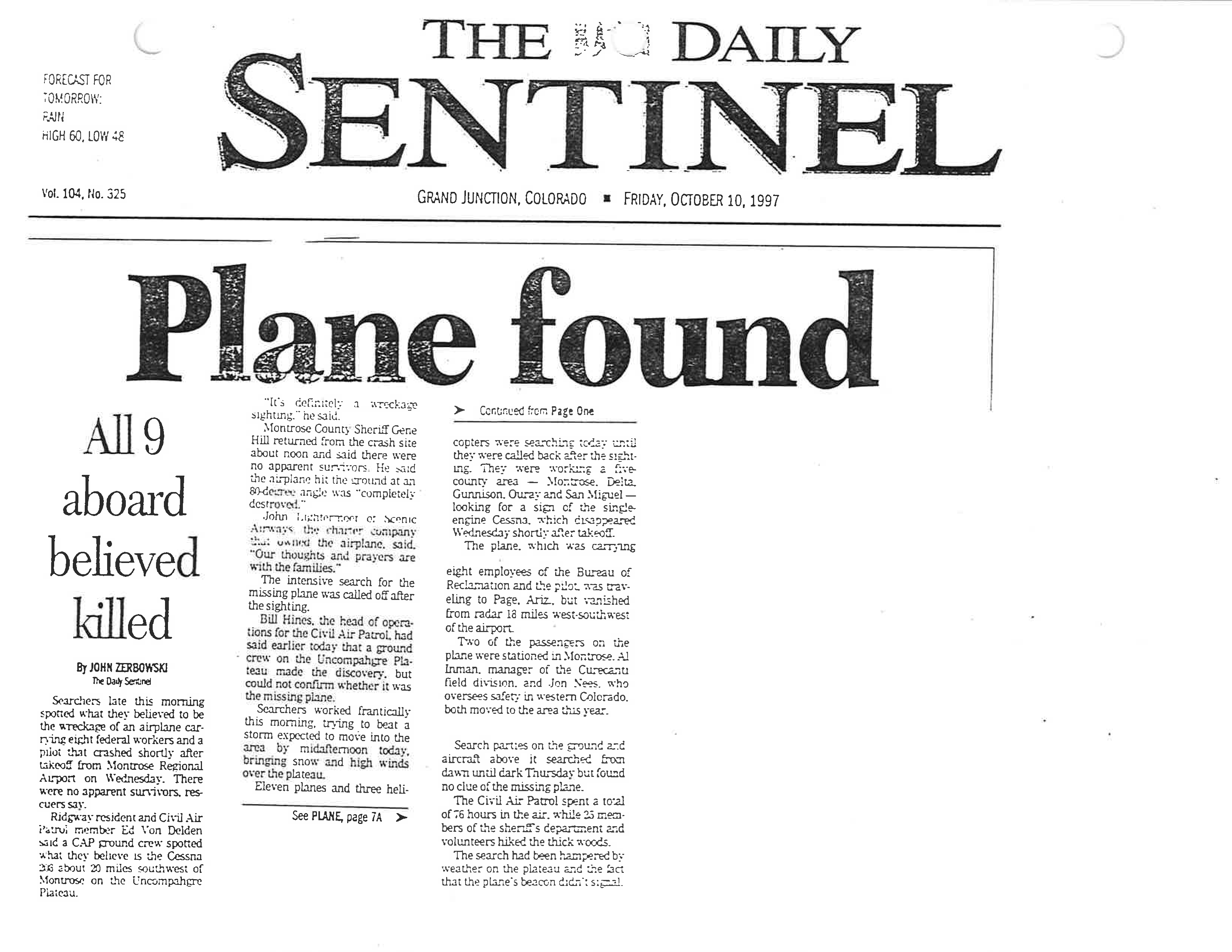 The single-engine plane took off from the Montrose Regional Airport on October 8, 1997, on what was to be a 90-minute flight to Page, Arizona, where employees were to attend a general Power Office meeting. The plane quickly vanished from radar. After two days of searching by the Civil Air Patrol, National Guard, and sheriff's ground crews, the plane was located on October 10, 1997, by a ground crew. An investigation conducted by the National Transportation Safety Board concluded that the cause of the crash was weather conditions.