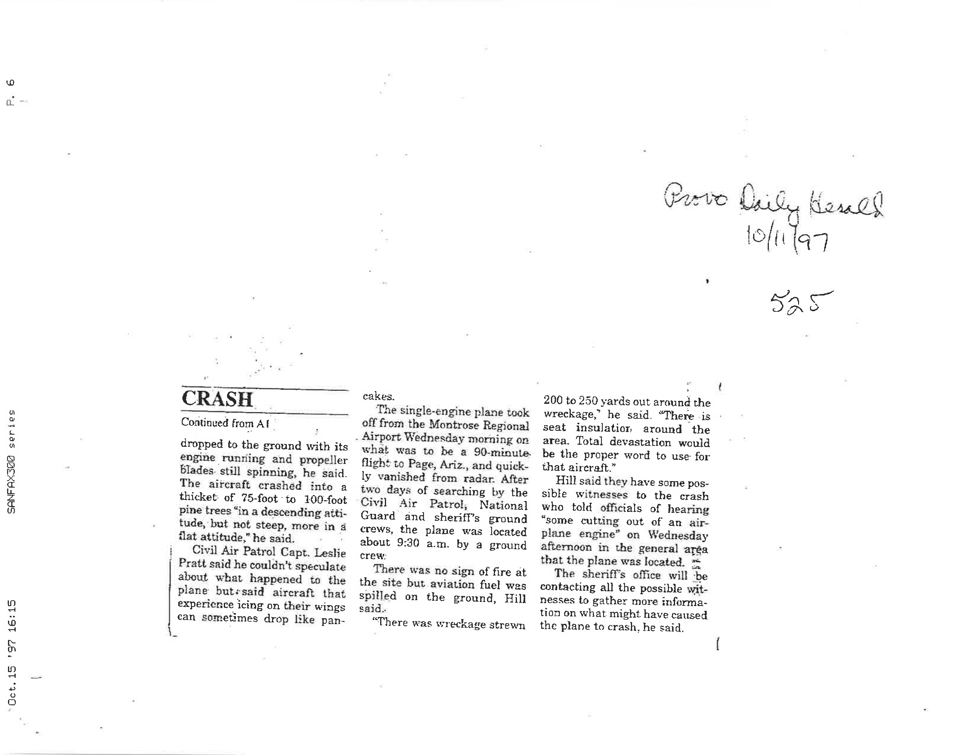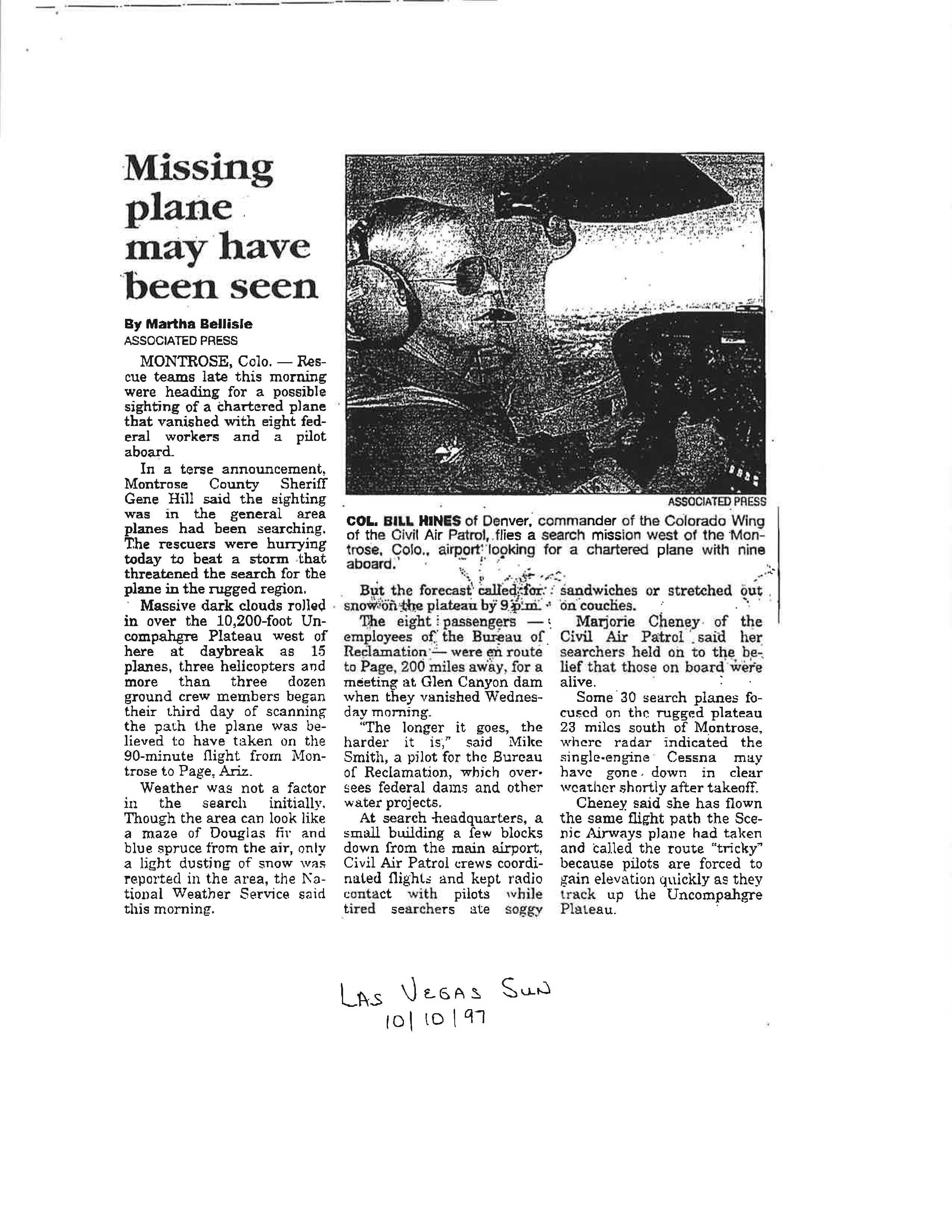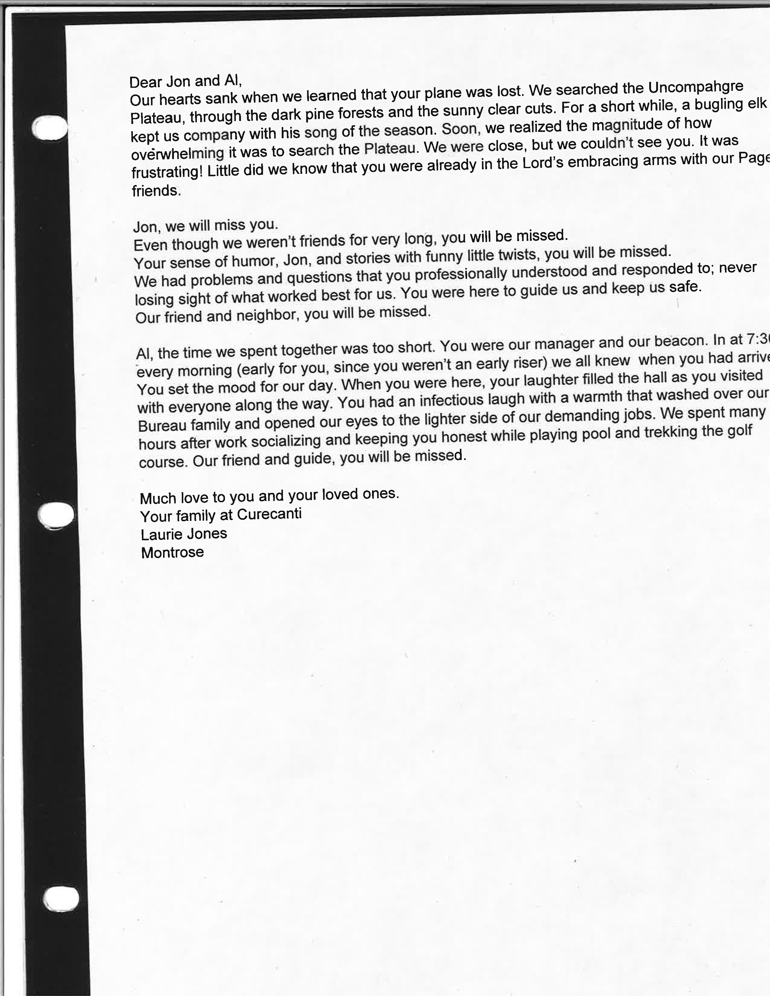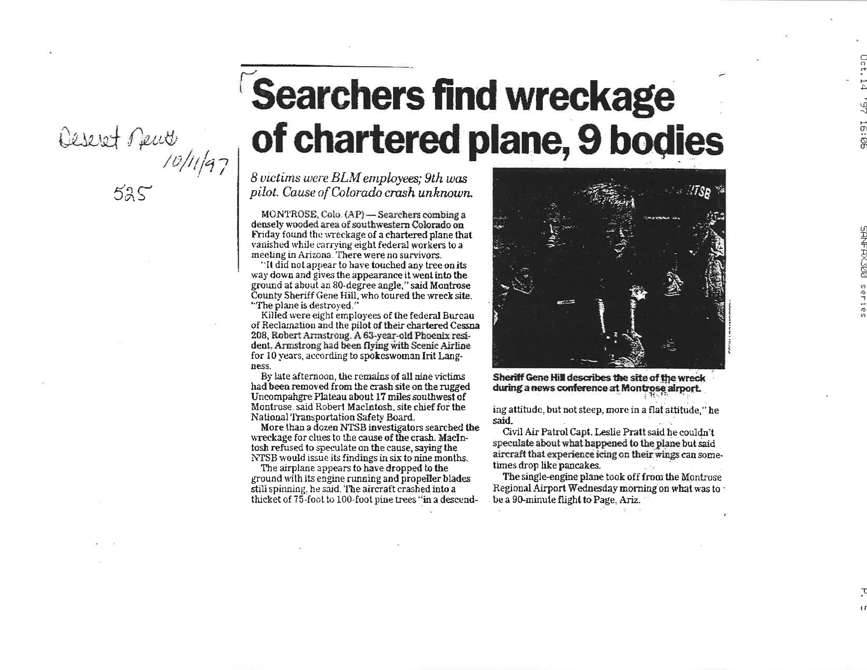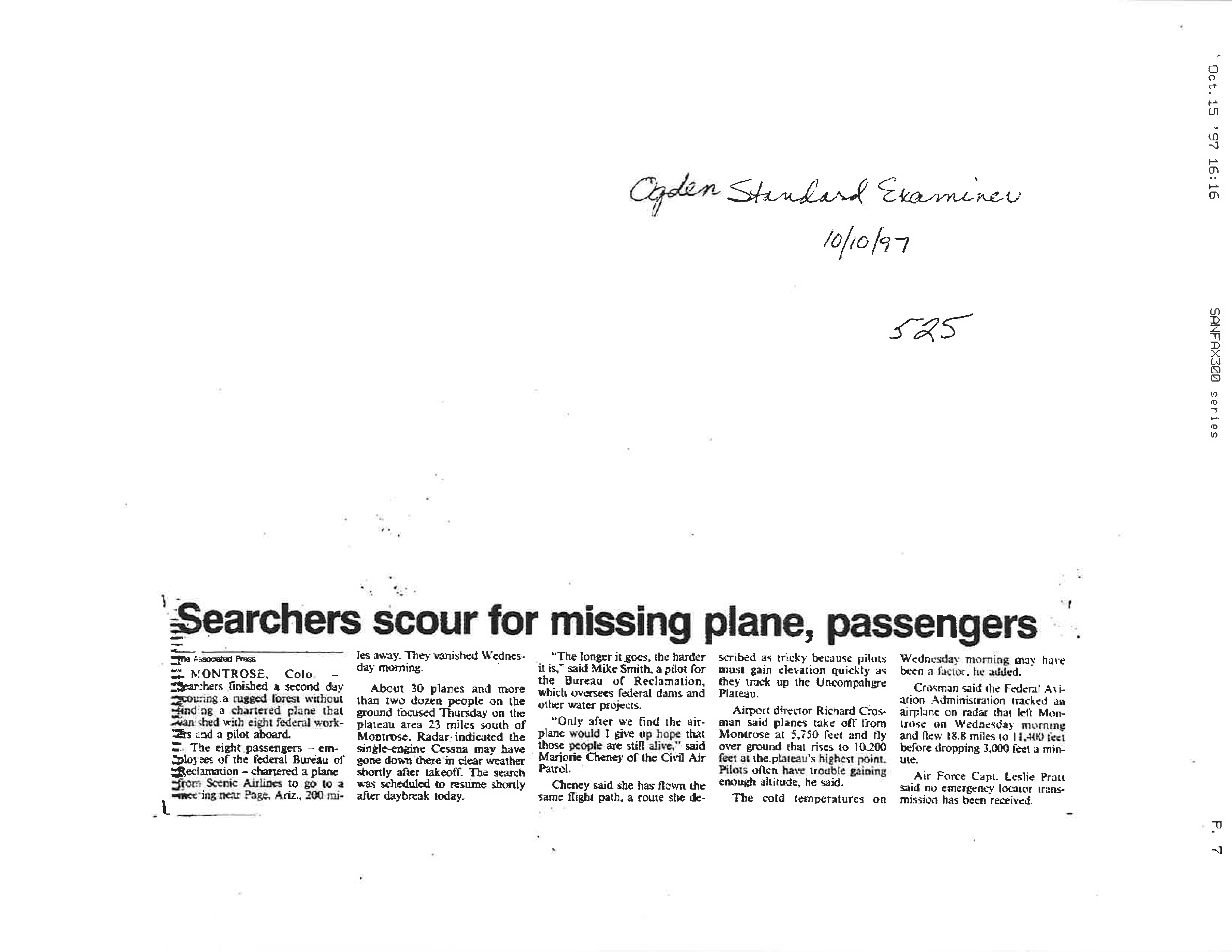 The single-engine plane took off from the Montrose Regional Airport on October 8, 1997, on what was to be a 90-minute flight to Page, Arizona, where employees were to attend a general Power Office meeting. The plane quickly vanished from radar. After two days of searching by the Civil Air Patrol, National Guard, and sheriff's ground crews, the plane was located on October 10, 1997, by a ground crew. An investigation conducted by the National Transportation Safety Board concluded that the cause of the crash was weather conditions.