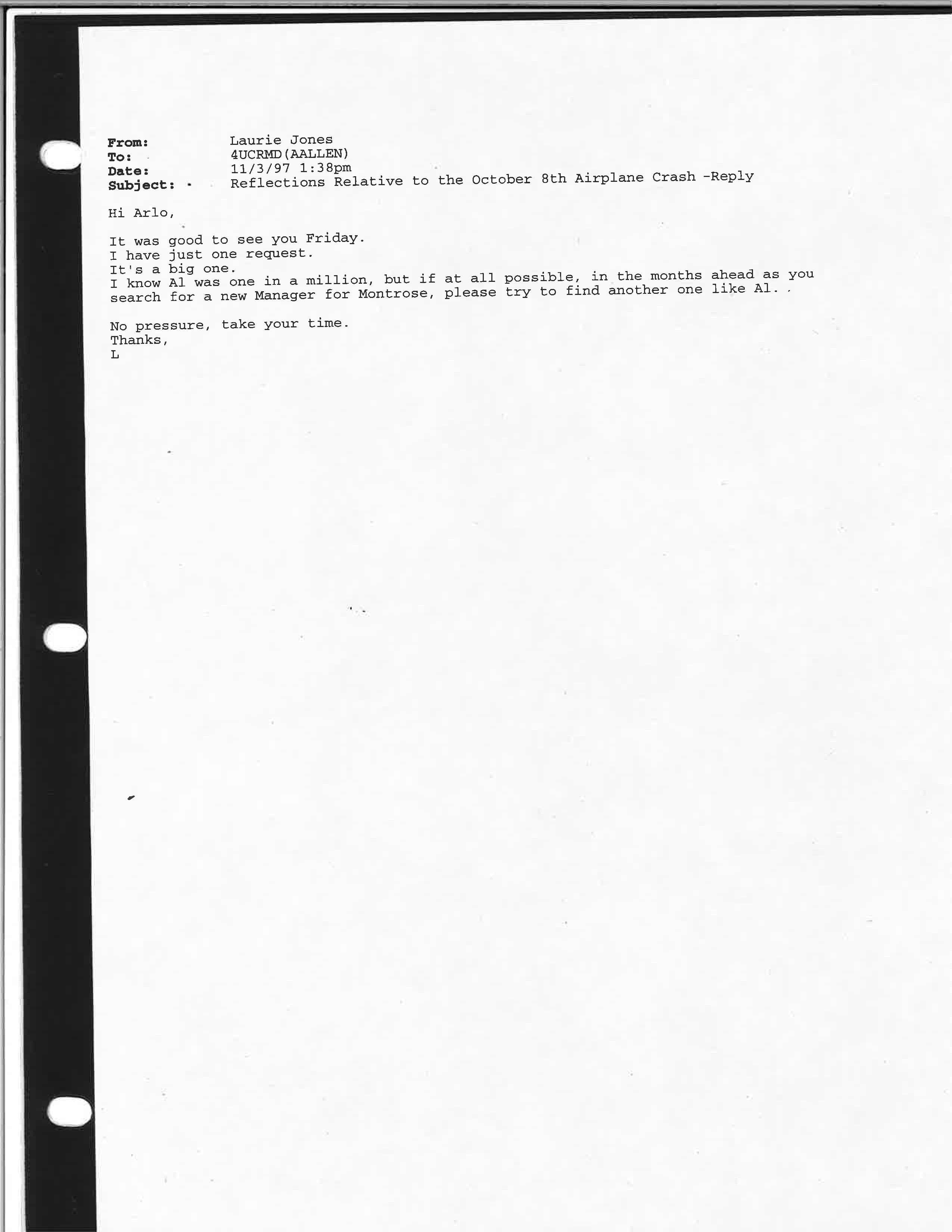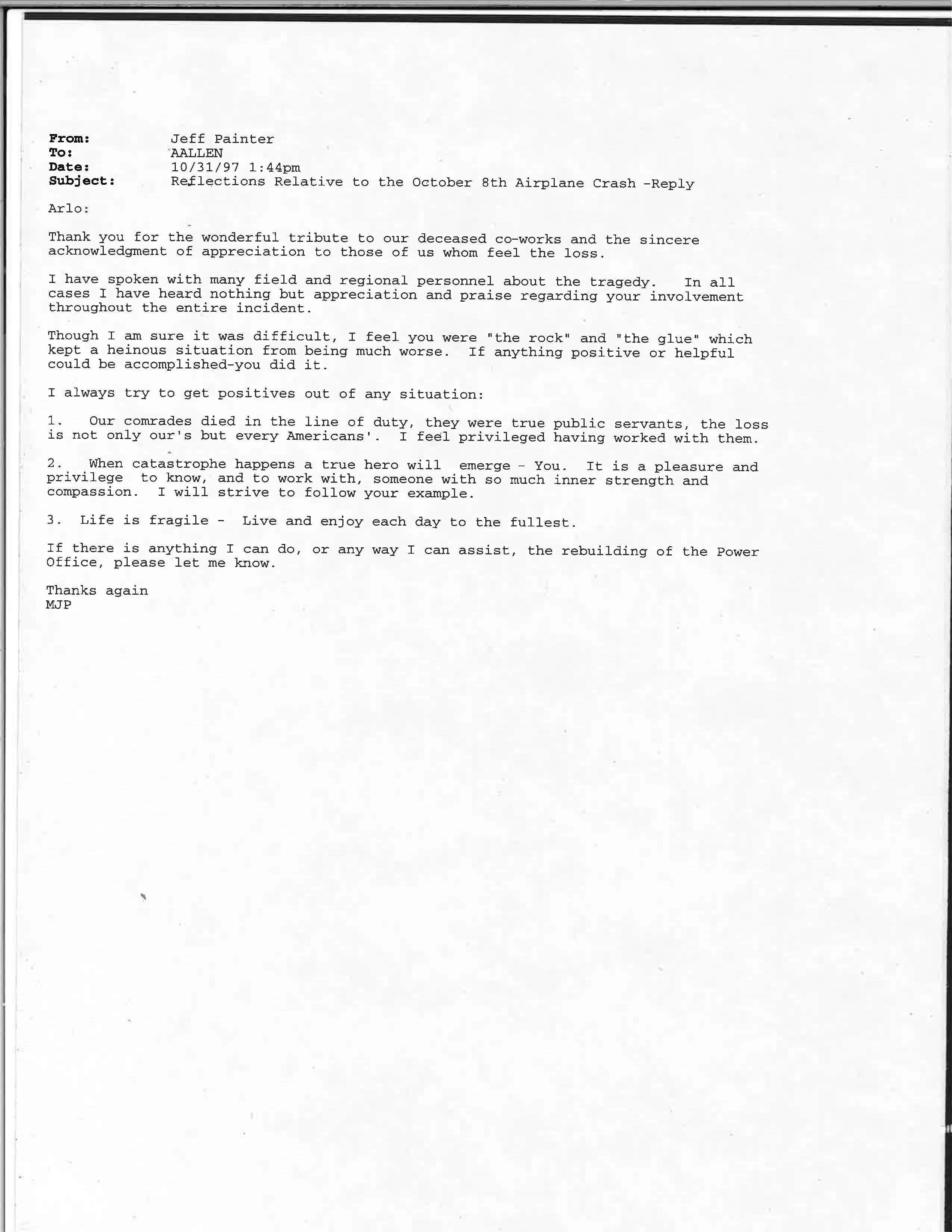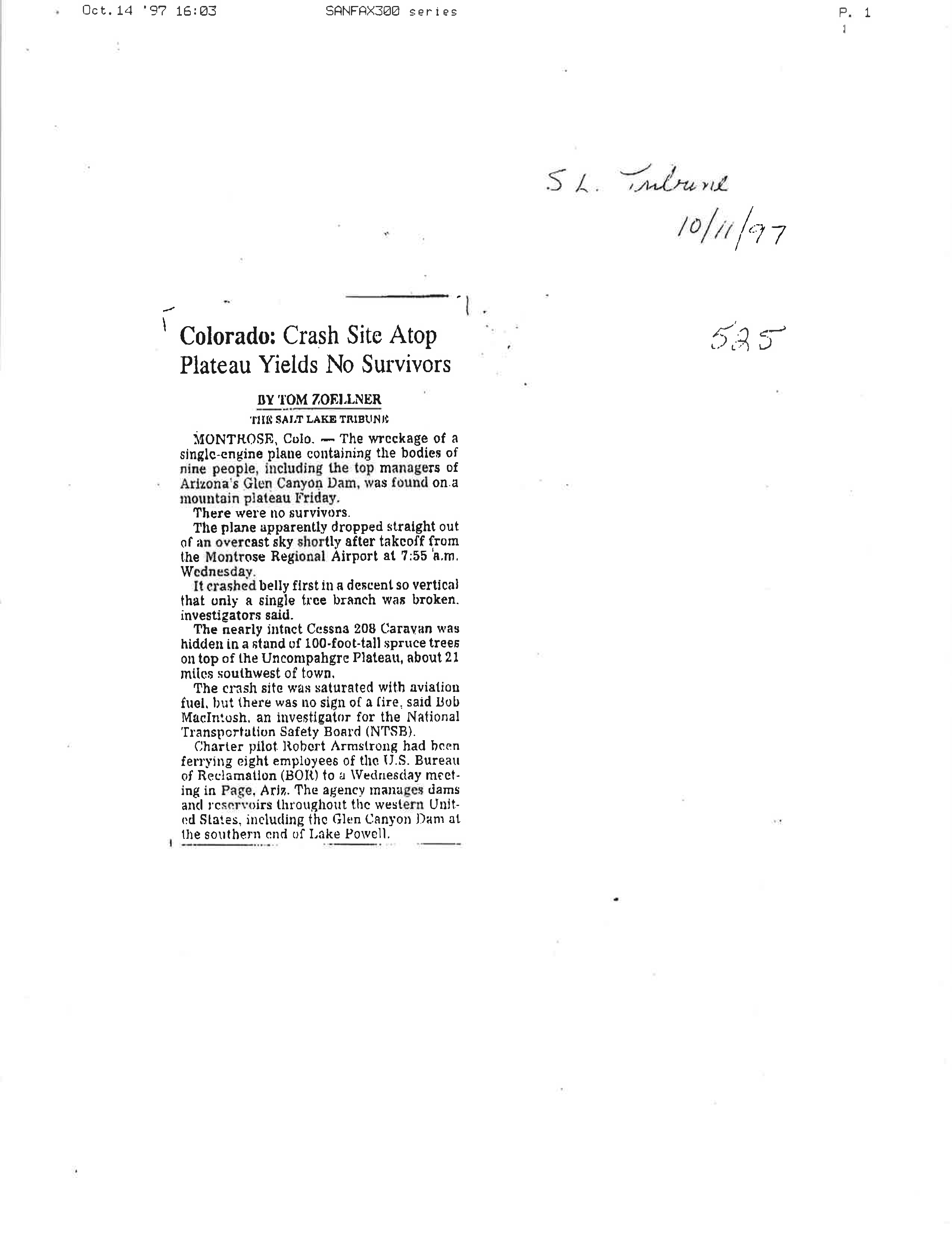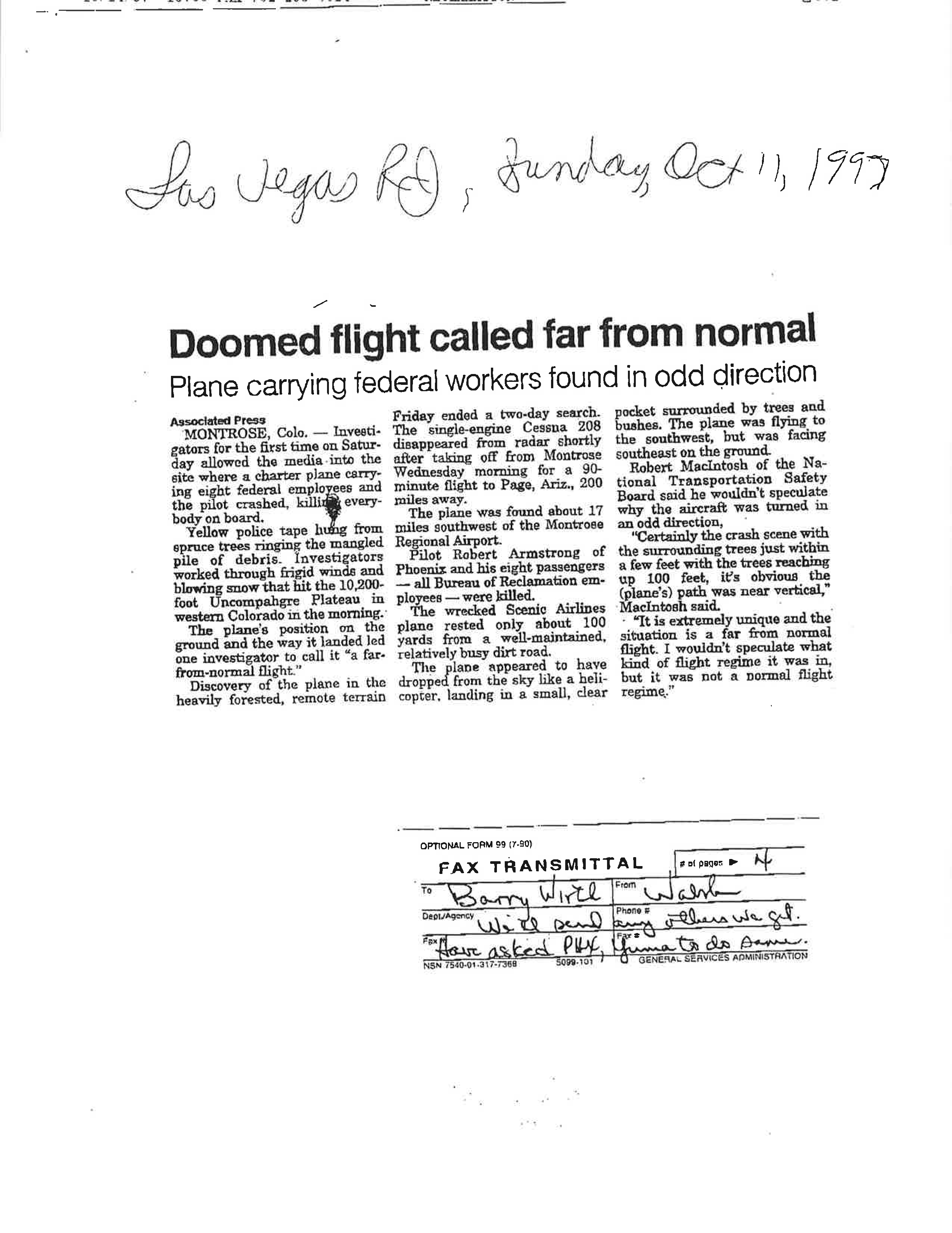 The single-engine plane took off from the Montrose Regional Airport on October 8, 1997, on what was to be a 90-minute flight to Page, Arizona, where employees were to attend a general Power Office meeting. The plane quickly vanished from radar. After two days of searching by the Civil Air Patrol, National Guard, and sheriff's ground crews, the plane was located on October 10, 1997, by a ground crew. An investigation conducted by the National Transportation Safety Board concluded that the cause of the crash was weather conditions.