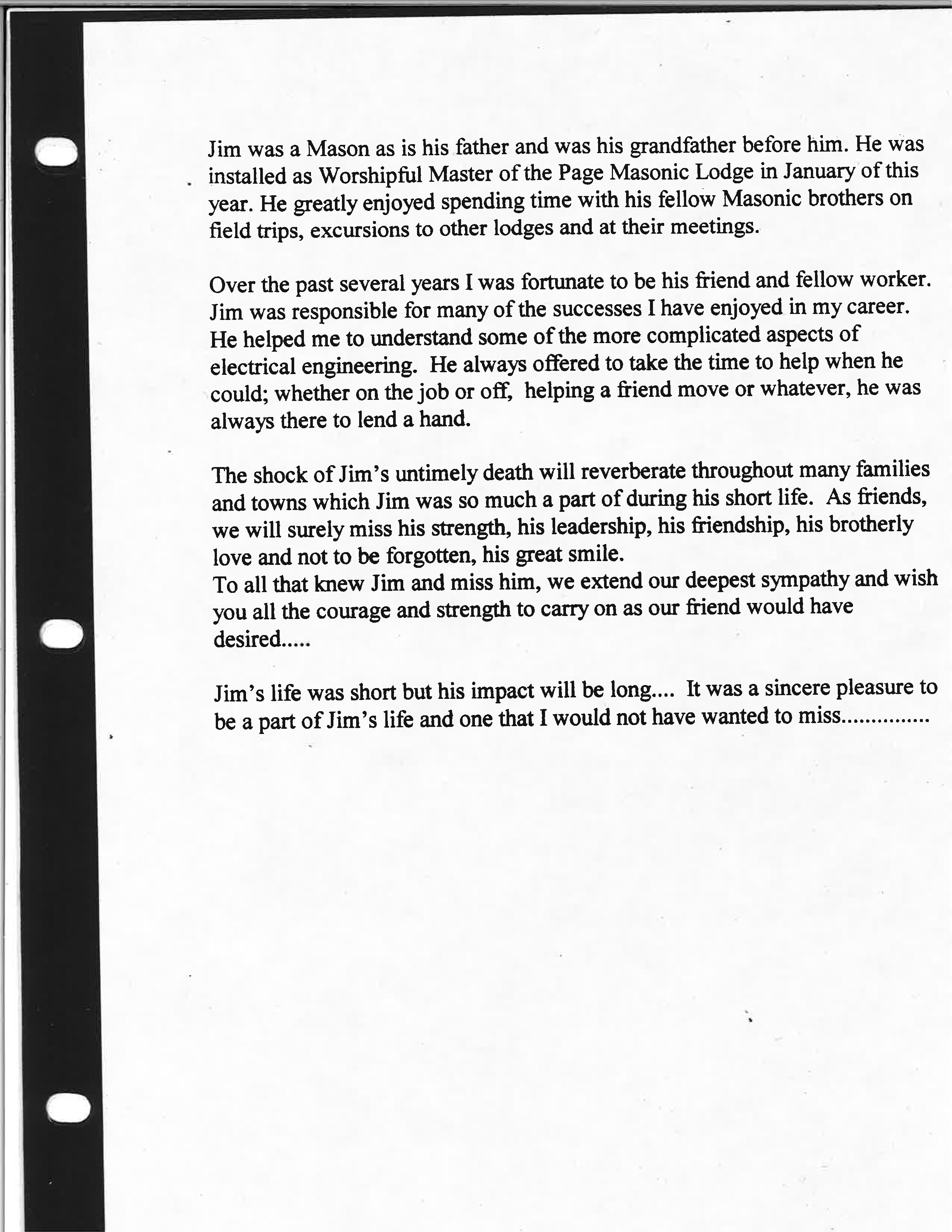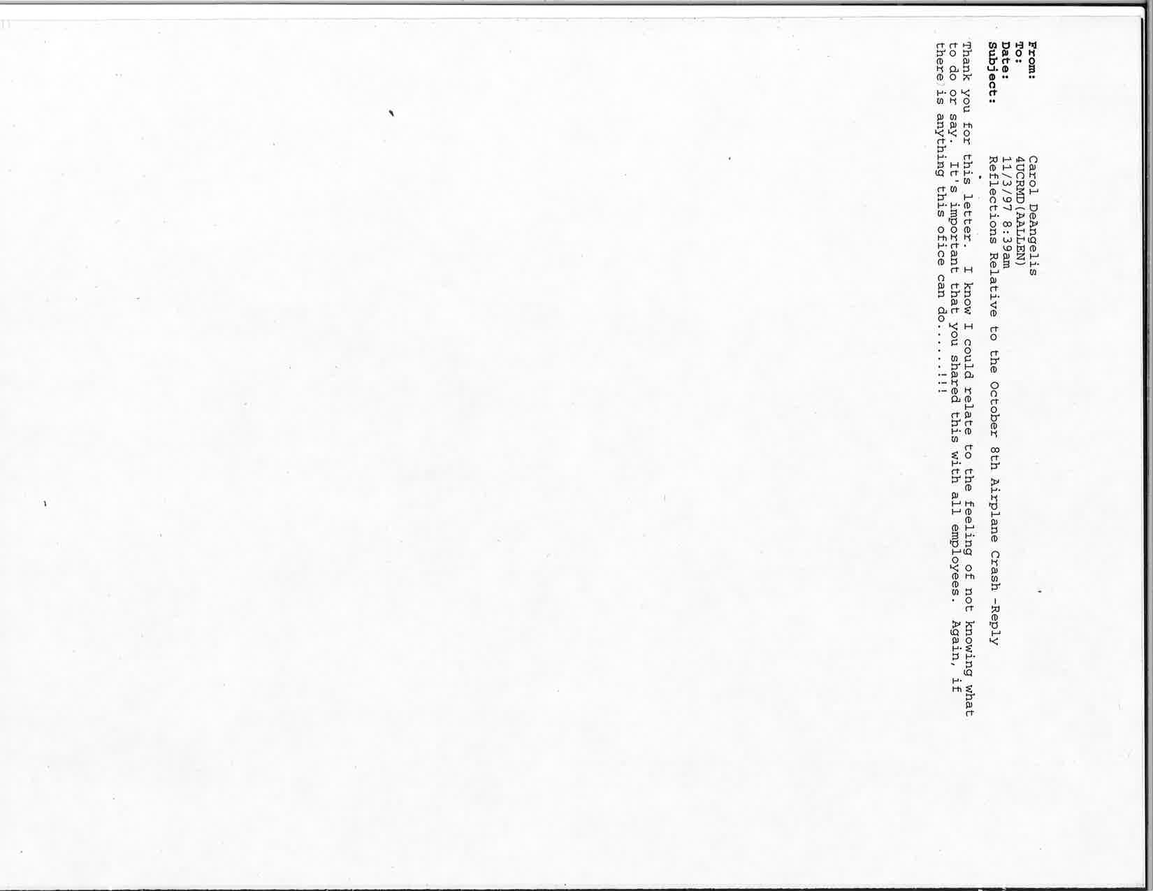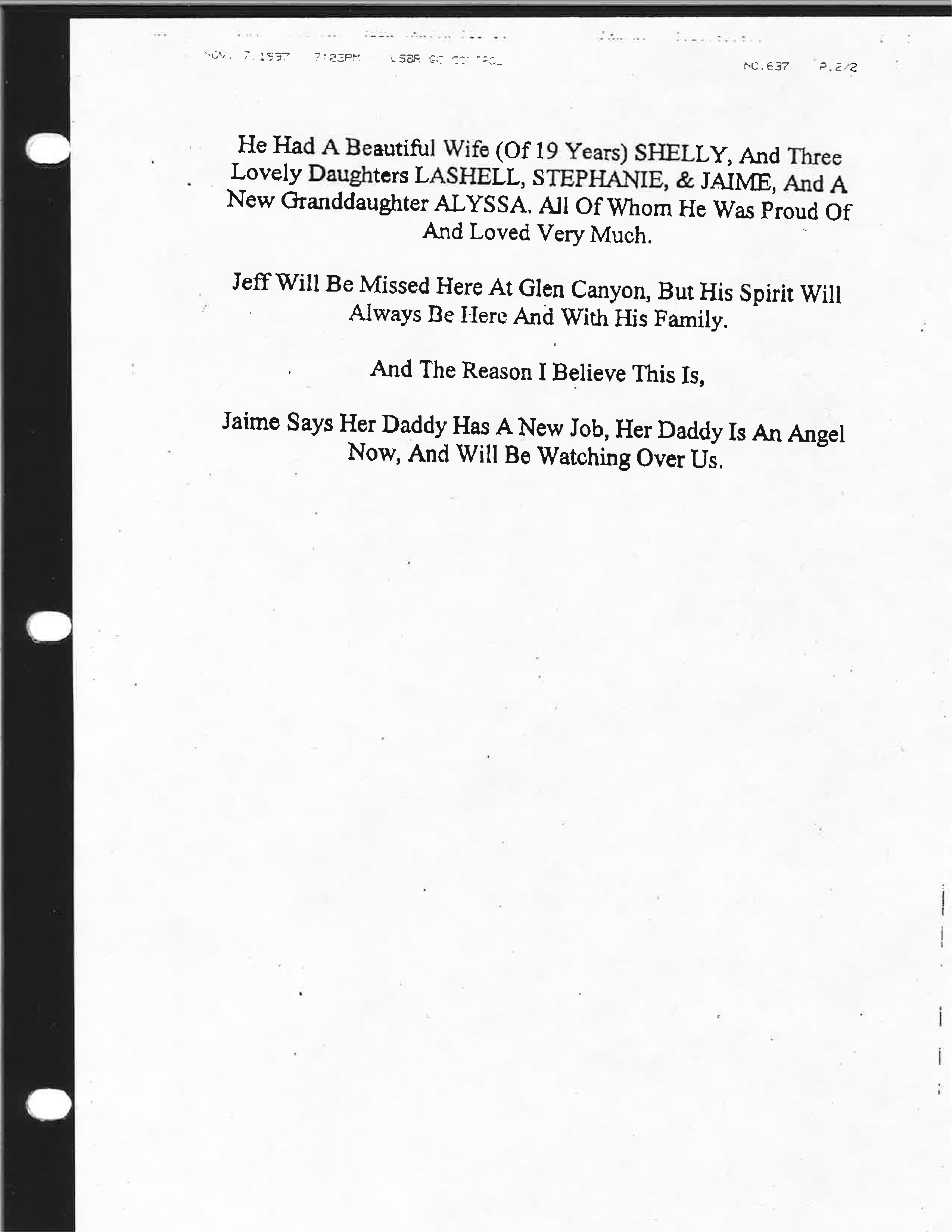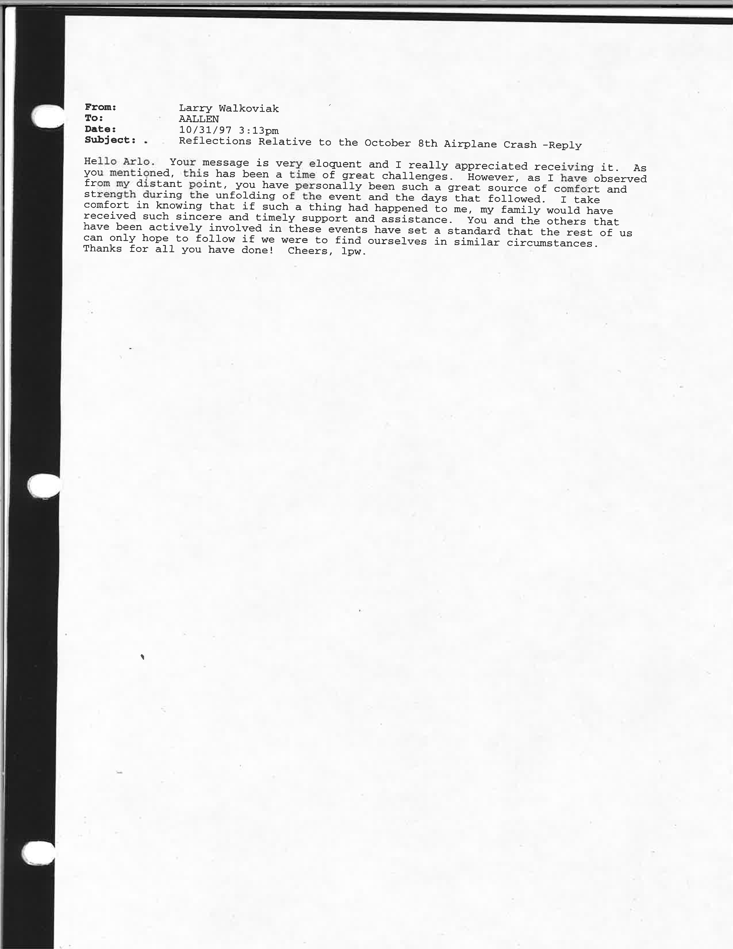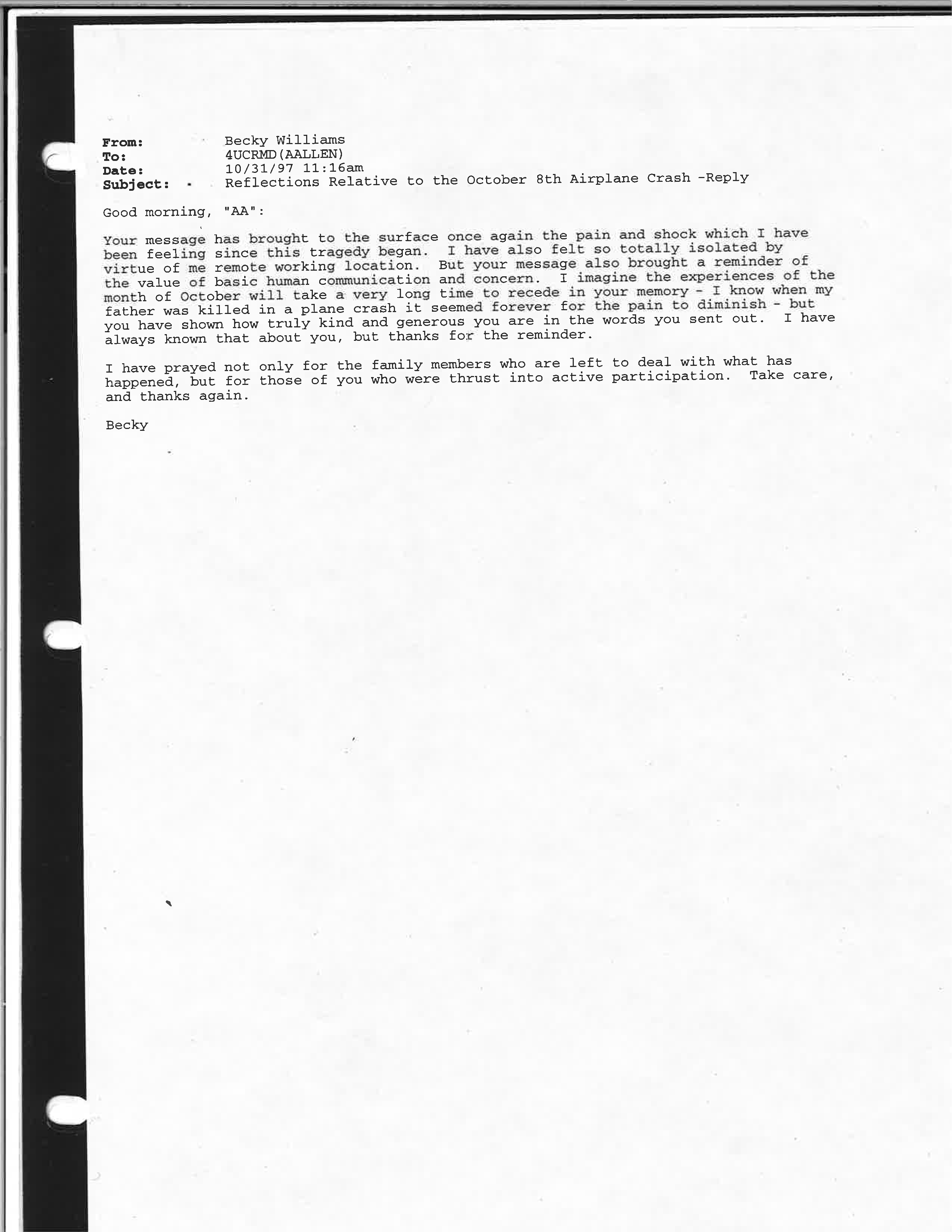 The single-engine plane took off from the Montrose Regional Airport on October 8, 1997, on what was to be a 90-minute flight to Page, Arizona, where employees were to attend a general Power Office meeting. The plane quickly vanished from radar. After two days of searching by the Civil Air Patrol, National Guard, and sheriff's ground crews, the plane was located on October 10, 1997, by a ground crew. An investigation conducted by the National Transportation Safety Board concluded that the cause of the crash was weather conditions.