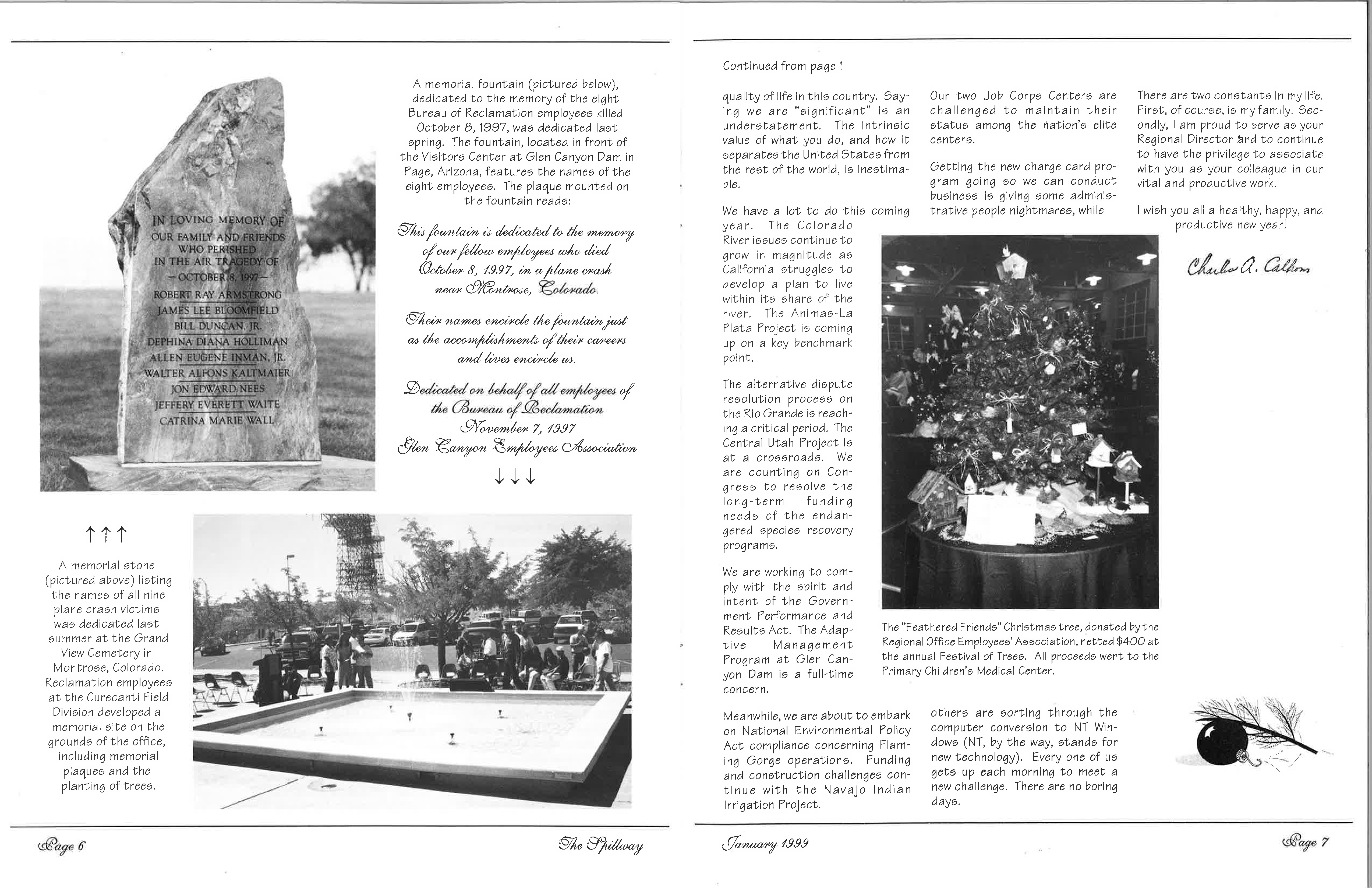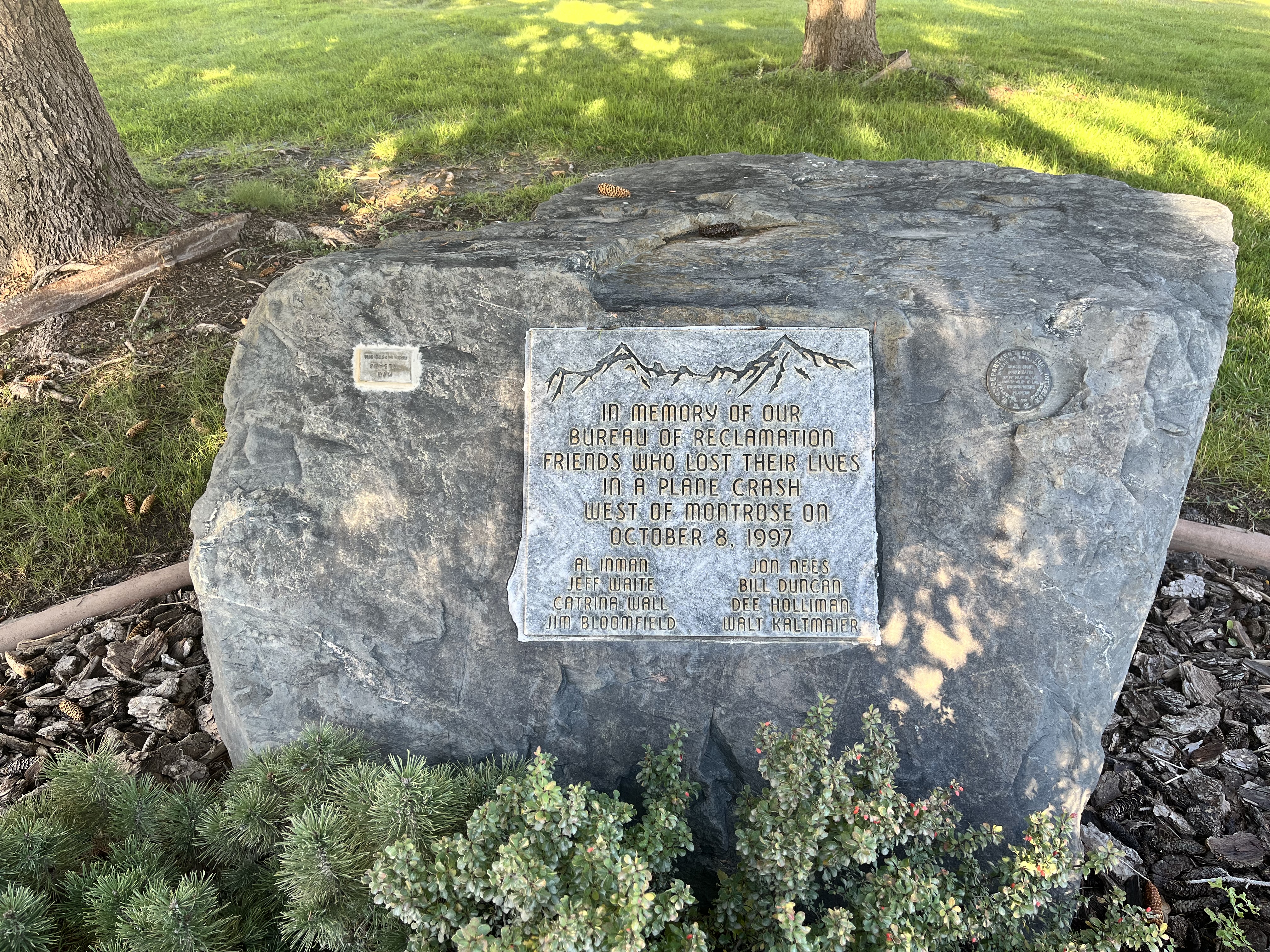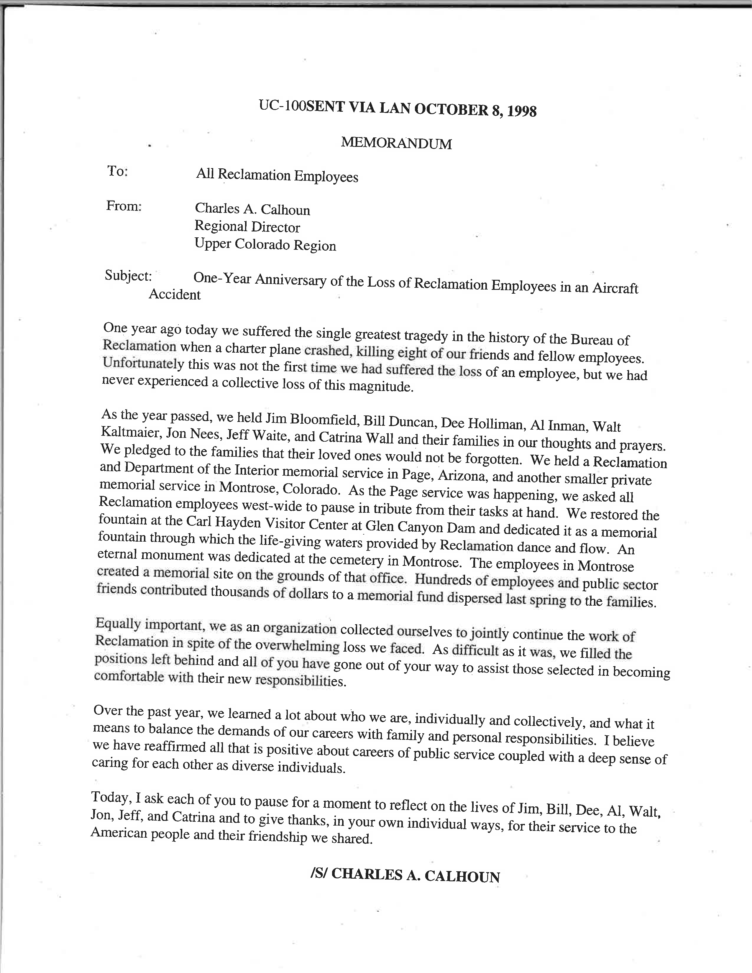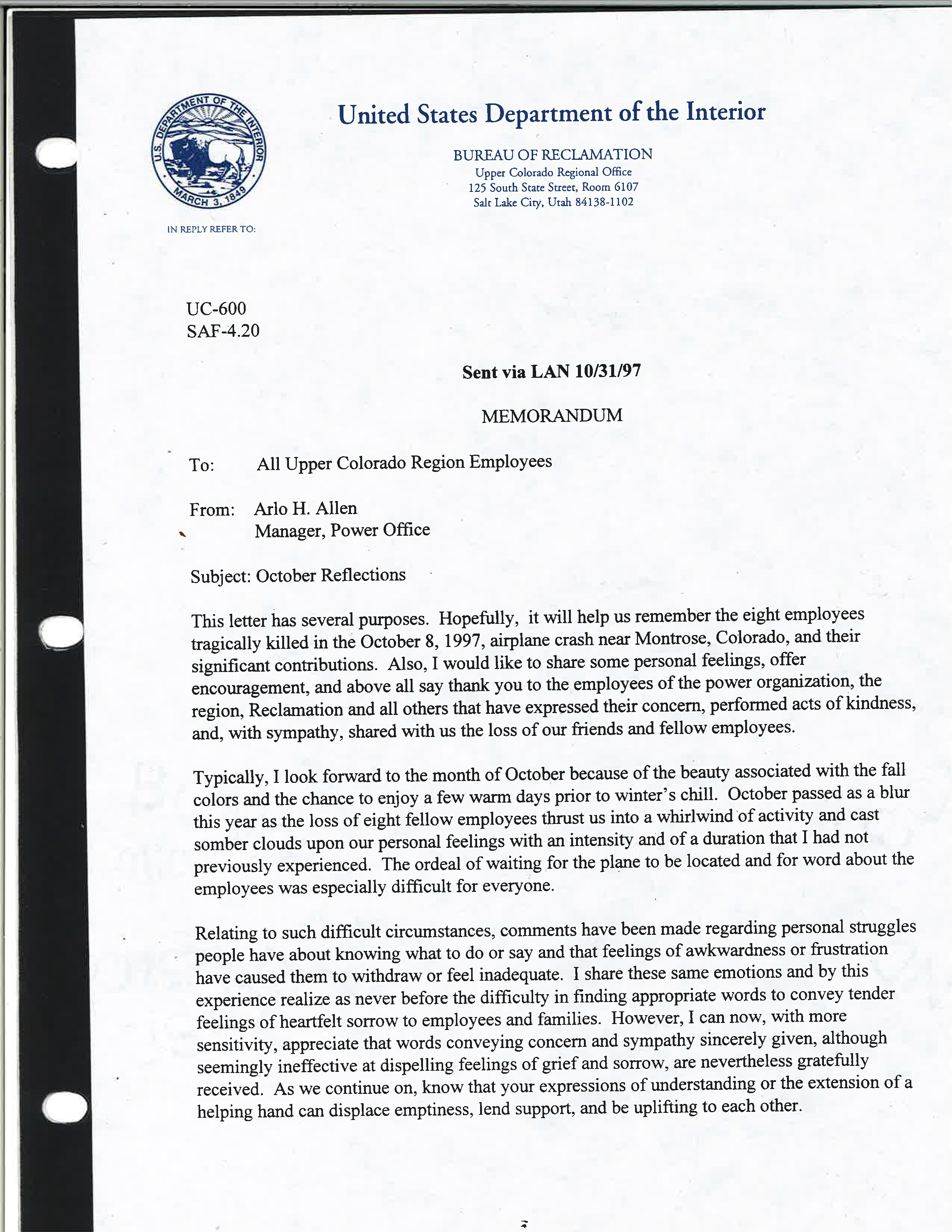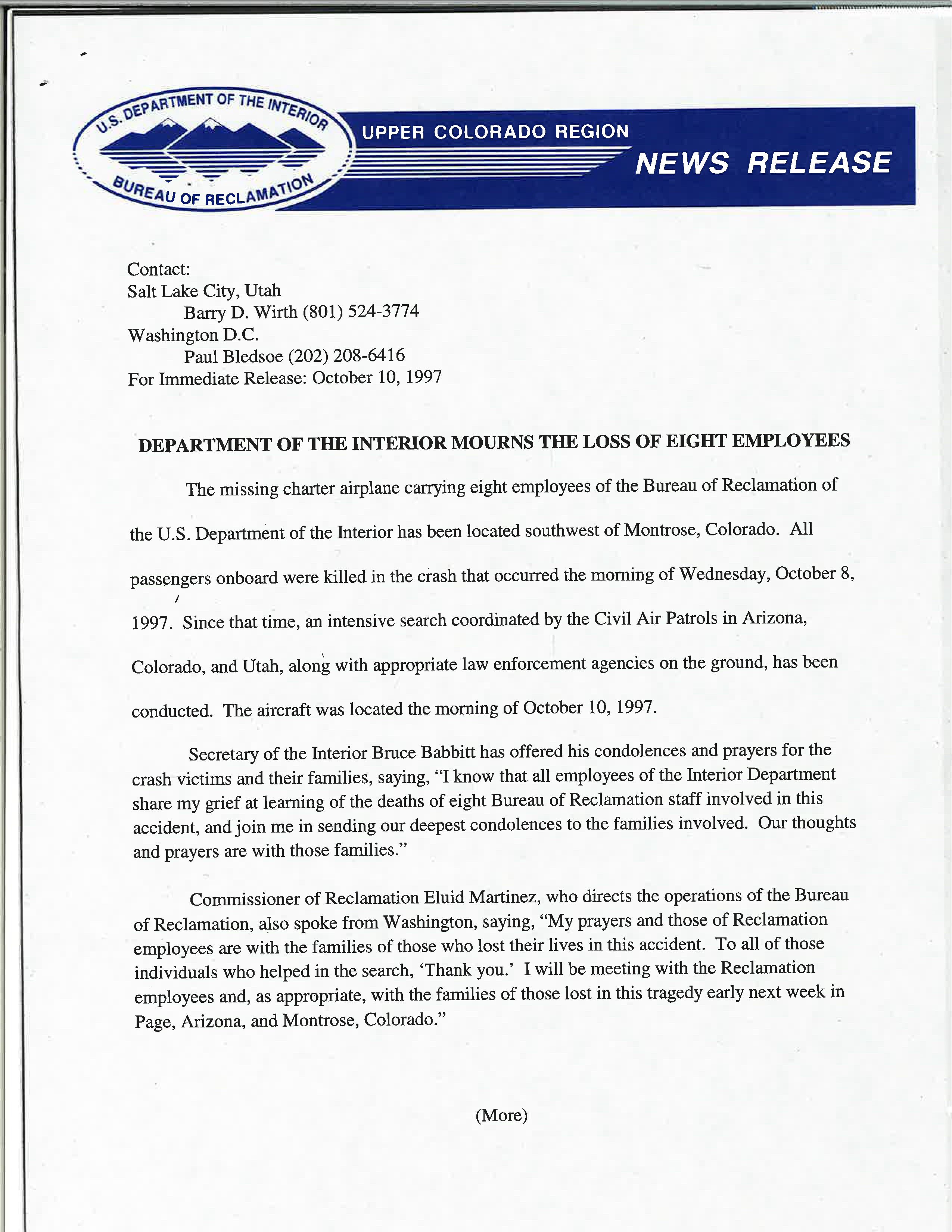 Twenty-five years ago, tragedy struck Reclamation when a chartered plane carrying eight Upper Colorado Basin Region employees crashed on the rugged Uncompahgre Plateau about 18 miles southwest of Montrose, Colorado. All eight employees and the pilot of their chartered Cessna 208 were killed on that fatal day. U.S. flags at all Department of the Interior facilities across the country flew at half-staff for two days to honor the employees who lost their lives on October 8, 1997.