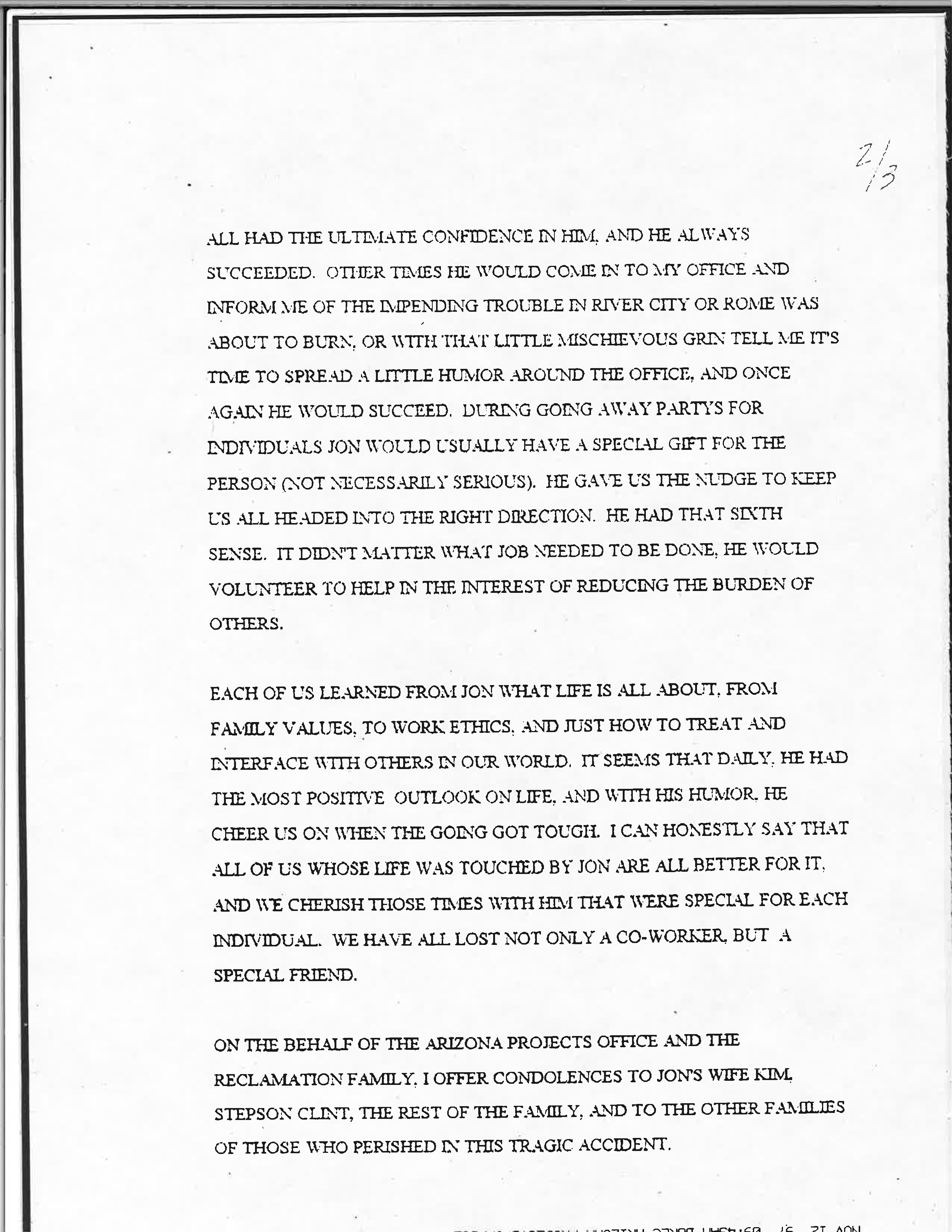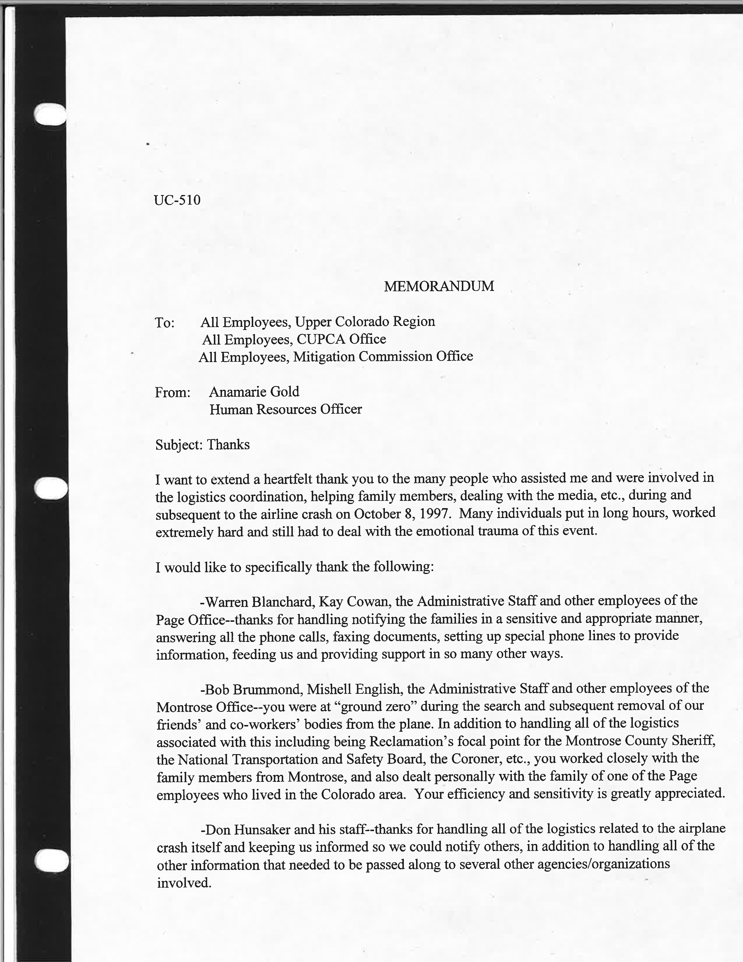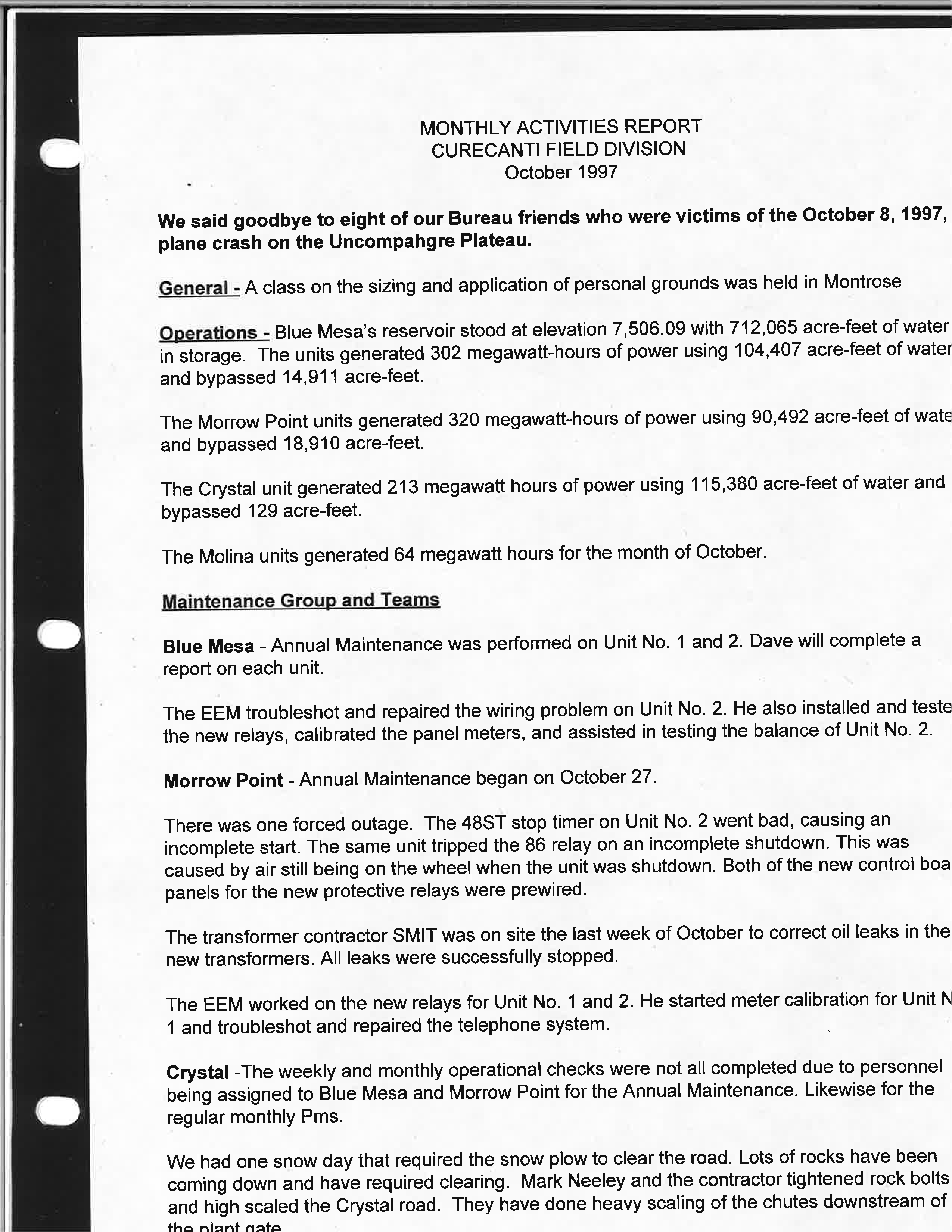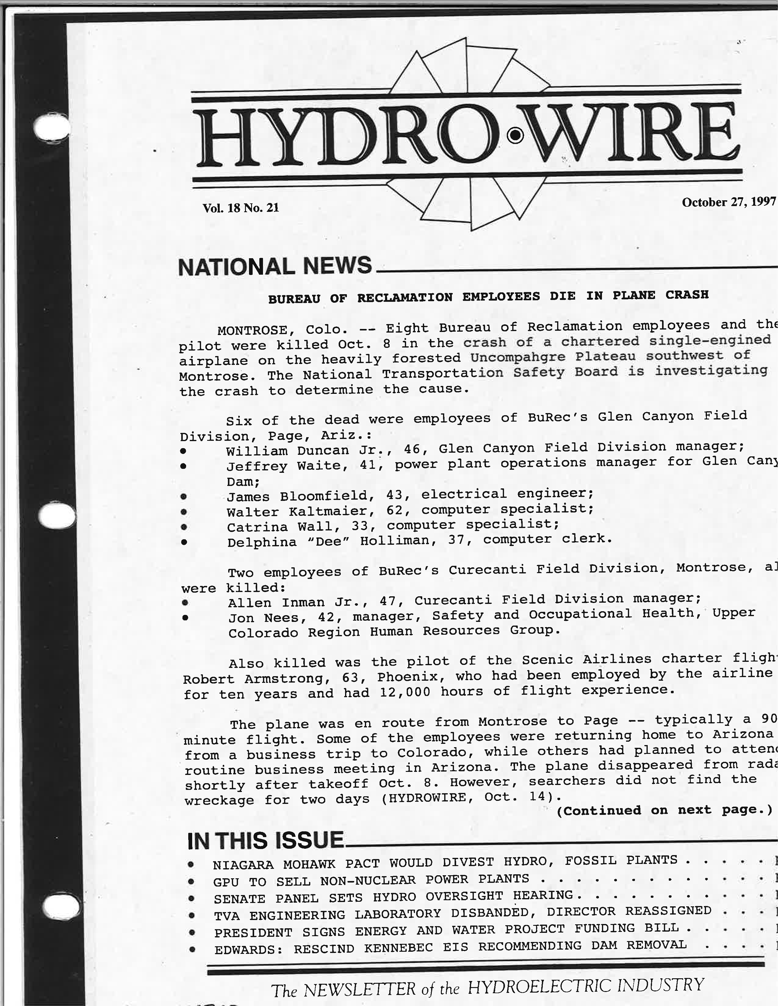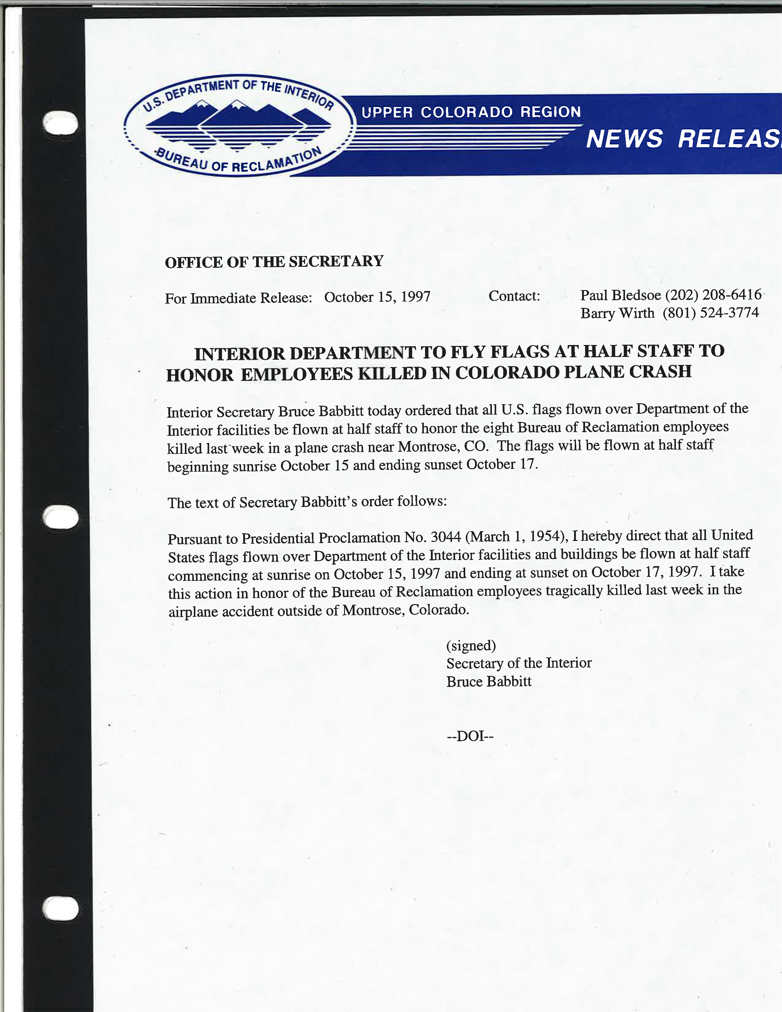 Twenty-five years ago, tragedy struck Reclamation when a chartered plane carrying eight Upper Colorado Basin Region employees crashed on the rugged Uncompahgre Plateau about 18 miles southwest of Montrose, Colorado. All eight employees and the pilot of their chartered Cessna 208 were killed on that fatal day. U.S. flags at all Department of the Interior facilities across the country flew at half-staff for two days to honor the employees who lost their lives on October 8, 1997.