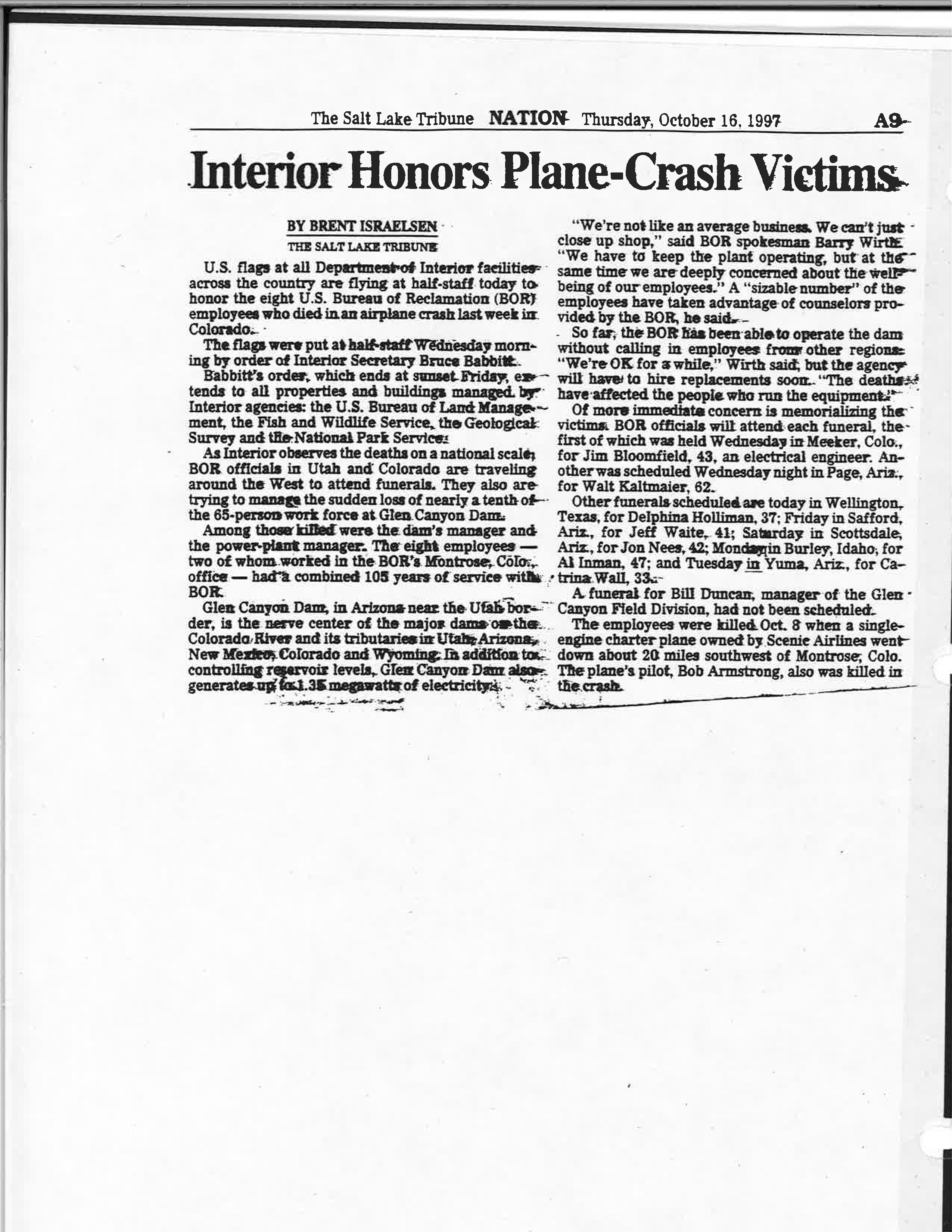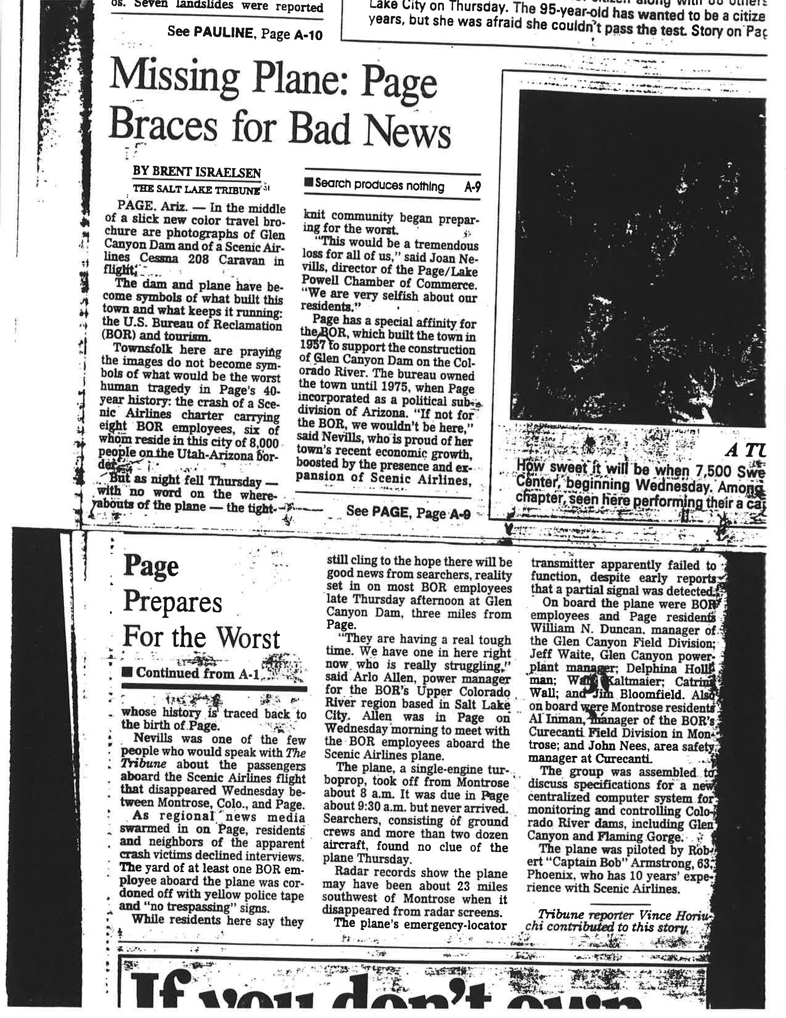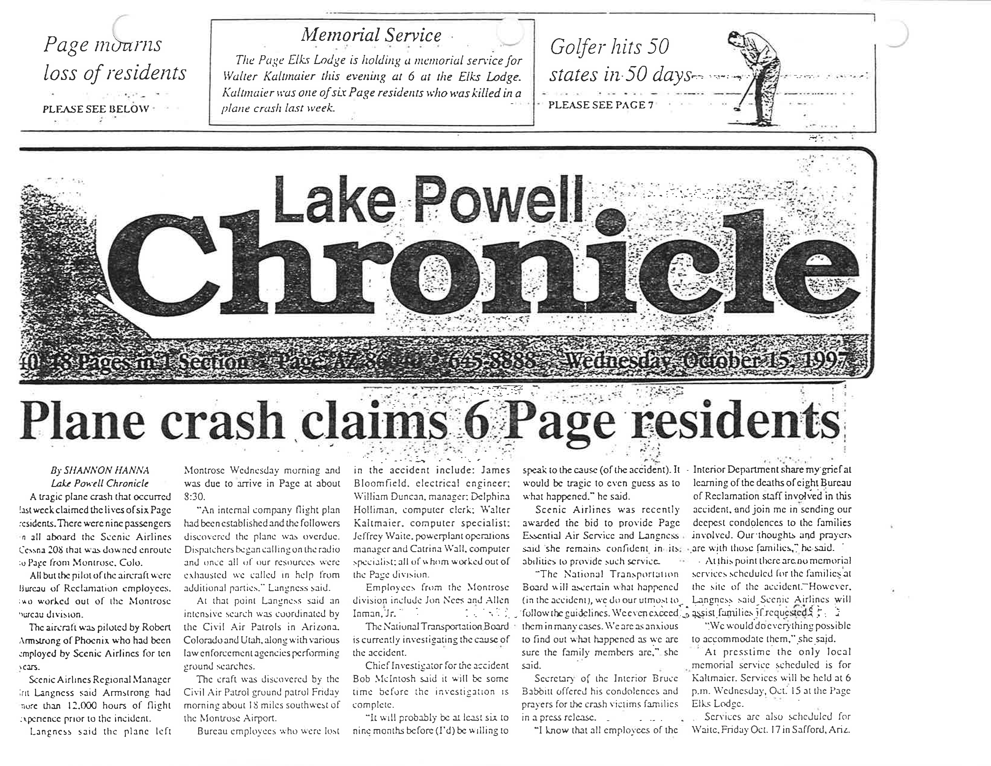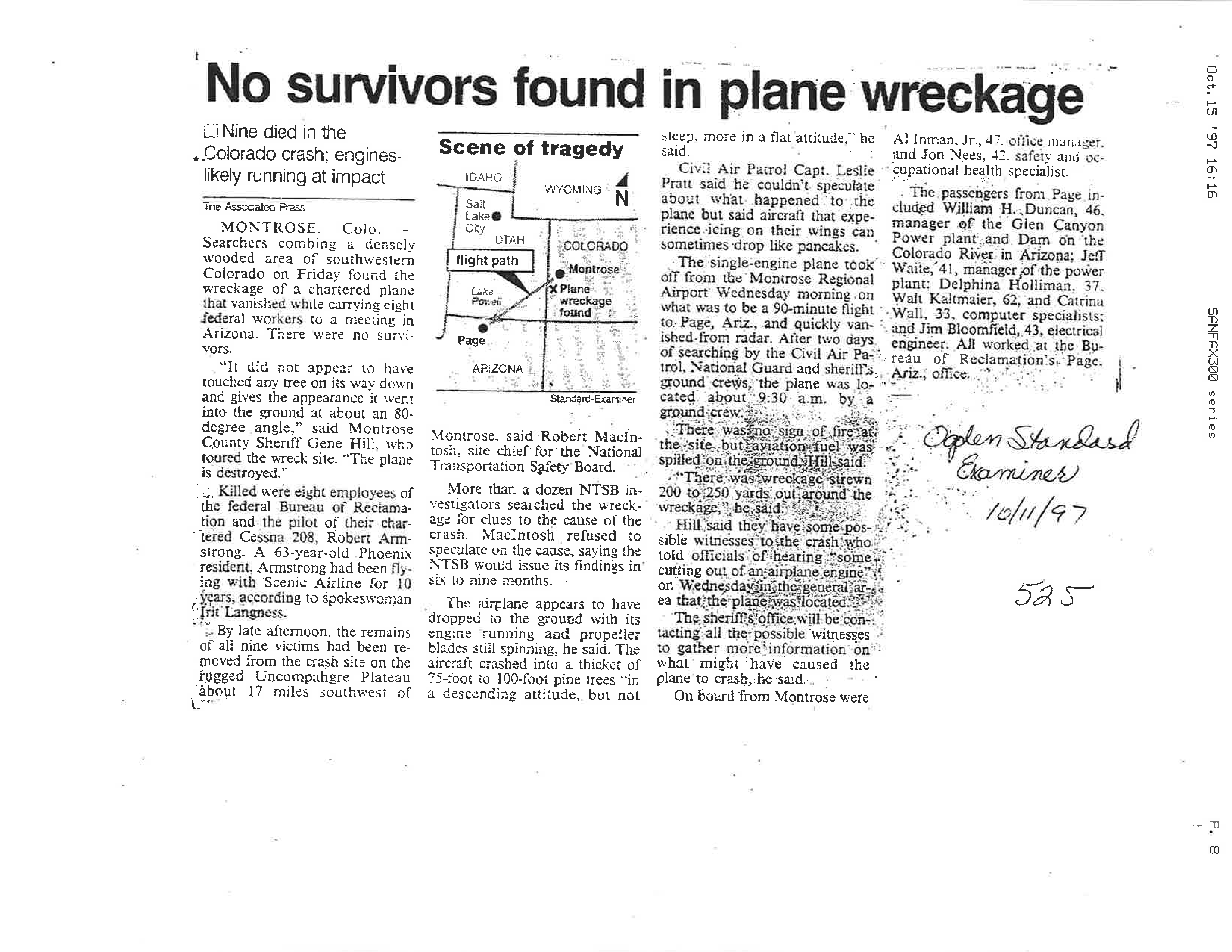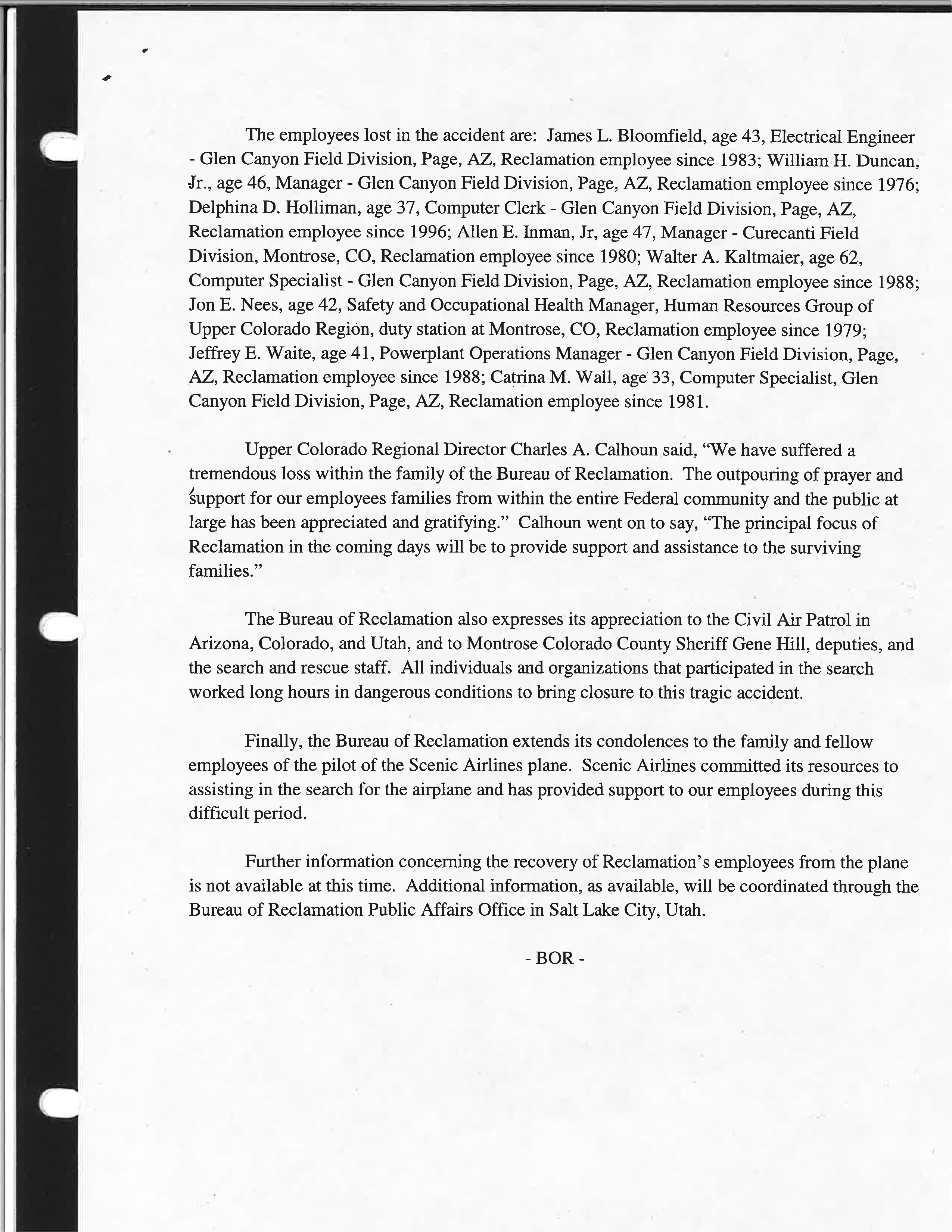 On board from Montrose, Colorado, were Allen E. "Al" Inman Jr., age 47, Curecanti Field Division Manager and Jon E. Nees, age 42, Safety and Occupational Health Manager. The passengers from Page, Arizona, included William H. "Bill" Duncan, age 46, Glen Canyon Field Division Manager; Jeffrey E. "Jeff" Waite, age 41, Powerplant Operations Manager; Dephina D. "Dee" Holliman, age 37, Computer Assistant; Walter A. "Walt" Kaltmaier, age 62, Computer Specialist; Catrina M. Wall, age 33, Computer Specialist; and James L. "Jim" Bloomfield, age 43, Electrical Engineer. The pilot Robert Armstrong, a 63-year-old Phoenix, Arizona, resident, had been flying with Scenic Airlines for 10 years.