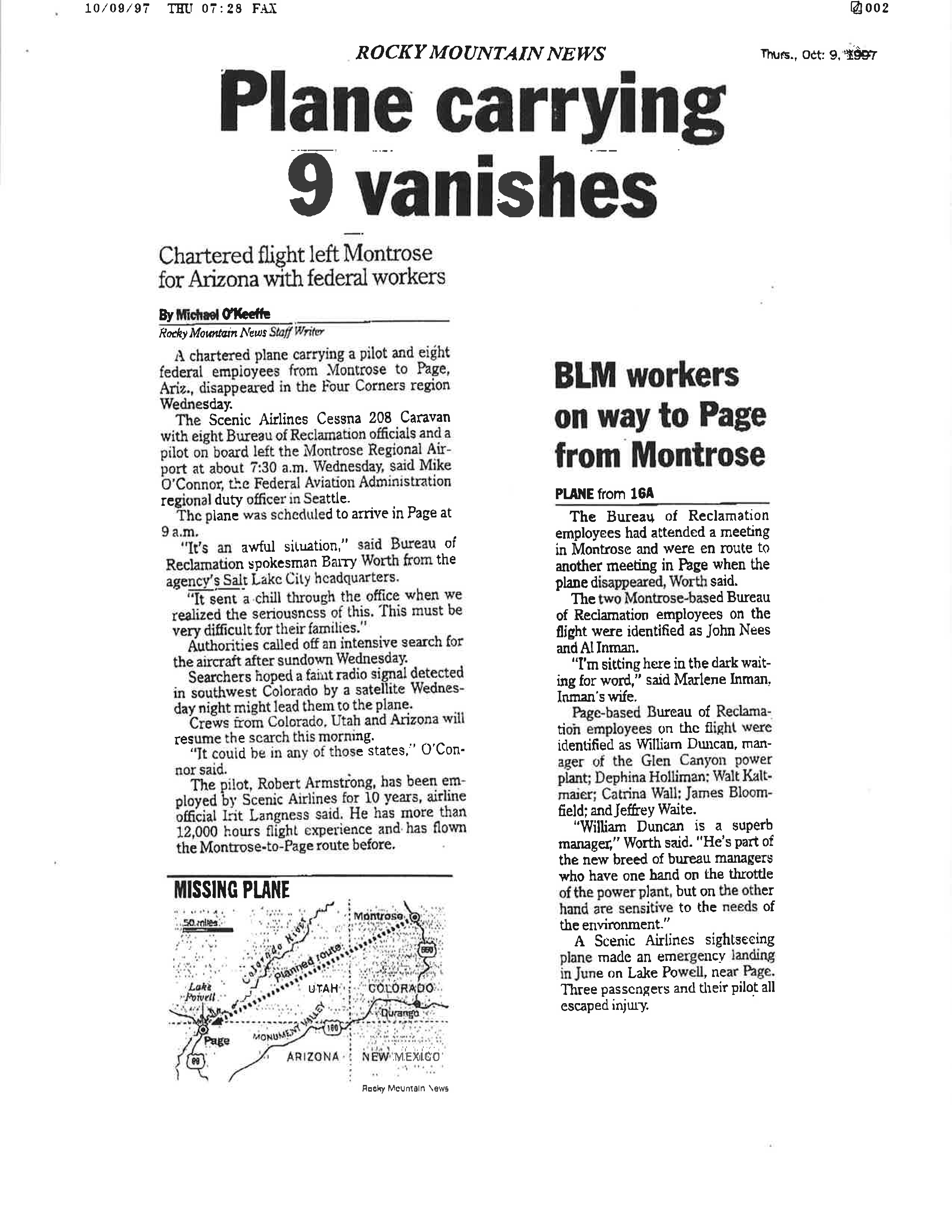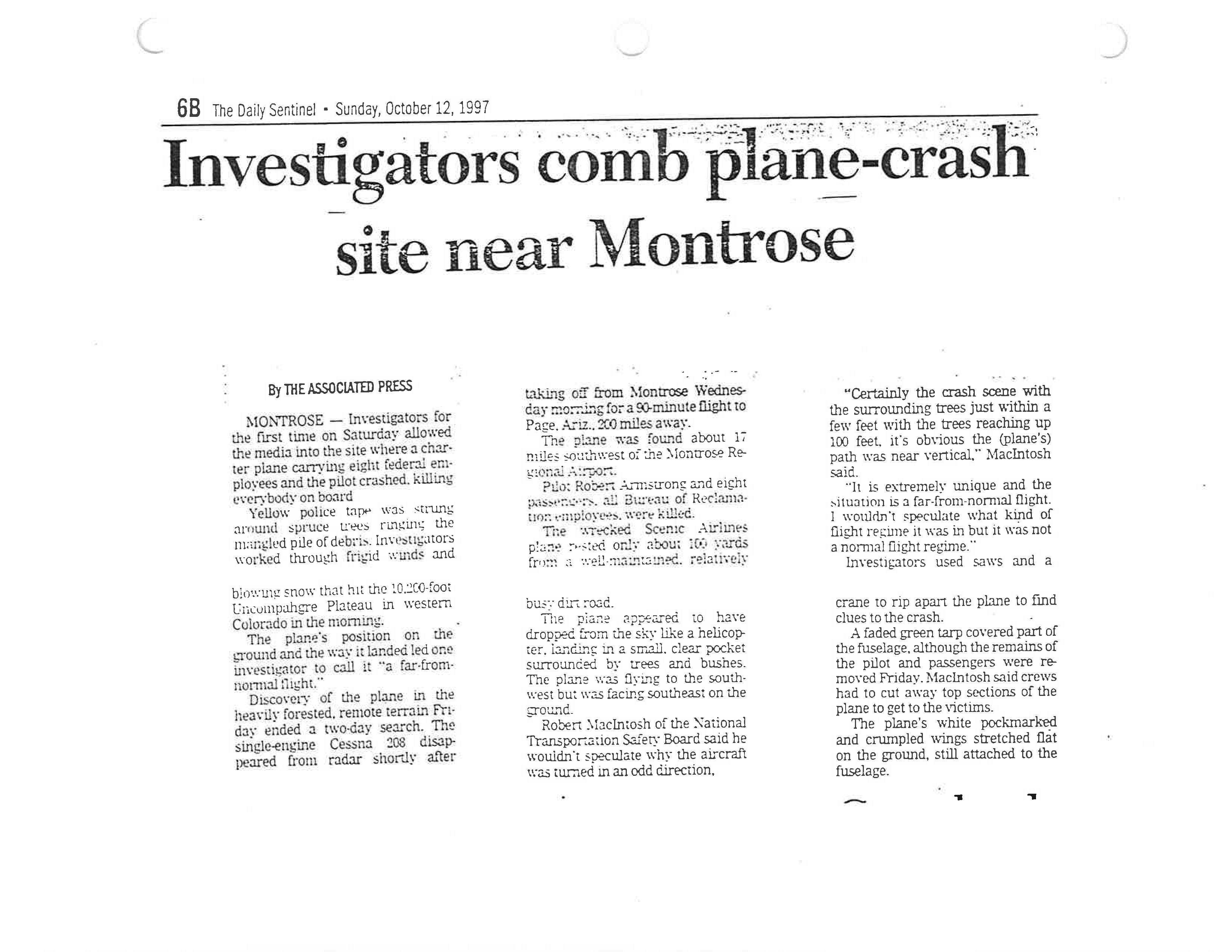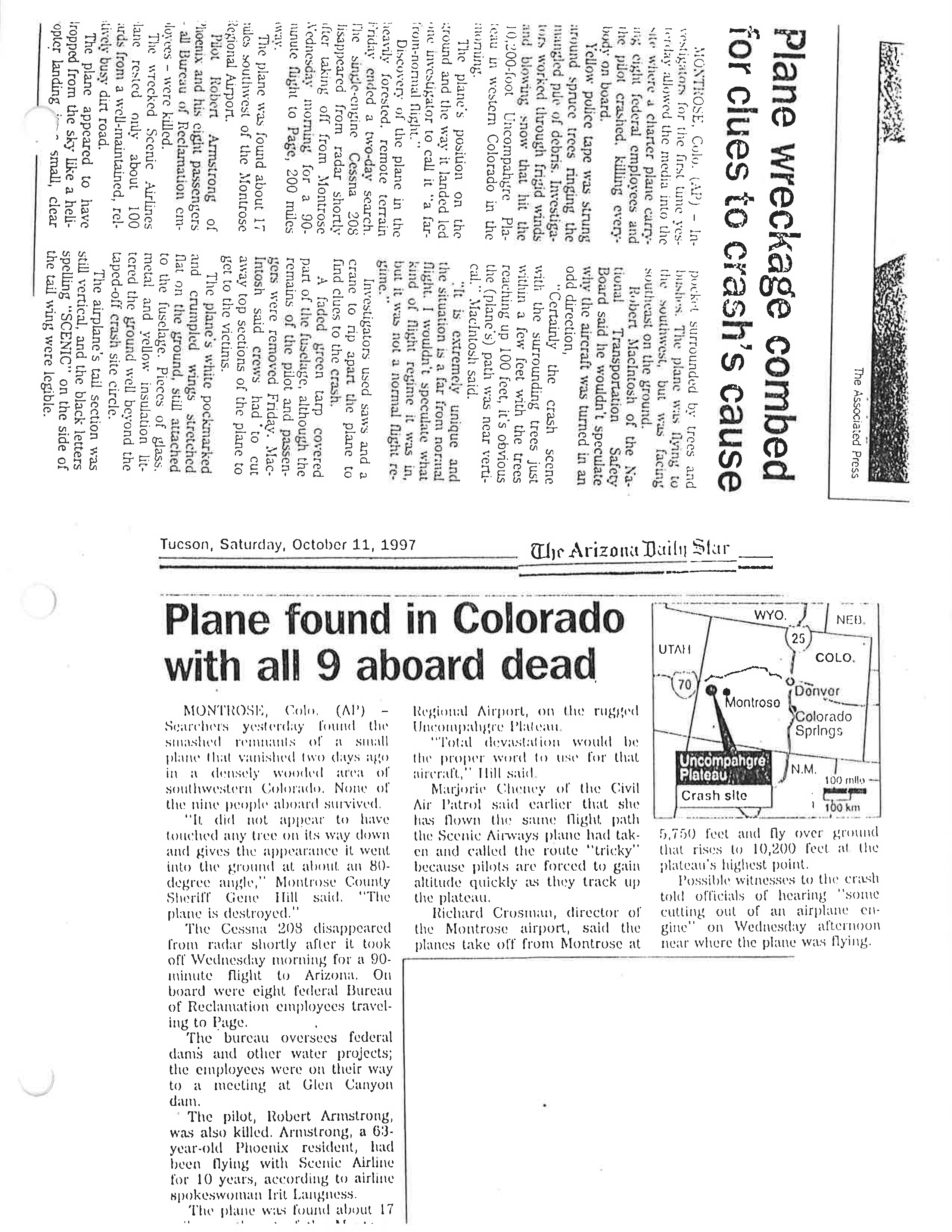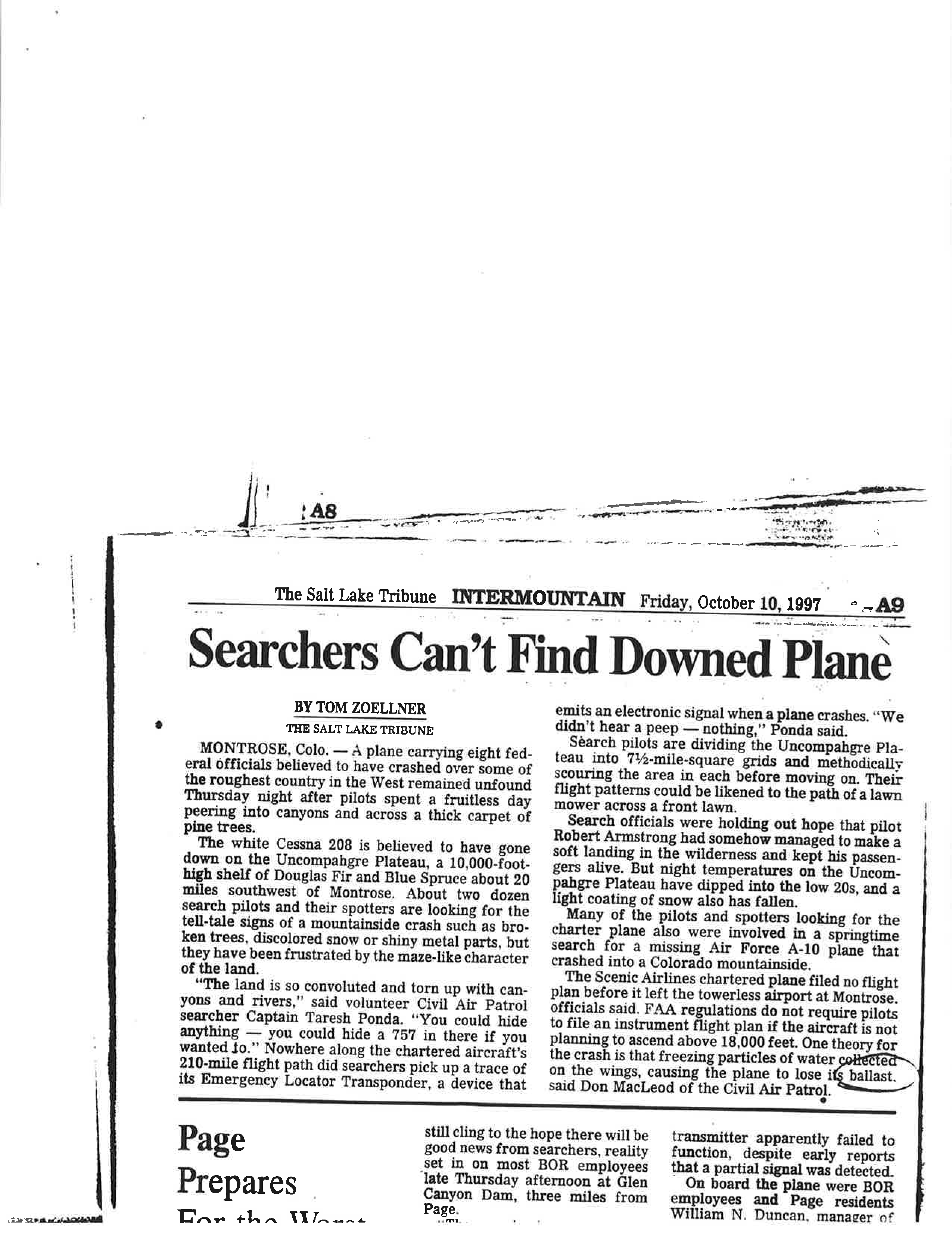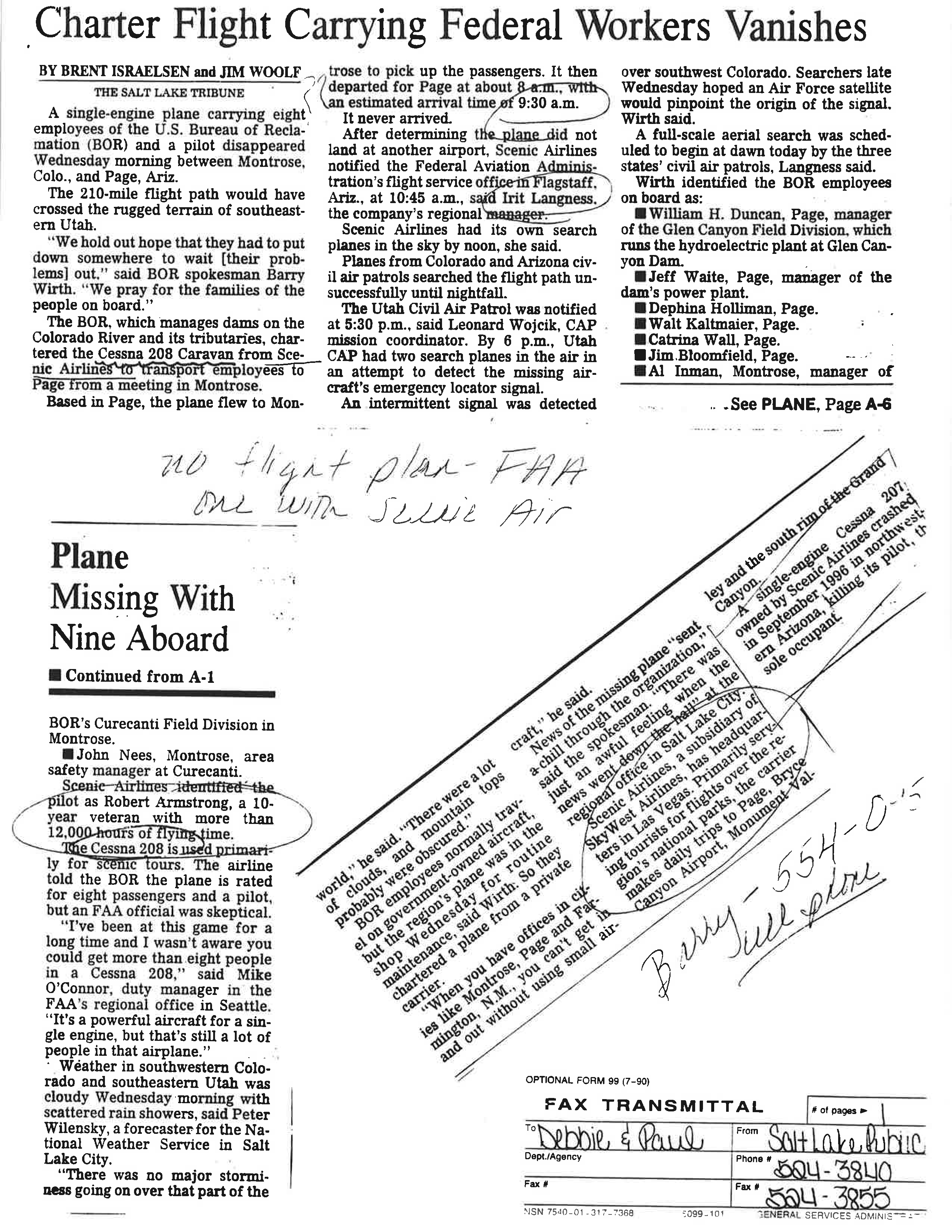 On board from Montrose, Colorado, were Allen E. "Al" Inman Jr., age 47, Curecanti Field Division Manager and Jon E. Nees, age 42, Safety and Occupational Health Manager. The passengers from Page, Arizona, included William H. "Bill" Duncan, age 46, Glen Canyon Field Division Manager; Jeffrey E. "Jeff" Waite, age 41, Powerplant Operations Manager; Dephina D. "Dee" Holliman, age 37, Computer Assistant; Walter A. "Walt" Kaltmaier, age 62, Computer Specialist; Catrina M. Wall, age 33, Computer Specialist; and James L. "Jim" Bloomfield, age 43, Electrical Engineer. The pilot Robert Armstrong, a 63-year-old Phoenix, Arizona, resident, had been flying with Scenic Airlines for 10 years.