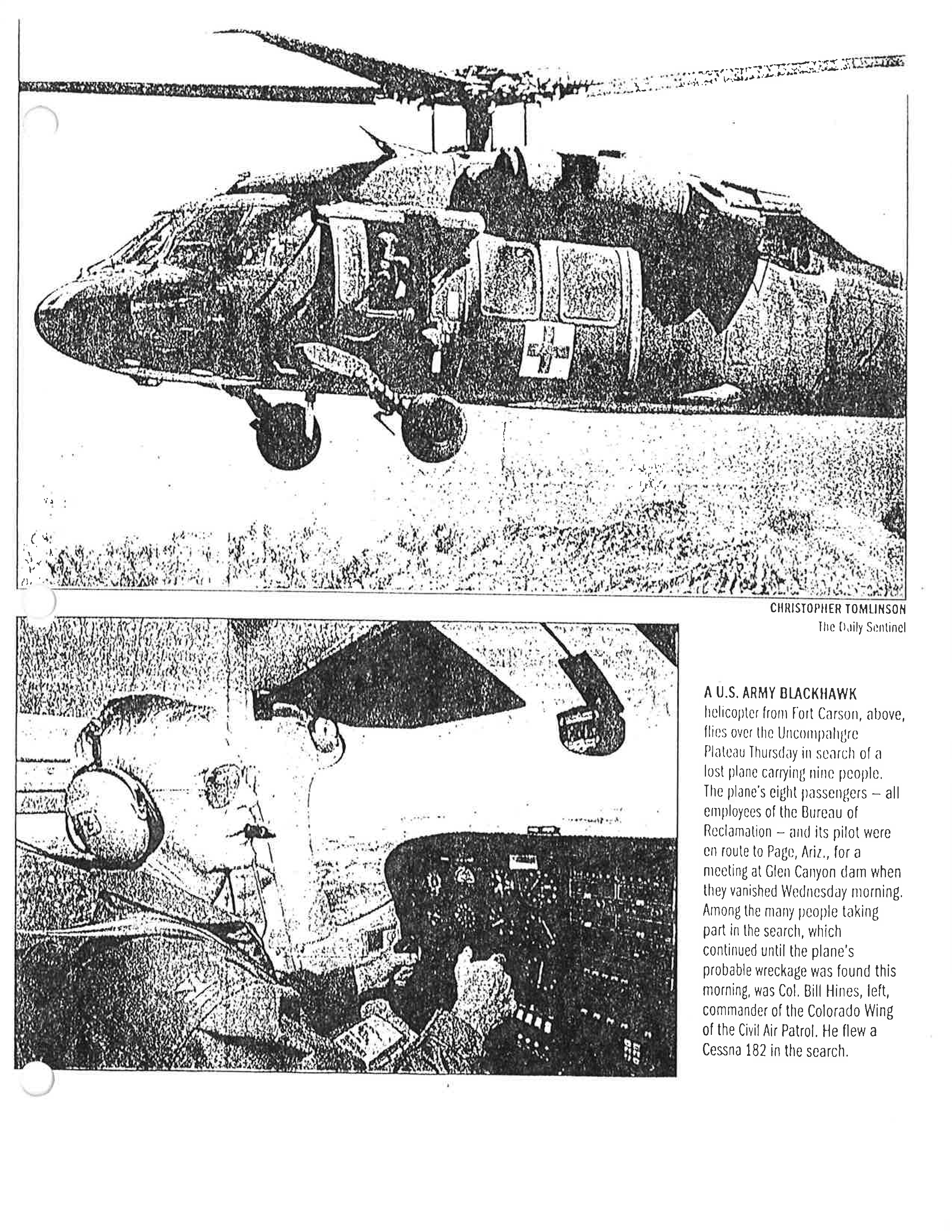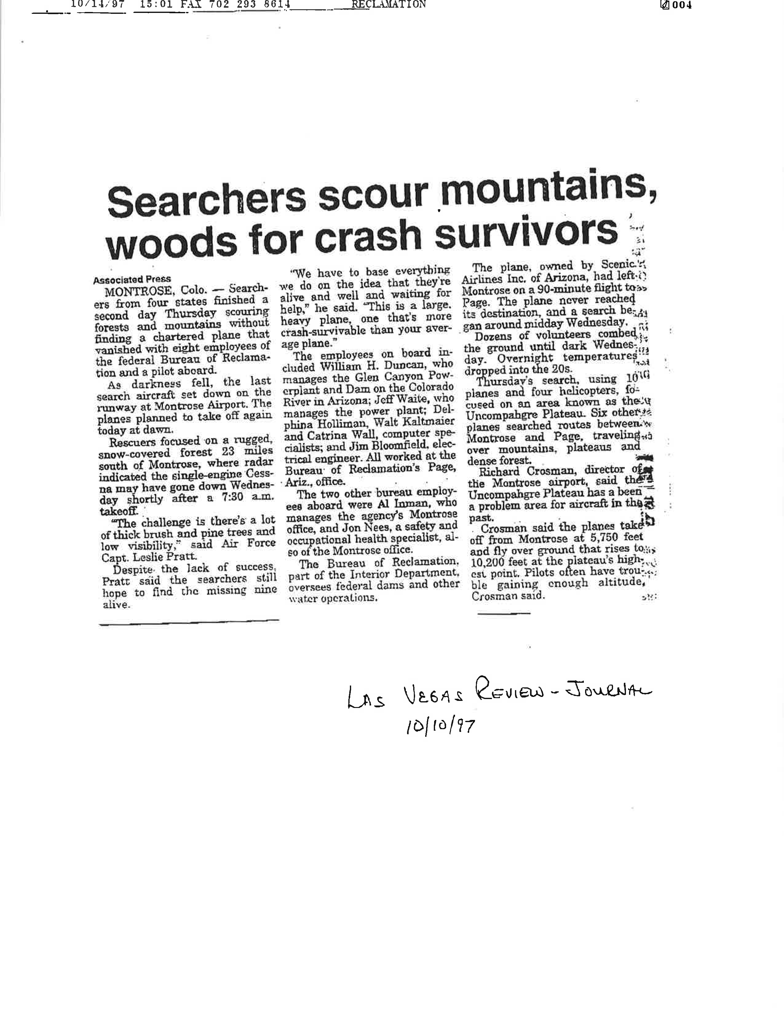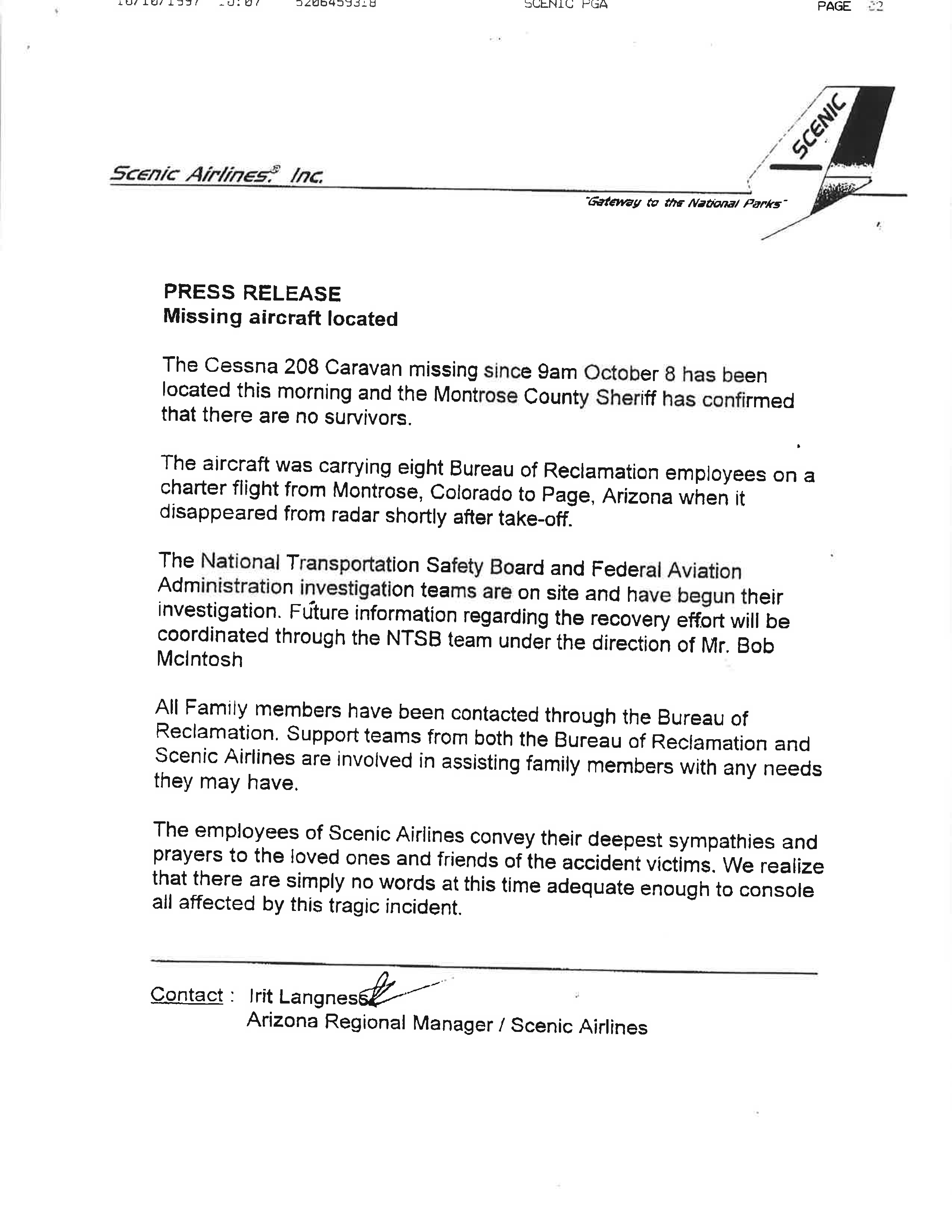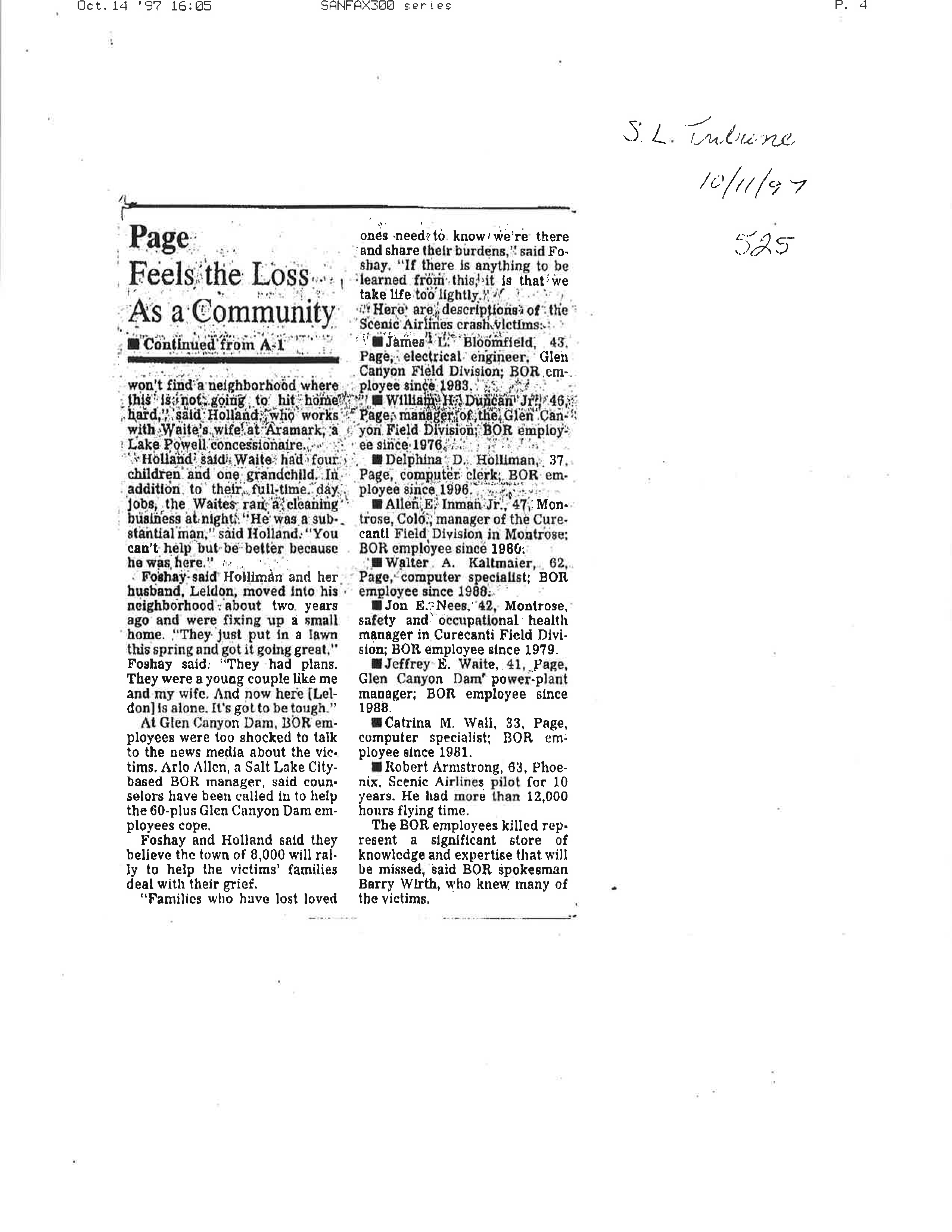 On board from Montrose, Colorado, were Allen E. "Al" Inman Jr., age 47, Curecanti Field Division Manager and Jon E. Nees, age 42, Safety and Occupational Health Manager. The passengers from Page, Arizona, included William H. "Bill" Duncan, age 46, Glen Canyon Field Division Manager; Jeffrey E. "Jeff" Waite, age 41, Powerplant Operations Manager; Dephina D. "Dee" Holliman, age 37, Computer Assistant; Walter A. "Walt" Kaltmaier, age 62, Computer Specialist; Catrina M. Wall, age 33, Computer Specialist; and James L. "Jim" Bloomfield, age 43, Electrical Engineer. The pilot Robert Armstrong, a 63-year-old Phoenix, Arizona, resident, had been flying with Scenic Airlines for 10 years.