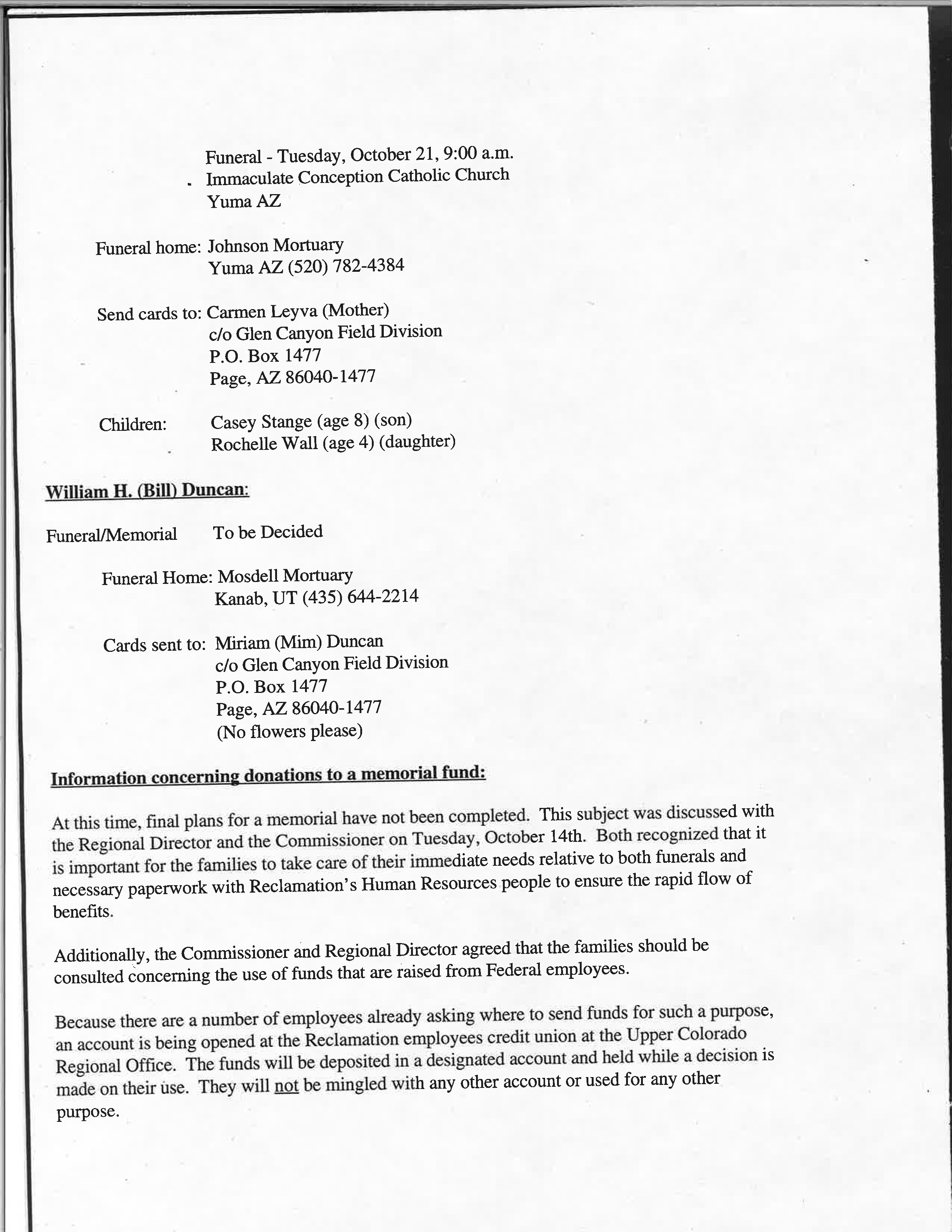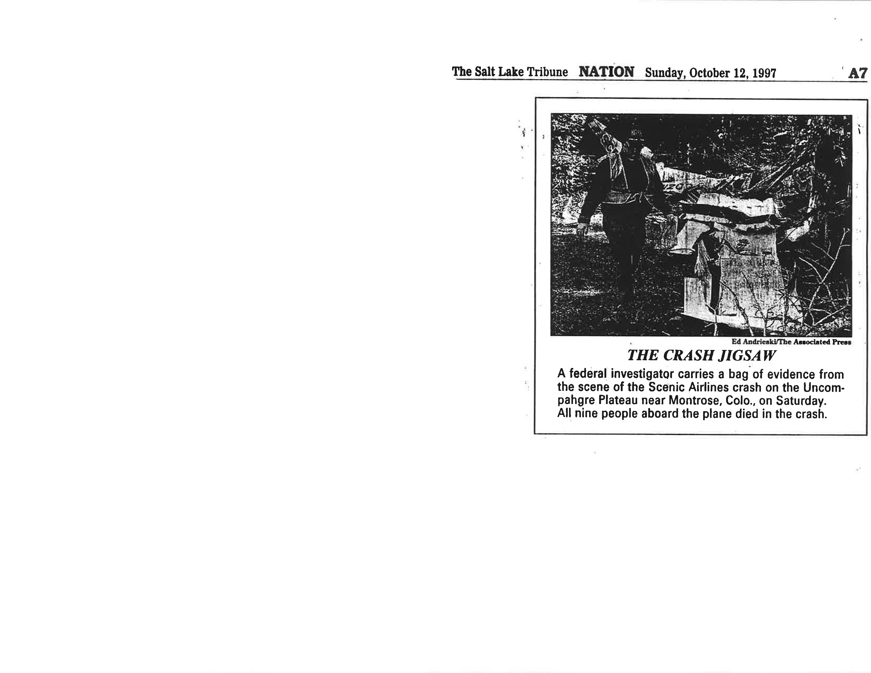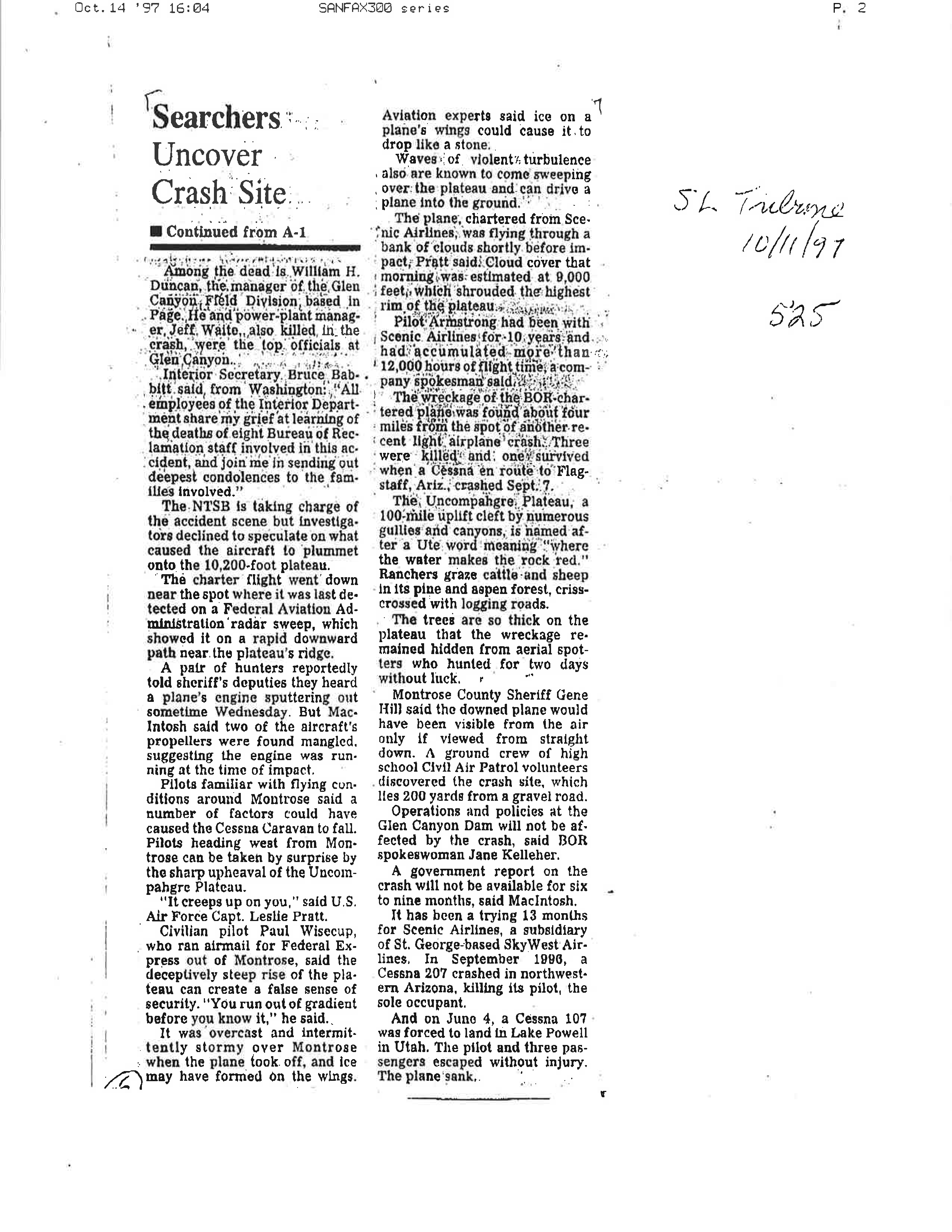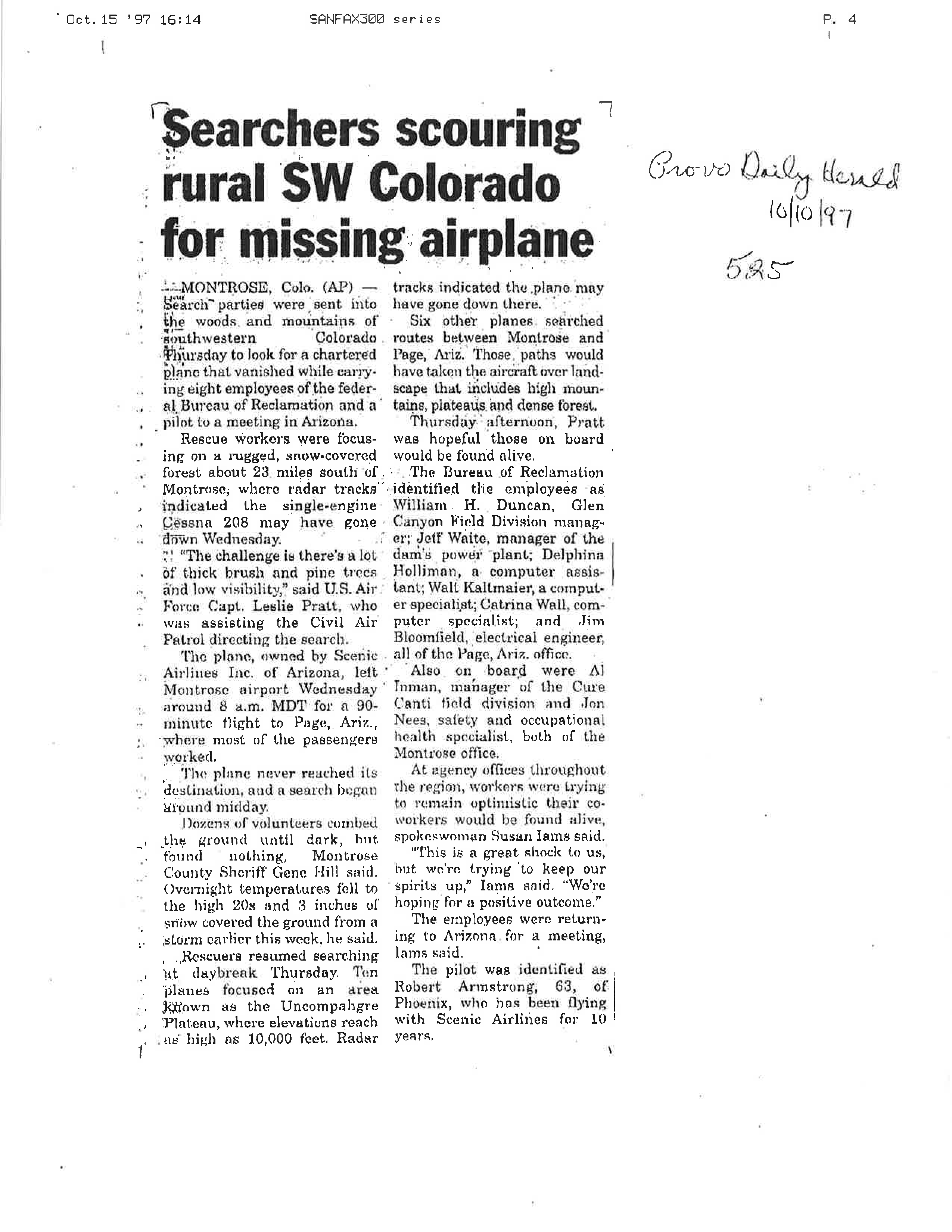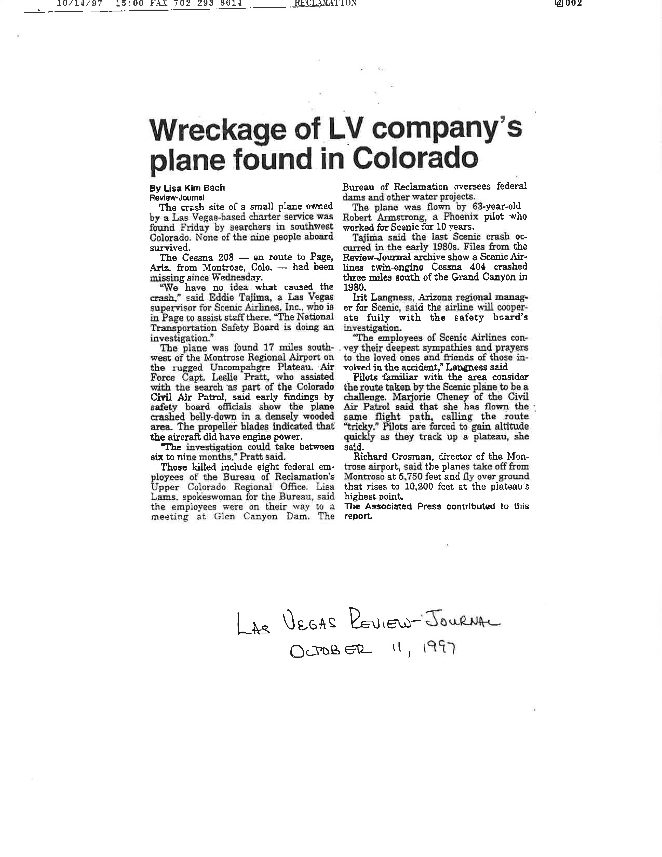 On board from Montrose, Colorado, were Allen E. "Al" Inman Jr., age 47, Curecanti Field Division Manager and Jon E. Nees, age 42, Safety and Occupational Health Manager. The passengers from Page, Arizona, included William H. "Bill" Duncan, age 46, Glen Canyon Field Division Manager; Jeffrey E. "Jeff" Waite, age 41, Powerplant Operations Manager; Dephina D. "Dee" Holliman, age 37, Computer Assistant; Walter A. "Walt" Kaltmaier, age 62, Computer Specialist; Catrina M. Wall, age 33, Computer Specialist; and James L. "Jim" Bloomfield, age 43, Electrical Engineer. The pilot Robert Armstrong, a 63-year-old Phoenix, Arizona, resident, had been flying with Scenic Airlines for 10 years.