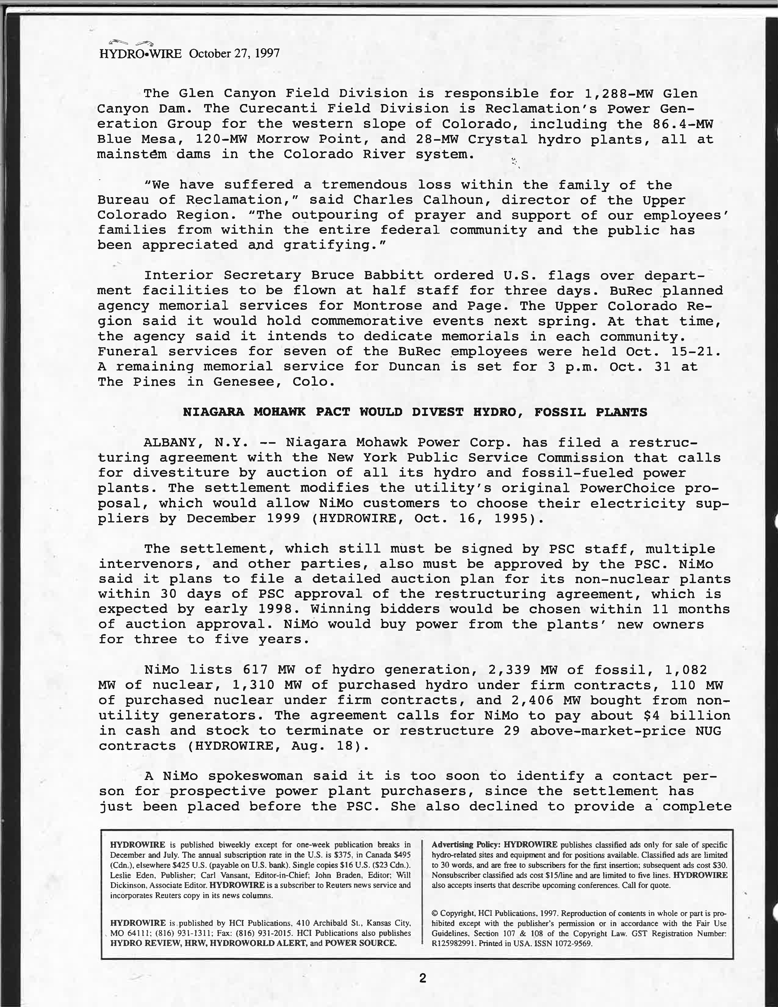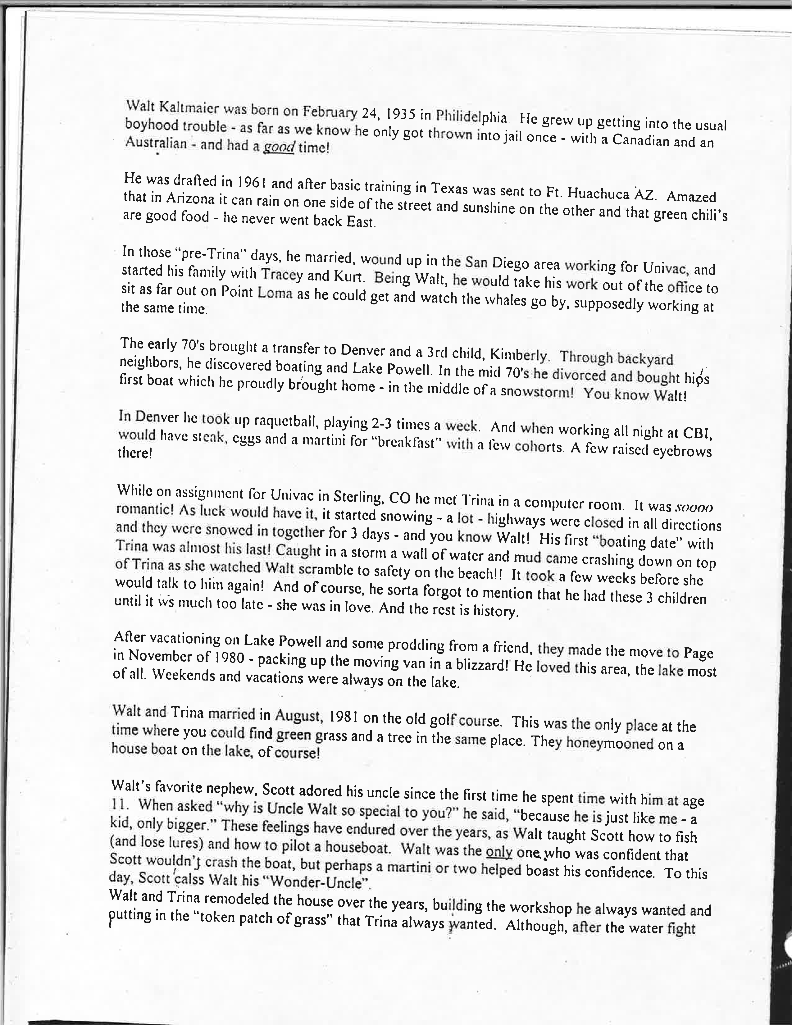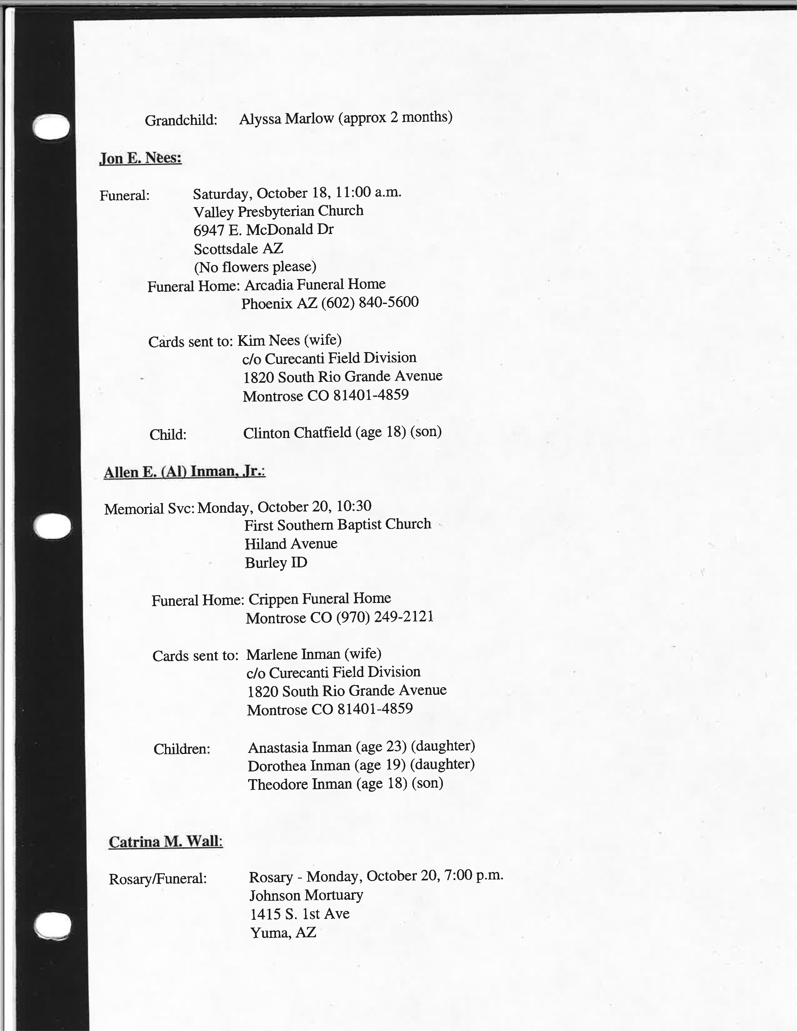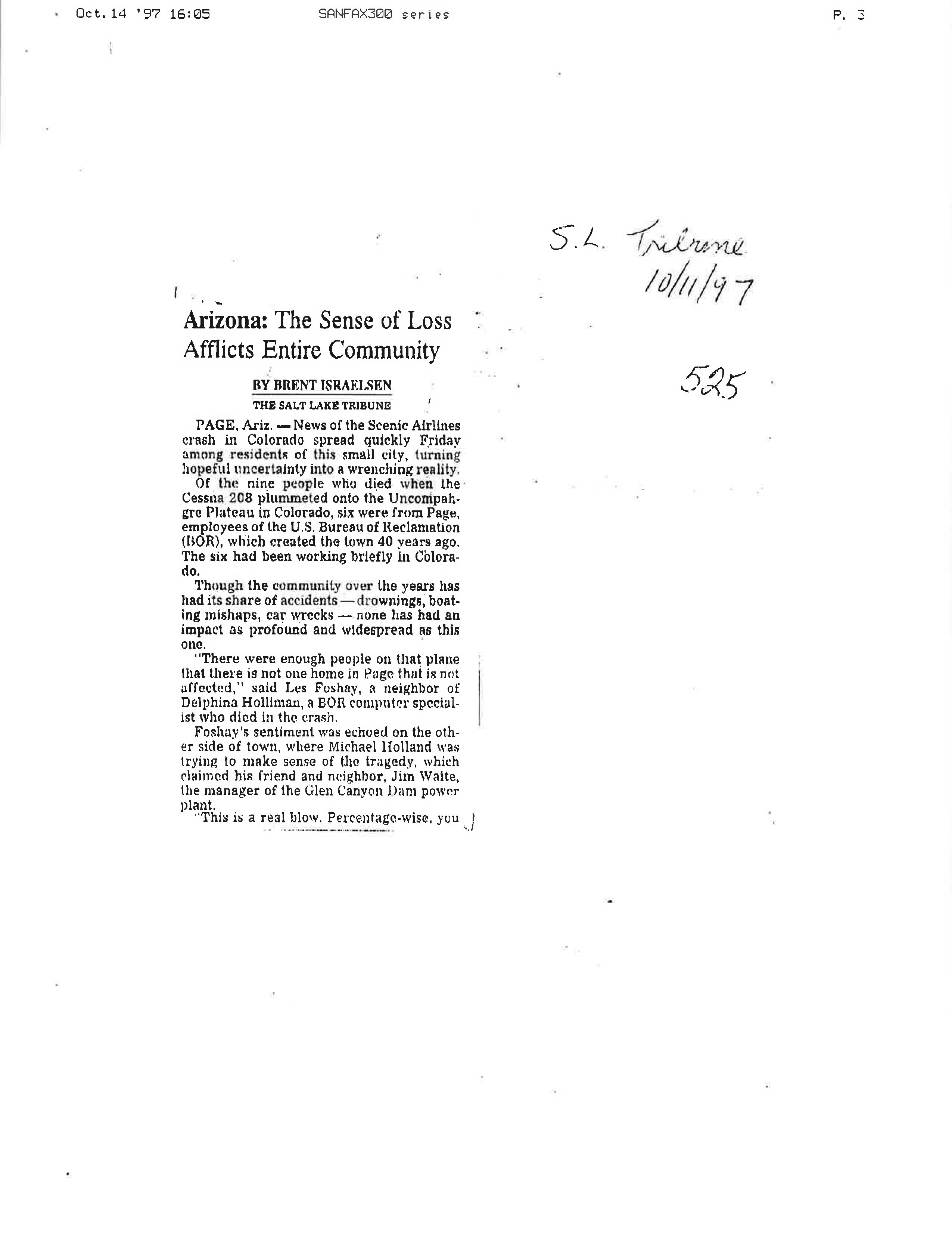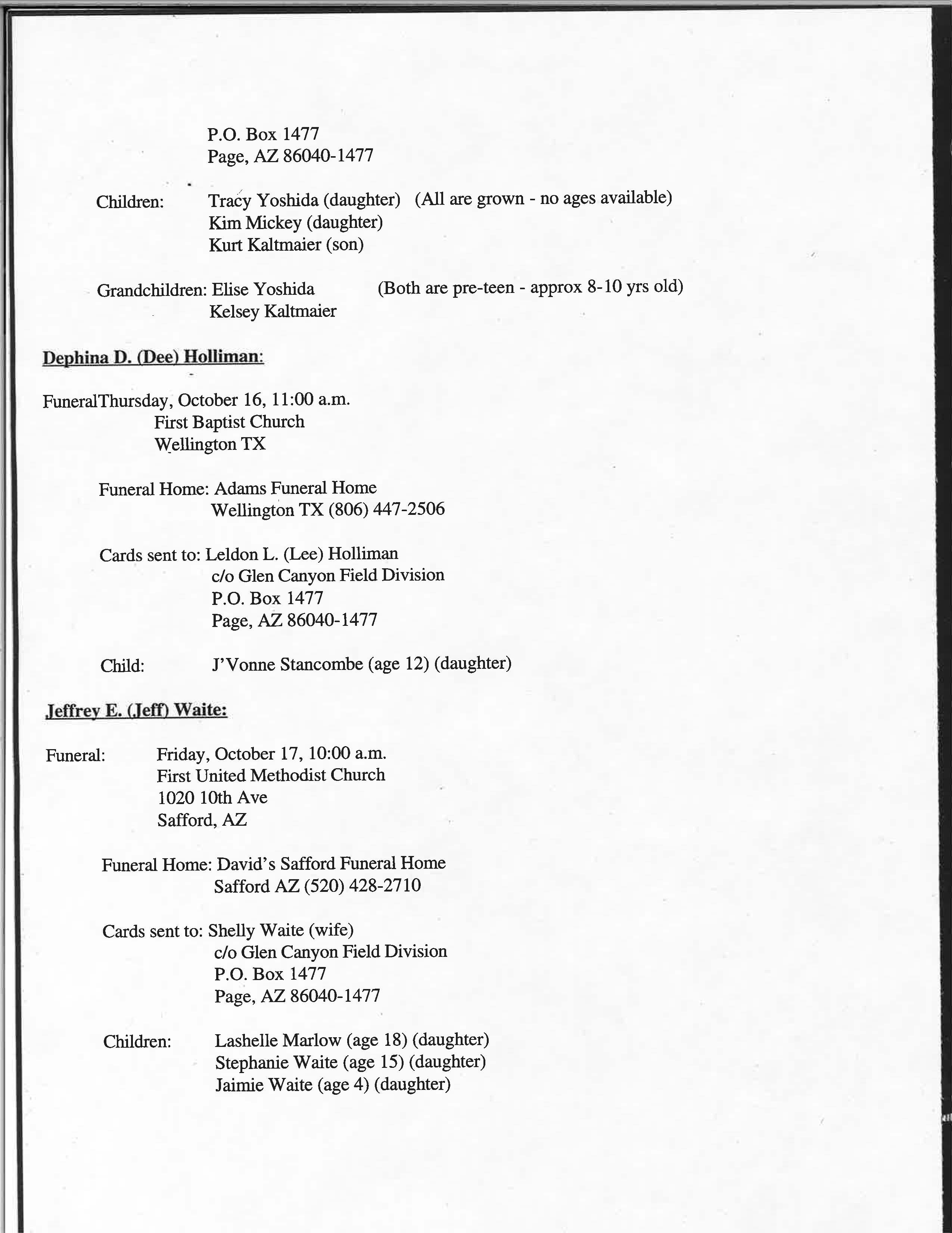 On board from Montrose, Colorado, were Allen E. "Al" Inman Jr., age 47, Curecanti Field Division Manager and Jon E. Nees, age 42, Safety and Occupational Health Manager. The passengers from Page, Arizona, included William H. "Bill" Duncan, age 46, Glen Canyon Field Division Manager; Jeffrey E. "Jeff" Waite, age 41, Powerplant Operations Manager; Dephina D. "Dee" Holliman, age 37, Computer Assistant; Walter A. "Walt" Kaltmaier, age 62, Computer Specialist; Catrina M. Wall, age 33, Computer Specialist; and James L. "Jim" Bloomfield, age 43, Electrical Engineer. The pilot Robert Armstrong, a 63-year-old Phoenix, Arizona, resident, had been flying with Scenic Airlines for 10 years.