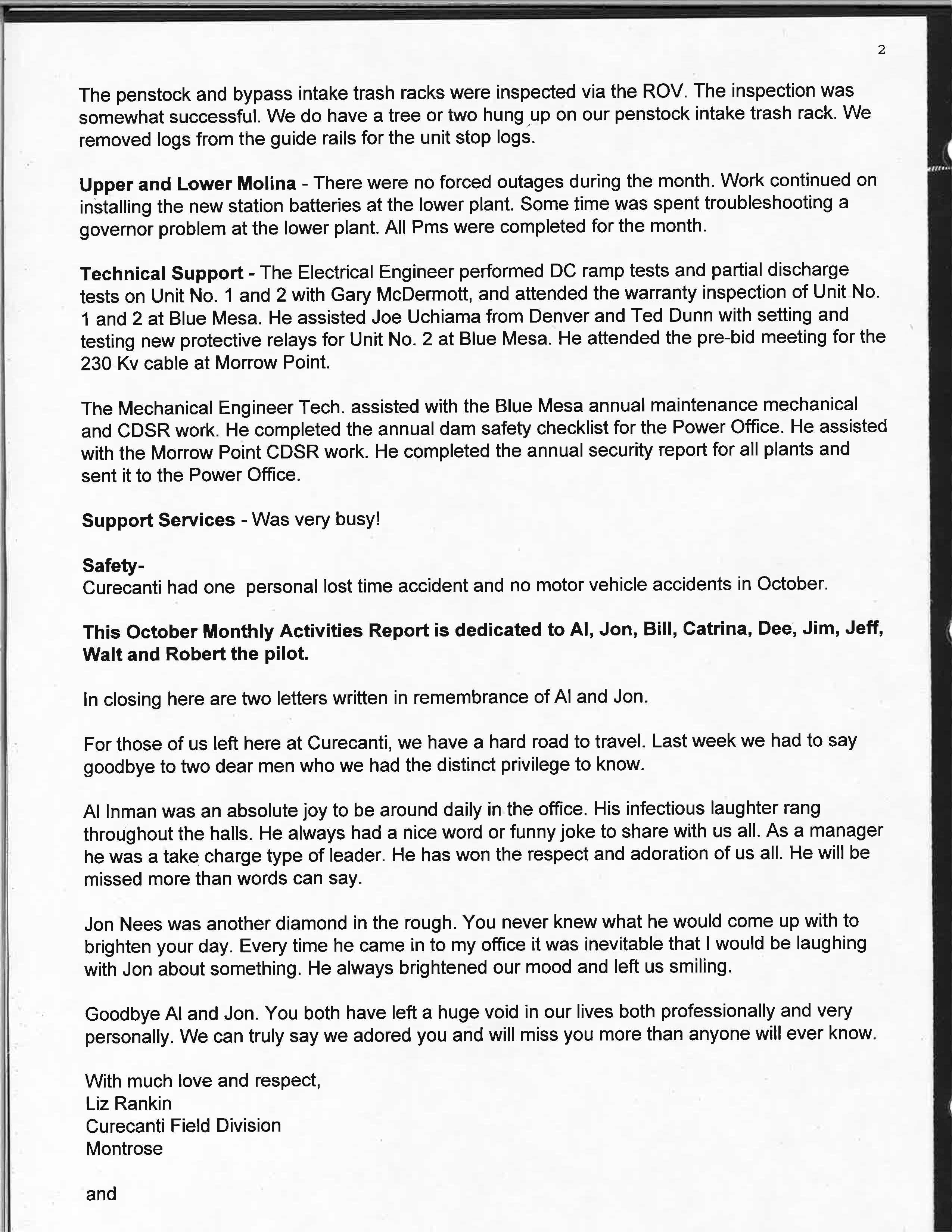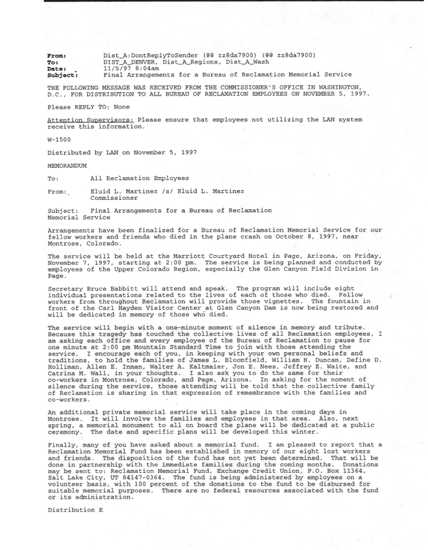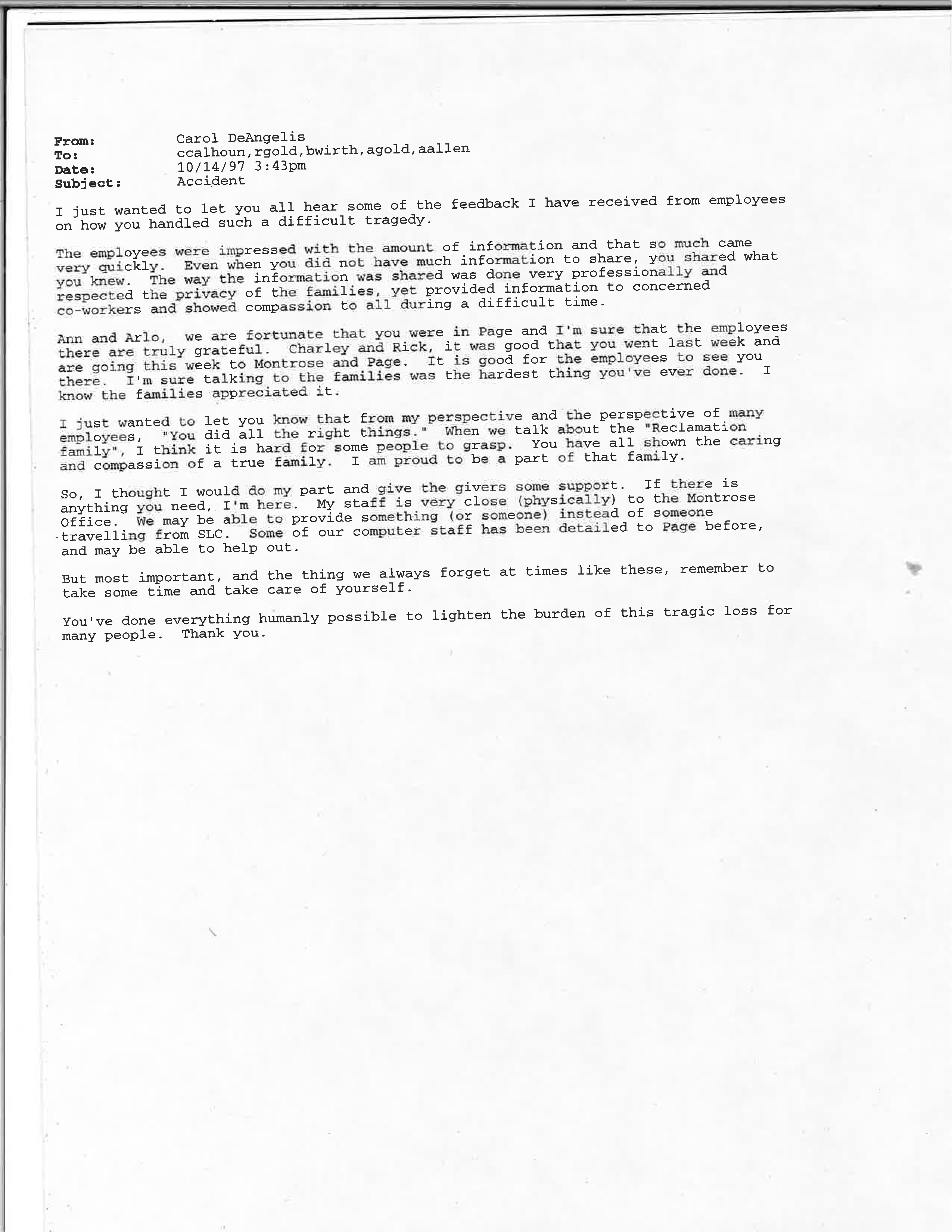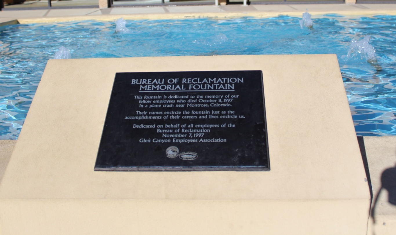In words from Regional Director Wayne Pullan, "It is hard to believe that 25 years have already passed since the tragedy of October 8, 1997. With each passing year, the number of us in the region who knew and worked with those who died diminishes. To those who suffered personal loss on that day, all of your region colleagues express our collective sympathy. And for all today's regional employees who bear the legacy of those we lost, how do we best honor them? One way would be to make certain that we visit the monument and the fountain erected in their honor whenever we visit the Curecanti Field Office and Glen Canyon Dam. Another way to honor them is to perform the work that we get to do every day with excellence and enthusiasm — building upon the foundation they established for us. Finally, let's remember to embrace the friendships and comradery of our workforce today, acknowledging the great gift it is to be able to do such work together."