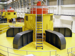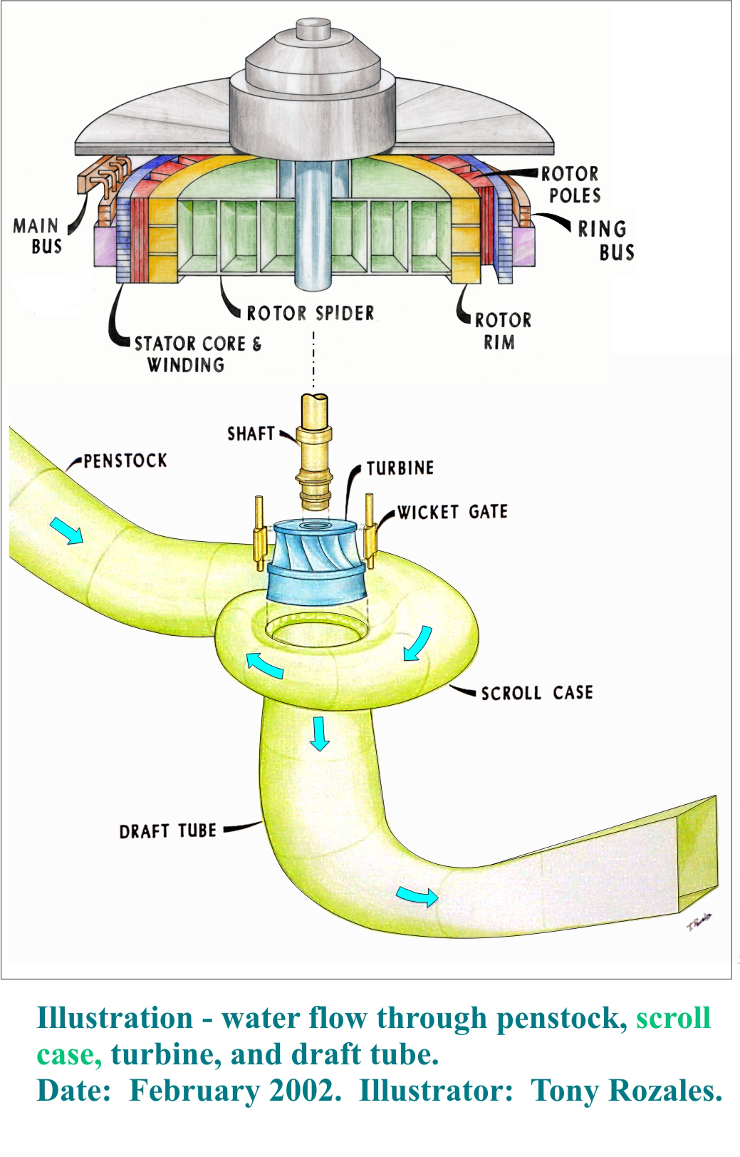 Another generator part is called a stator. The stator encompasses the rotor, is made of steel with many coils of small copper wire inside and is placed close to the rotor. The energy produced by the water pressure turning the turbine and rotor, combined with the strong electromagnets, creates voltage across the stator coils which are connected in patterns that allow the voltage to be controlled. By changing the strength of the magnets on the rotor and the amount of the water flowing in the penstock, the amount of electricity being generated can be regulated.