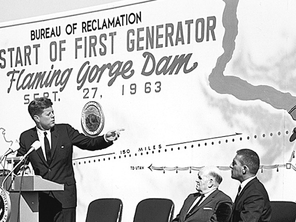 On December 10, 1962, the waters of the Green River began filling the reservoir behind Flaming Gorge Dam and nearly a year later on September 27, 1963, President John F. Kennedy initiated the first power generation at Flaming Gorge Powerplant. The dam was dedicated on August 17, 1964, by former First Lady, Claudia “Lady Bird” Johnson.
