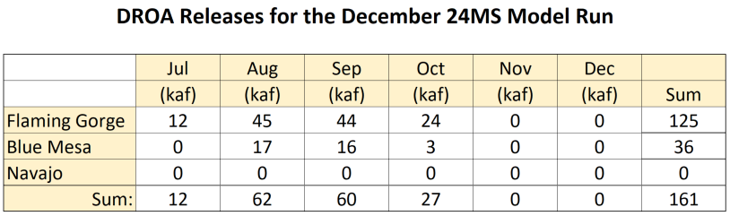 Consistent with the Upper Basin Drought Response Operations Agreement (DROA) provisions to protect a target elevation at Lake Powell of 3,525 feet, this November 2021 24-Month Study includes releases from the upstream initial units of the Colorado River Storage Project Act to deliver an additional 181 thousand acre-feet (kaf) to Lake Powell by the end of December 2021. The additional releases began in July and will continue to be implemented through December 2021. The table below contains the observed DROA releases and additional planned releases:
