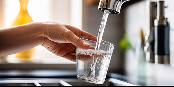 Water pouring from a faucet into a glass. Not in public domain - licensed from Adobe.
